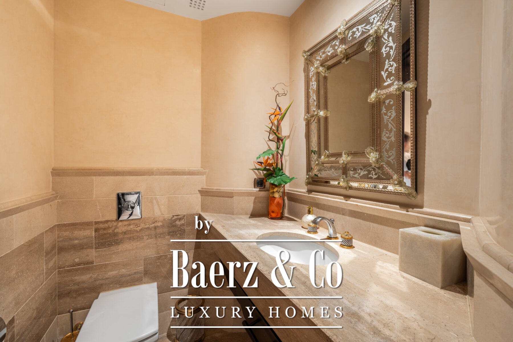 The apartment’s core comprises three bedrooms, each with en-suite bathroom. The primary suite combines a dedicated walk-in closet and a private terrace, offering breathtaking sea views. Two additional guest toilets provide further convenience for both residents and visitors.