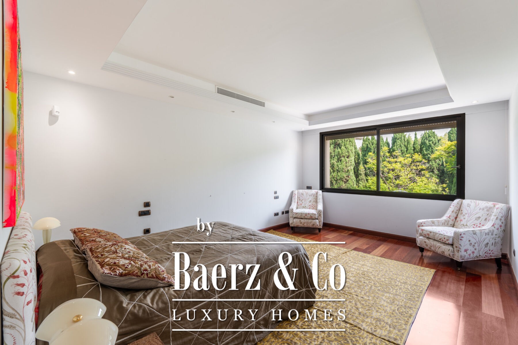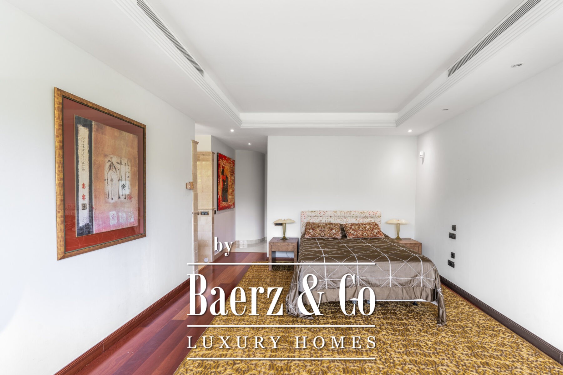 The main living space is generous, inviting both quiet retreat and effortless entertaining. Wide sliding doors extend the living area onto covered and open terraces, allowing a seamless transition between interior comfort and the expansive outdoors. A fully fitted kitchen, paired with a secondary service entrance and potential for a discreet dirty kitchen, is designed for those who value both function and form.