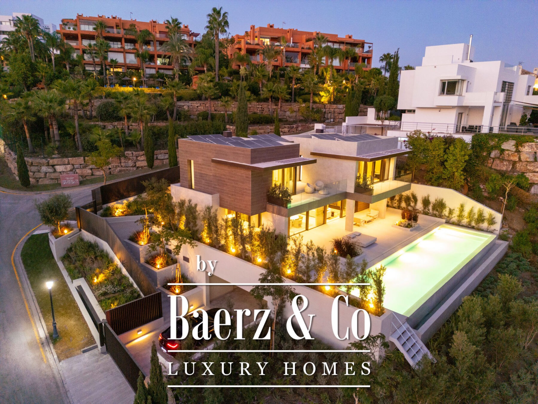 Villa Marbella in Los Flamingos is an architectural sanctuary set within a coveted gated community, embracing 540 m² of refined living space on a 1,330 m² plot. This villa Marbella in Los Flamingos welcomes you with five spacious bedrooms and five bathrooms, balancing sophisticated comfort with a sense of ease. Clean modern lines echo throughout, from the Modulnova kitchen to the polished concrete staircase and expansive Schüco windows, opening interiors to the Andalusian light.