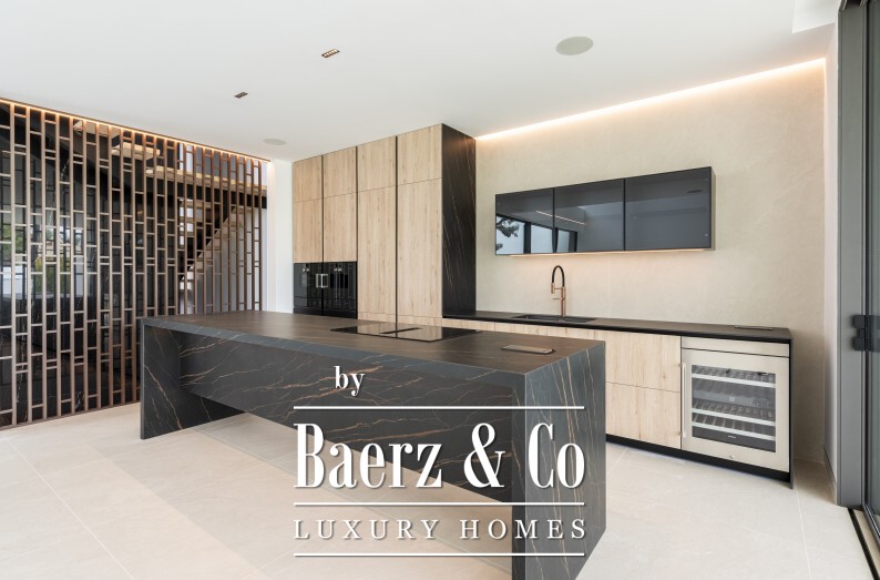 The property’s four distinctive levels are interconnected by an elegant staircase. The open-plan living and dining areas flow seamlessly to a sunlit terrace, ideal for gatherings and enjoying the pace of Marbella’s outdoor living. A Gaggenau-fitted kitchen and custom cabinetry underscore the home’s focus on aesthetics and daily ease.