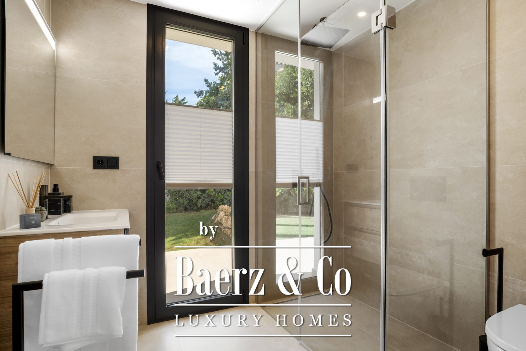 On the rooftop terrace, panoramic views of the sea and mountains invite moments of quiet reflection. Built-in wardrobes include LED illumination, combining practicality with subtle sophistication. The villa offers a garage for one car with a charging point, and additional enclosed parking for up to three further vehicles within the gate.