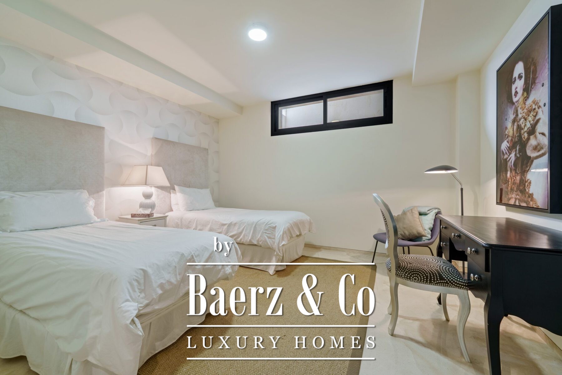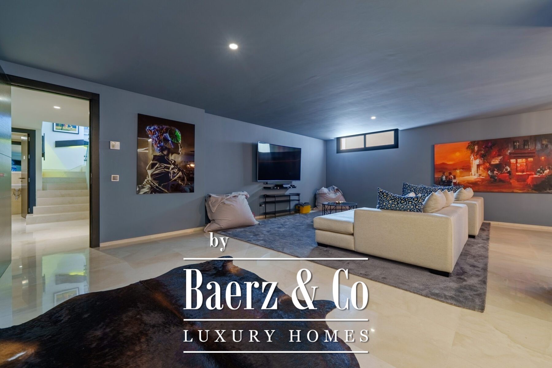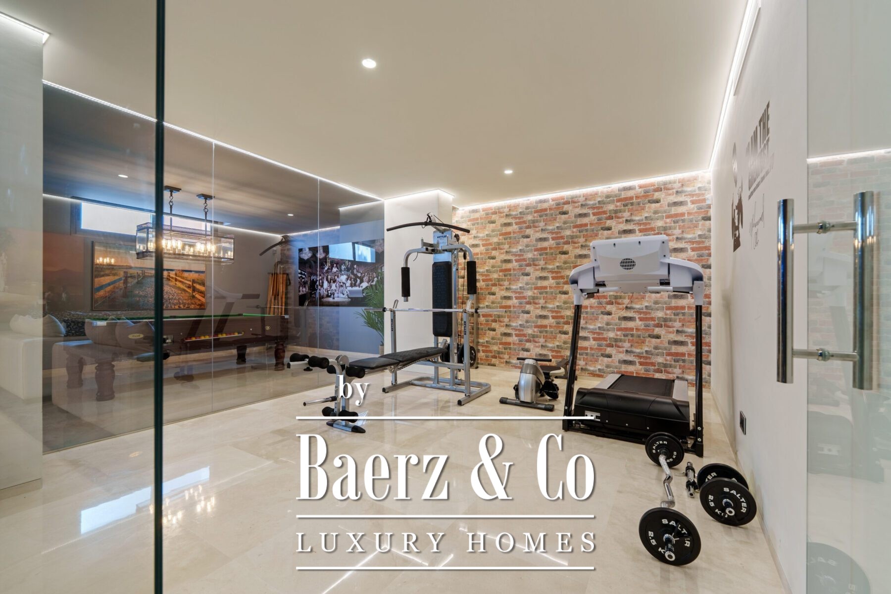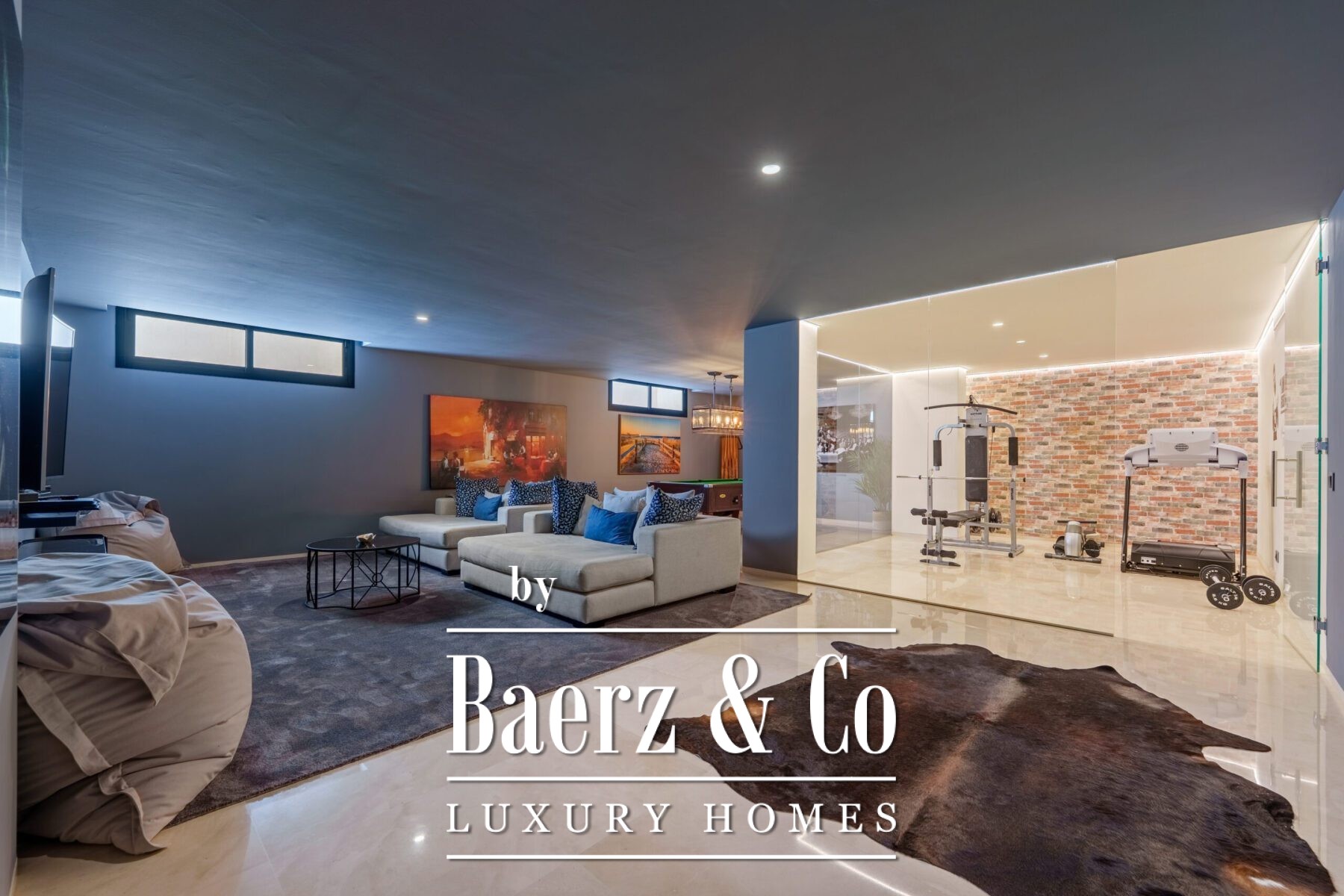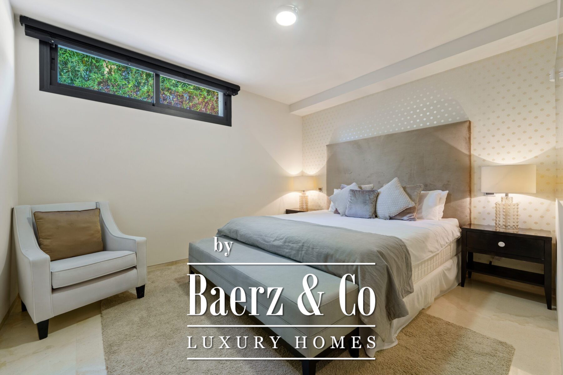 For leisure, a private heated swimming pool, jacuzzi, gym, and cinema room set the scene for relaxation and entertainment. Expansive terraces open onto a secluded garden, a barbecue area, and generous covered spaces for seasonal gatherings. The secure garage and 24-hour security speak to a lifestyle valuing discretion.