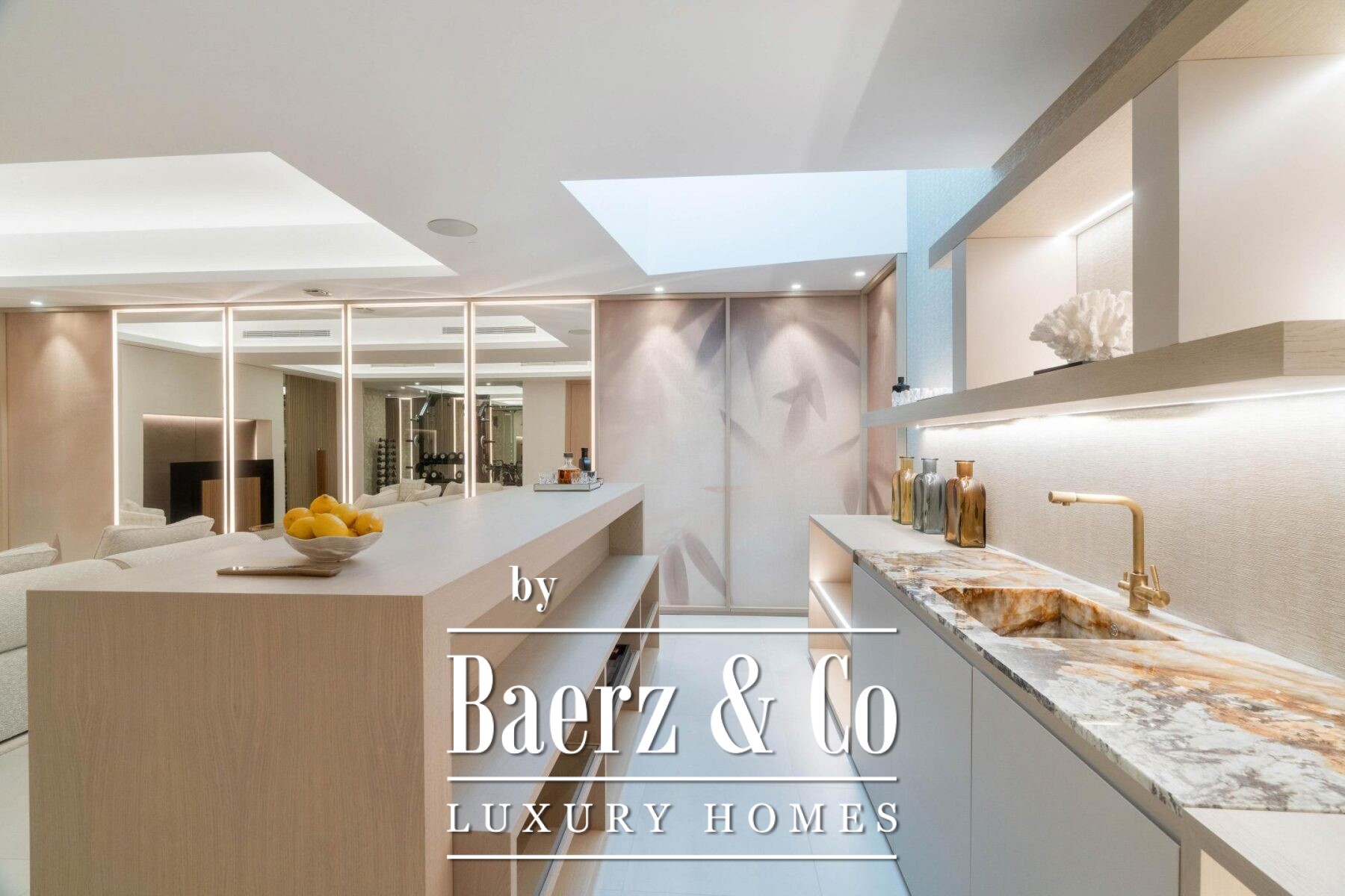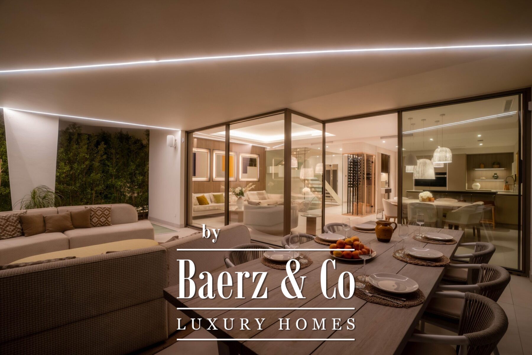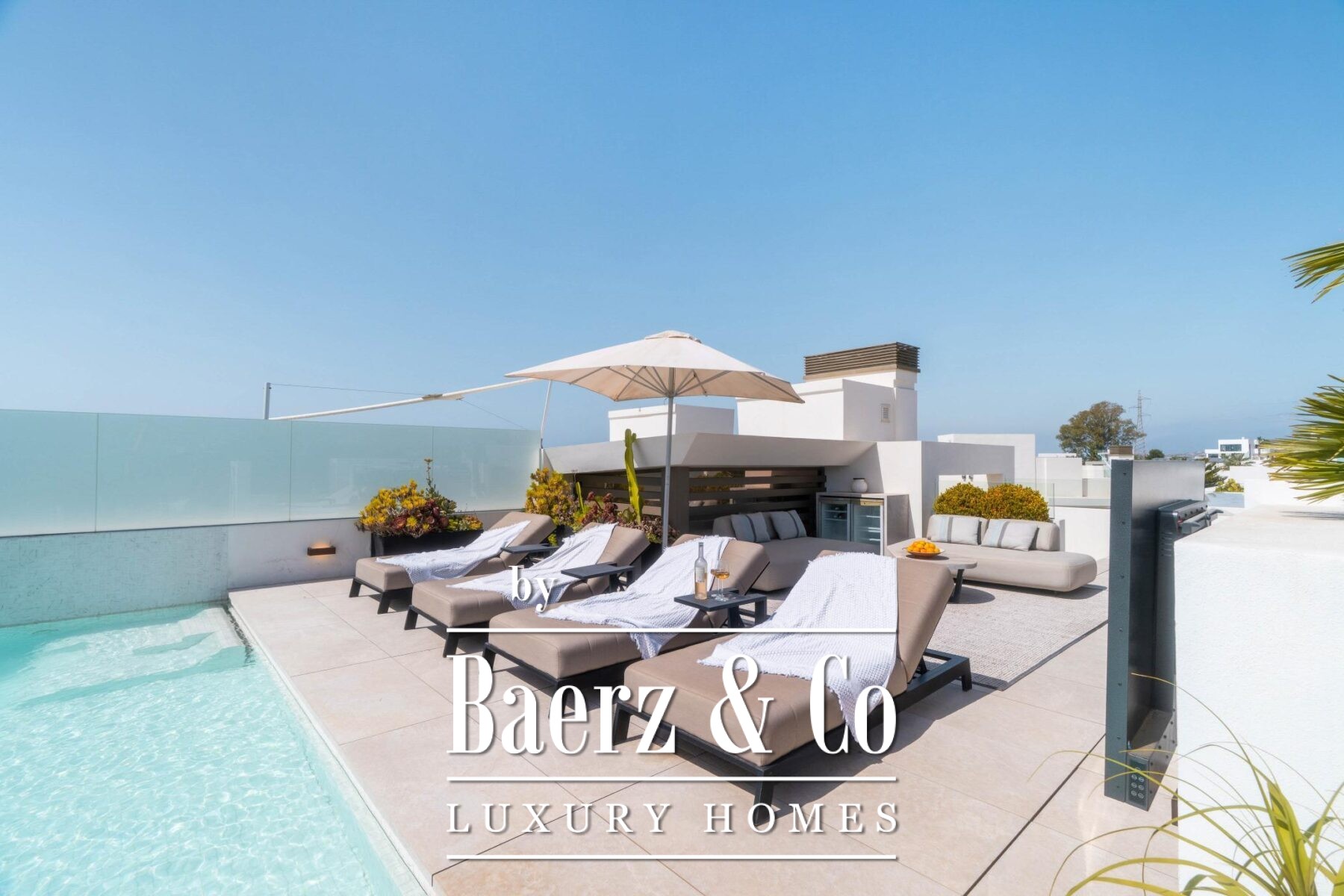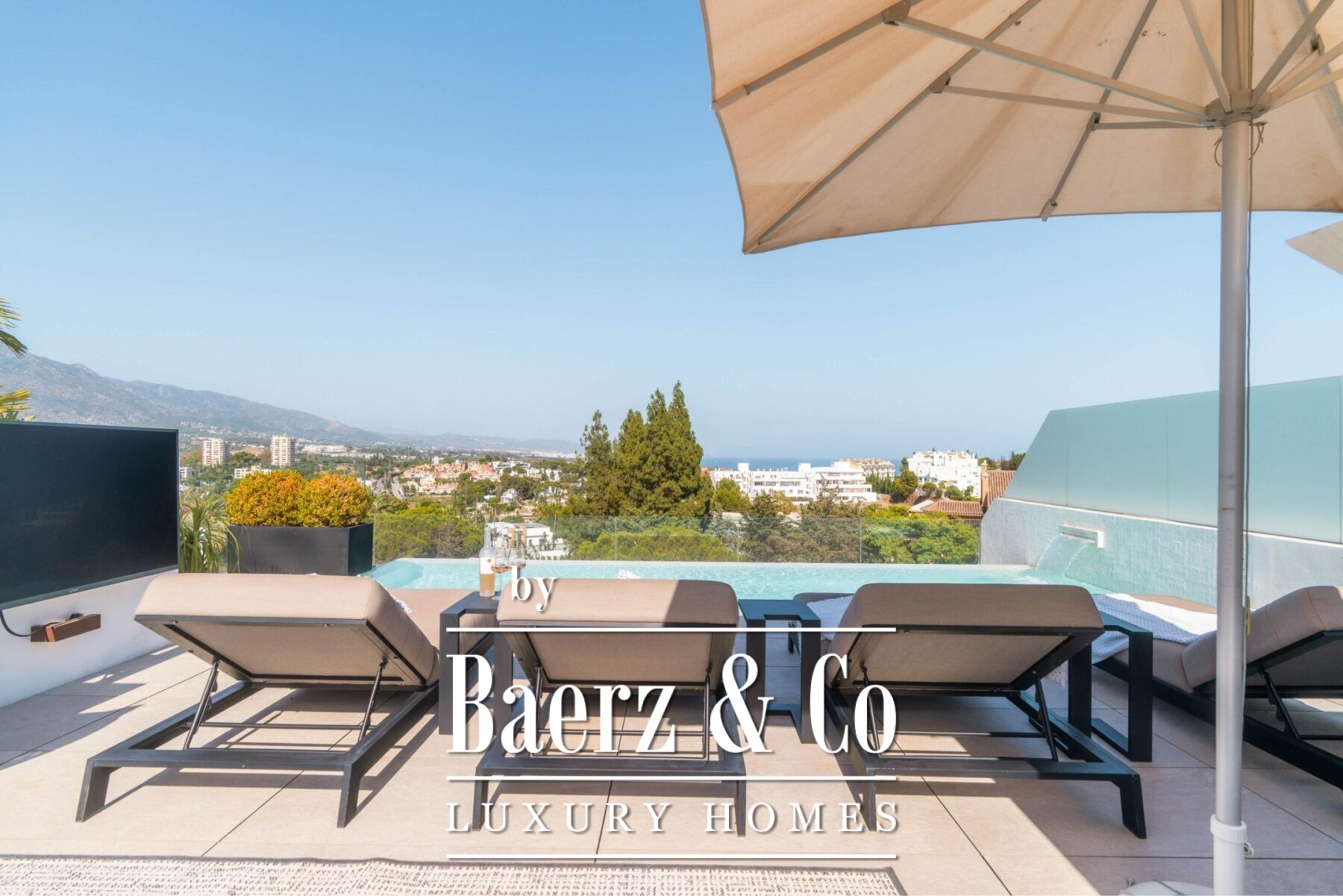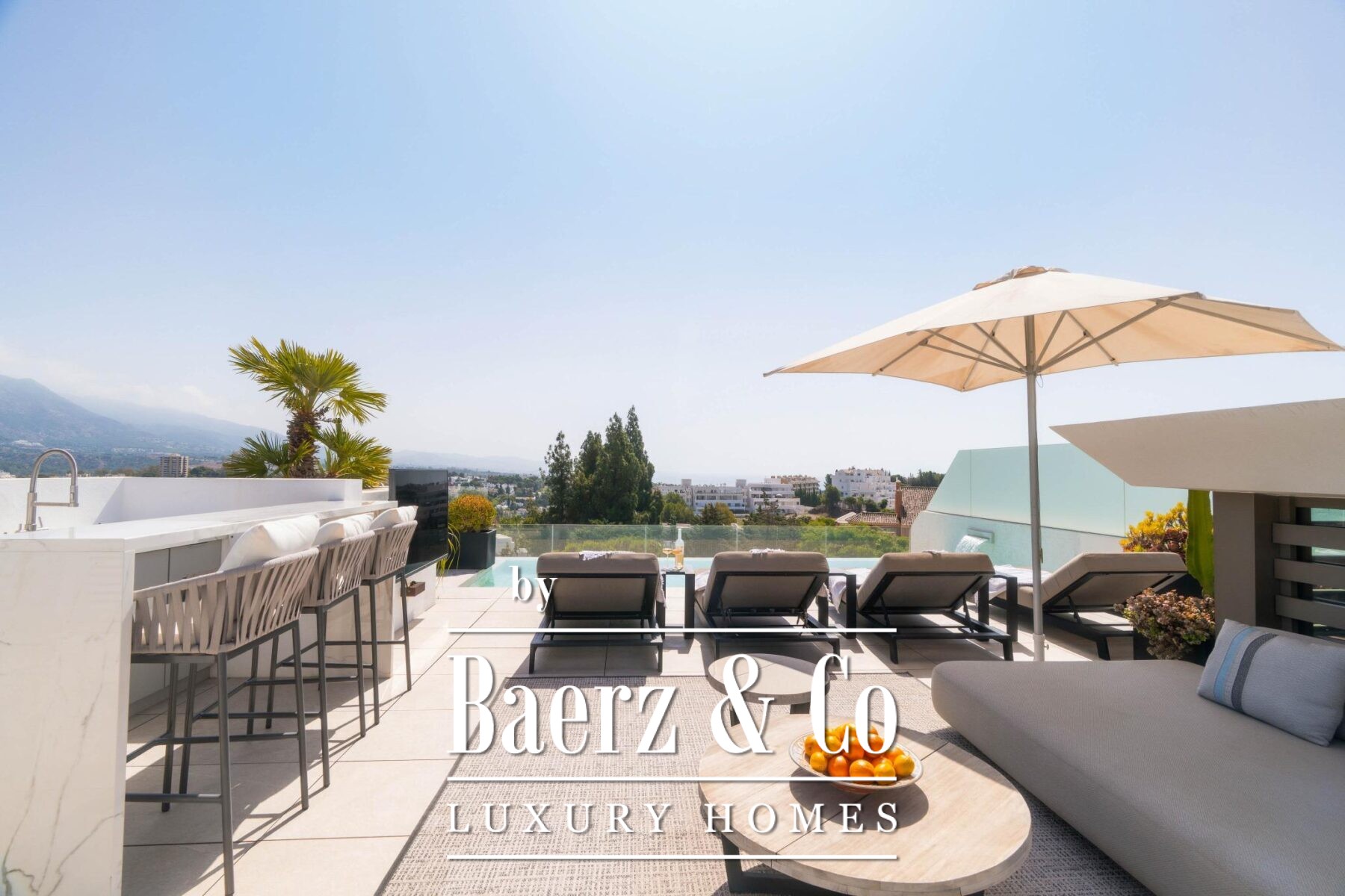 Generous living areas connect to a covered terrace designed for seamless indoor-outdoor living. The custom rooftop solarium, complete with a private plunge pool, opens up panoramic views over the Golf Valley and the iconic La Concha mountain. A private elevator links each of the four levels, allowing effortless access throughout, while the fully equipped Siematic kitchen invites convivial gatherings.
