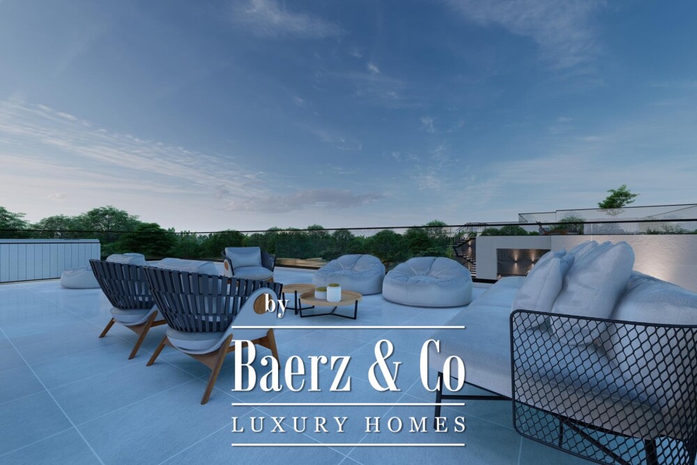The upper floor of this townhouse in Medulin features three additional en-suite bedrooms, each opening to covered terraces with unbroken sea views. These terraces span the façade, inviting the sea’s presence into daily rhythms. The rooftop terrace, measuring 35 m², serves as a private aerie for sunlit days and evenings overlooking the bay.