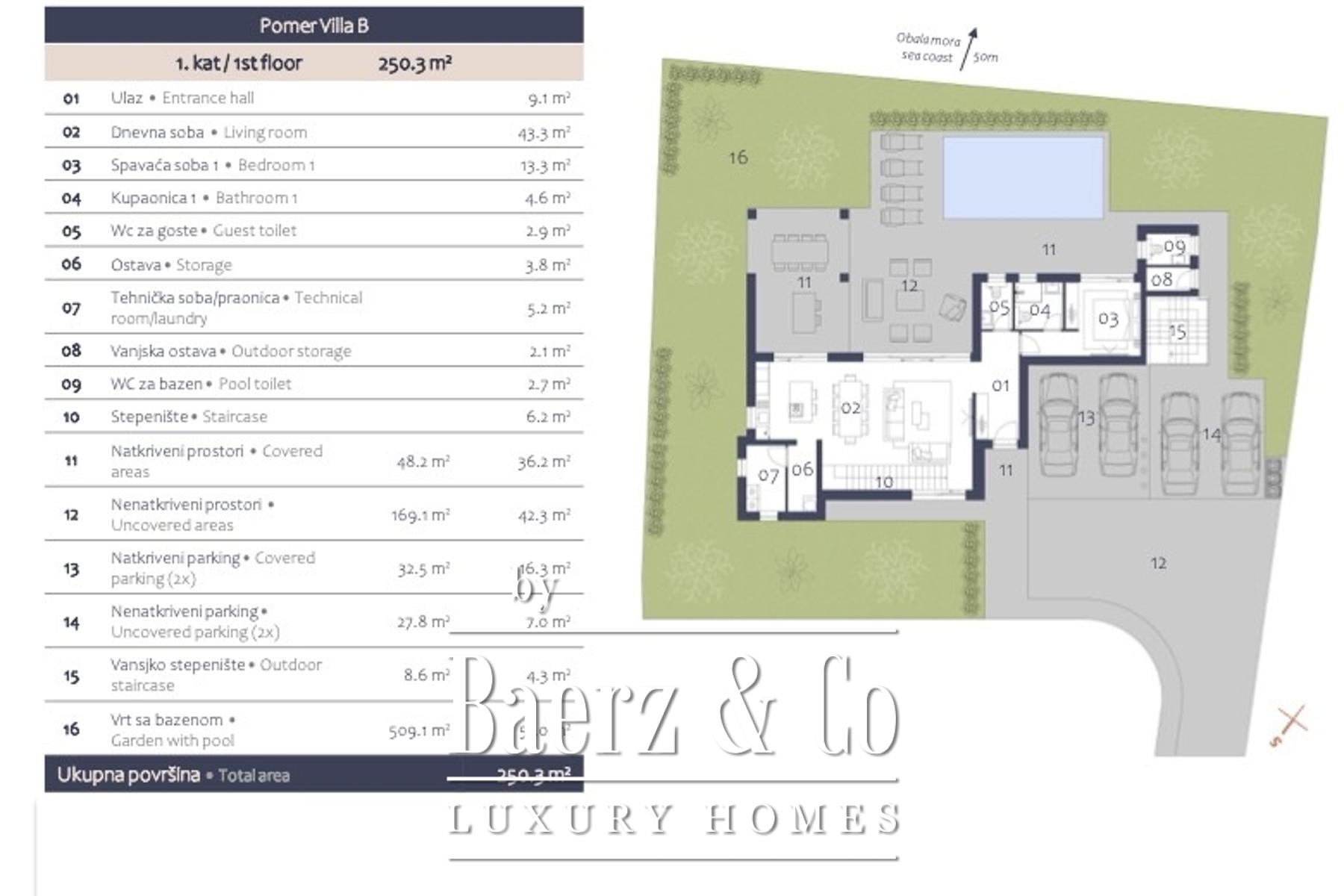 Townhouse Medulin presents a contemporary residence in the southern region of the Istrian peninsula, set just 20 meters from the Adriatic. This property spans 417 m² across two levels, complemented by a rooftop terrace, and rests on a 720 m² plot that balances interior space with outdoor living. The orientation and layout engage southern light, flooding the open-plan living room with a clarity that extends through to the covered terrace and swimming pool. A sleek kitchen, one bedroom with private bath, guest facilities, dedicated technical and storage rooms create practical ease on the ground floor.