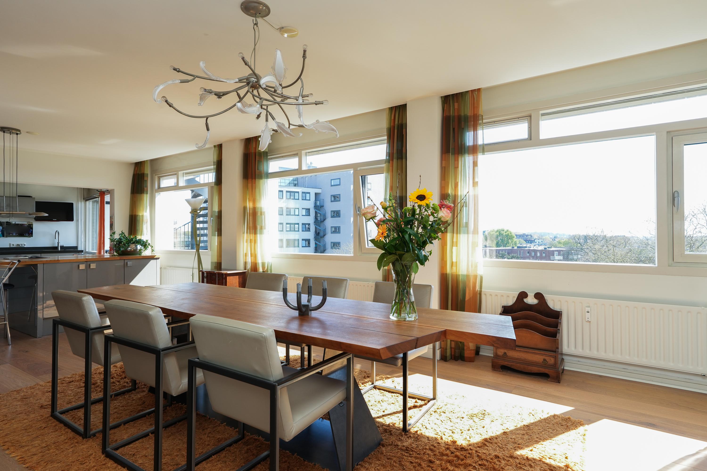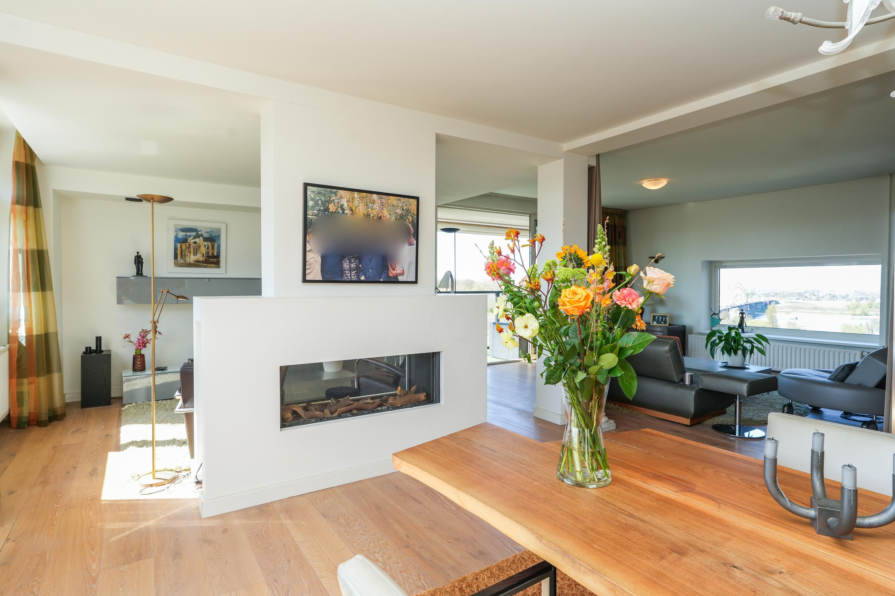 The kitchen is equipped with various built-in appliances and provides access to the first, south-facing balcony. Adjacent to the kitchen is an internal utility room offering additional storage and workspace. From the living room and the balcony there are beautiful views over the city of Nijmegen and Radboud University. A gas fireplace separates the dining area from the television/lounge area on the south-west side. The west-facing balcony offers lovely views towards the River Waal and the iconic Waal Bridge.