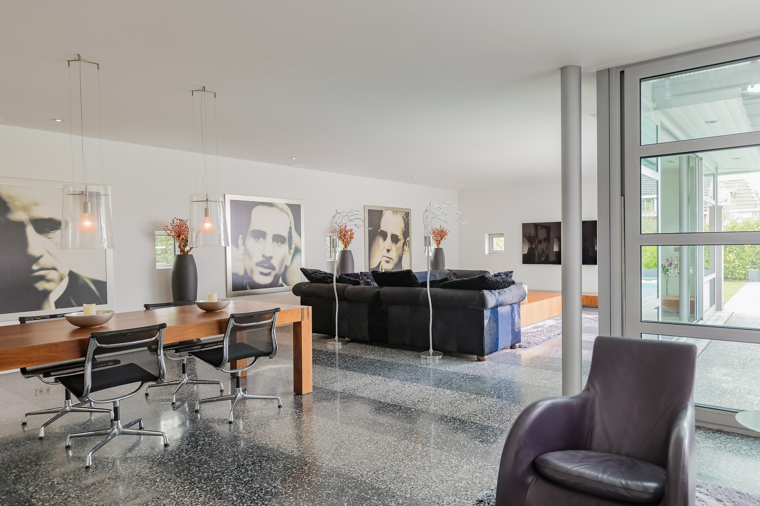 The entire ground floor has a terrazzo floor with underfloor heating. To enhance the indoor/outdoor experience, large sliding doors give access to the garden and the terrazzo floor has been extended to the outside.