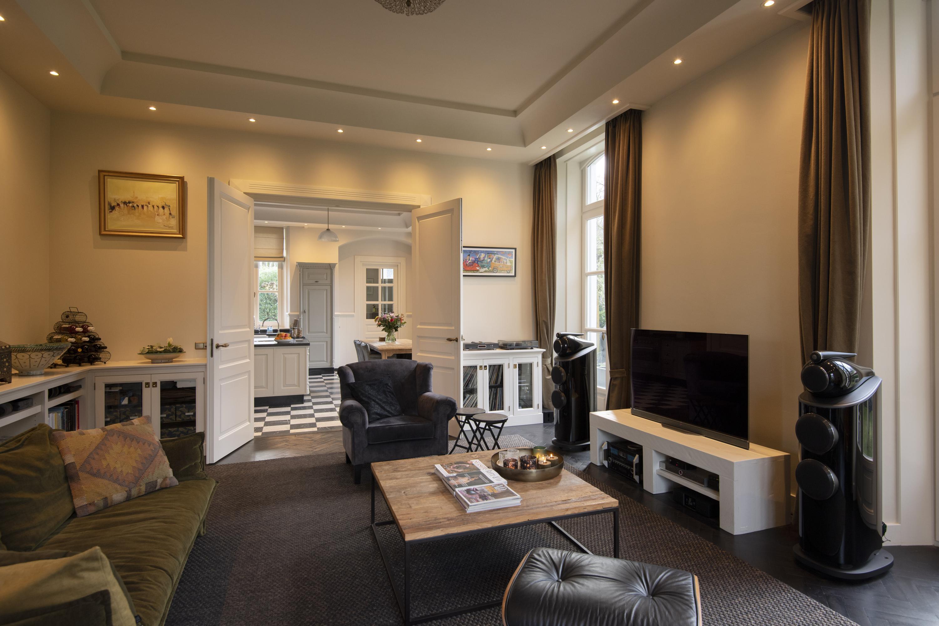 The completely nature-oriented living room consists of a sitting room and a dining room. There are two fireplaces and four pairs of French doors to the garden. The 3.60m high stucco ceilings combined with the amount of light through the high windows create a magnificent spatial experience. Double doors lead into the cozy eat-in kitchen. This fully equipped kitchen is furnished with a classic Tinello kitchen unit with a natural stone worktop, sink island and high-quality appliances. In the tower adjacent to the kitchen diner is a pantry. In the living kitchen are two pairs of double doors to the garden. The entire first floor has underfloor heating.