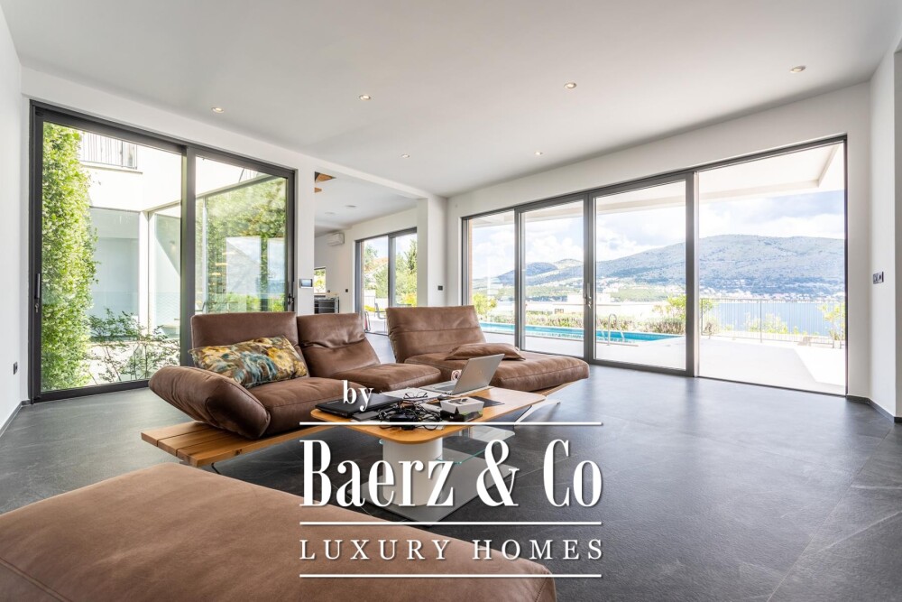 Villa Okrug Croatia stands as a contemporary retreat, set just one row back from the Adriatic shoreline. This three-level villa offers a living area of 326 m² on a 728 m² plot, combining clean architectural lines with unobstructed sea views and access to the tranquil waters that define the island of Čiovo. The focus keyword villa Okrug Croatia speaks to the unique balance of privacy and connection to the Adriatic lifestyle.