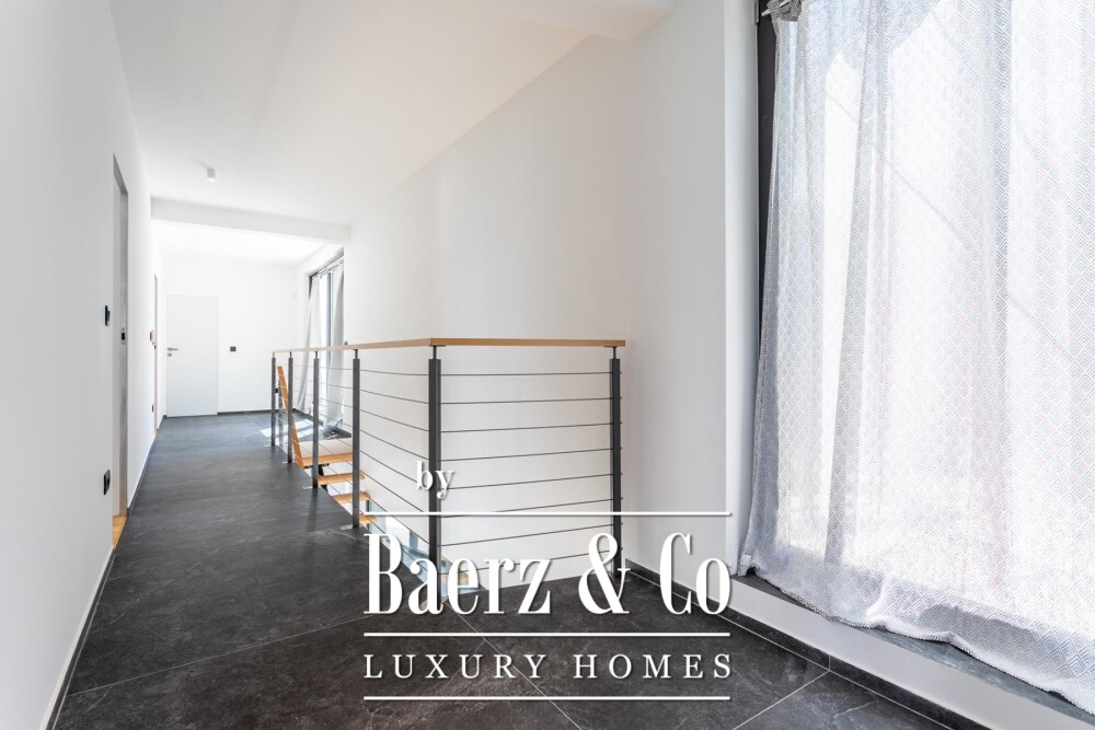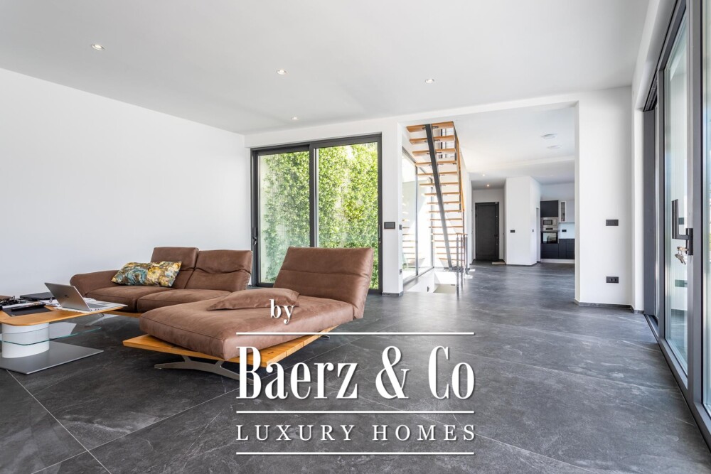 Inside, four bedrooms and five bathrooms offer robust privacy, complemented by a flowing layout that places the living room and a fully equipped kitchen at the heart of the home. Full-height triple-glazed windows and electric blinds mark the seamless transition between interior space and terrace, while large-format ceramic tiles and parquet flooring instil a contemporary rhythm throughout. The heated pool commands the terrace, inviting quiet reflection or discreet gatherings with sea as the backdrop.