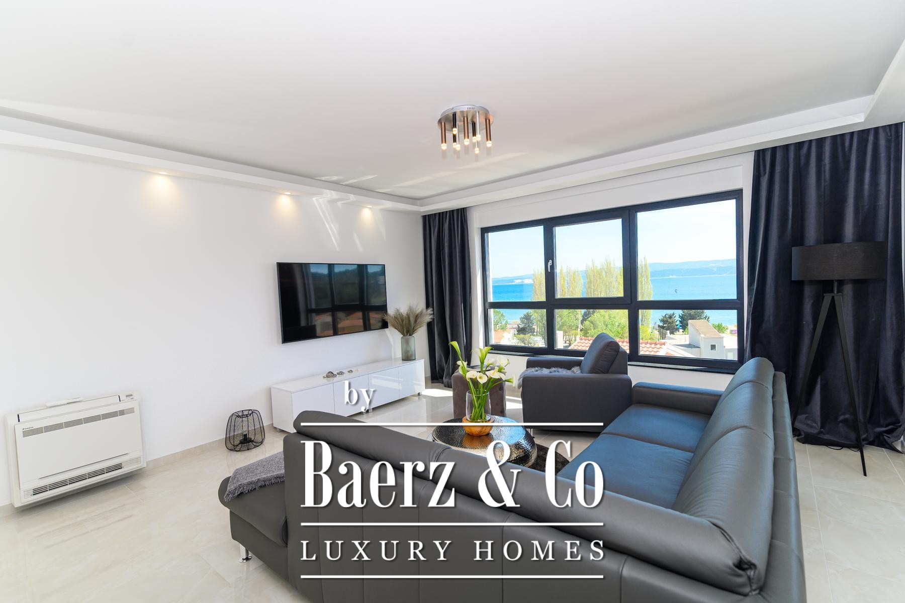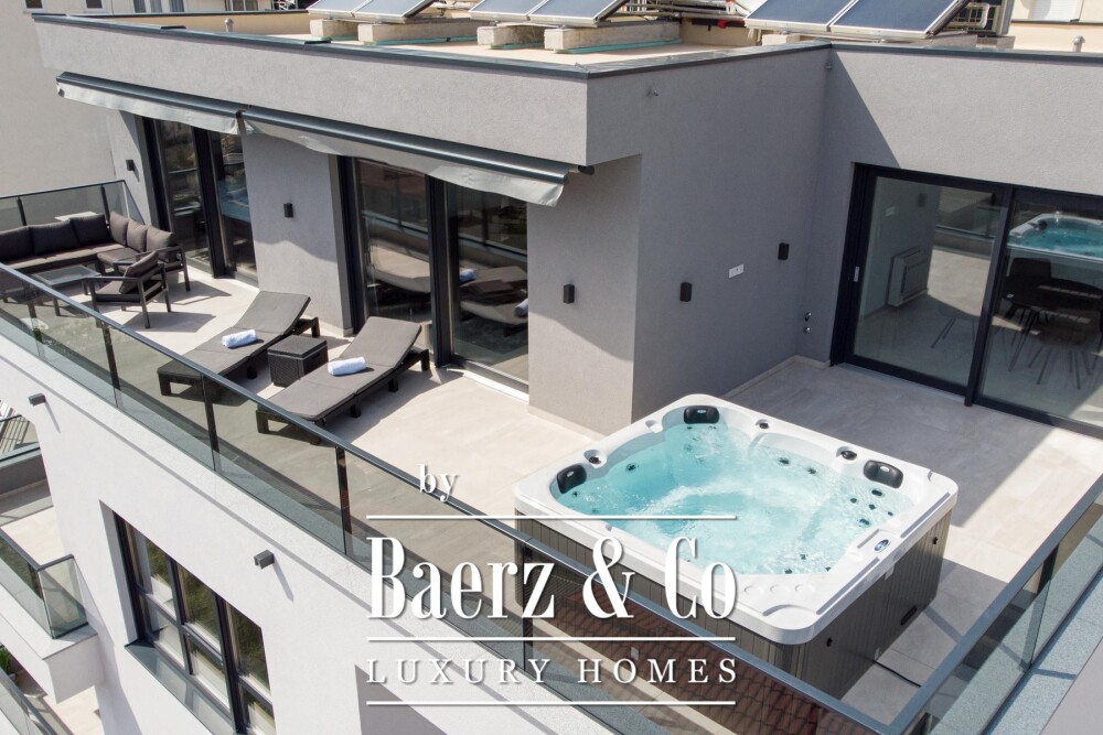 Three distinct apartments form the heart of the villa, with a penthouse at the summit offering a generous terrace and Jacuzzi, both oriented to maximize sweeping sea vistas. Each floor is connected through an internal staircase, creating a sense of continuity and ease throughout. The ground and first floors each host spacious two-bedroom apartments of 92 m² interior space, expanding to 108.5 m² with balconies and loggias. Each bedroom features its own bathroom and private balcony, ensuring that sea views are present in all principal rooms.