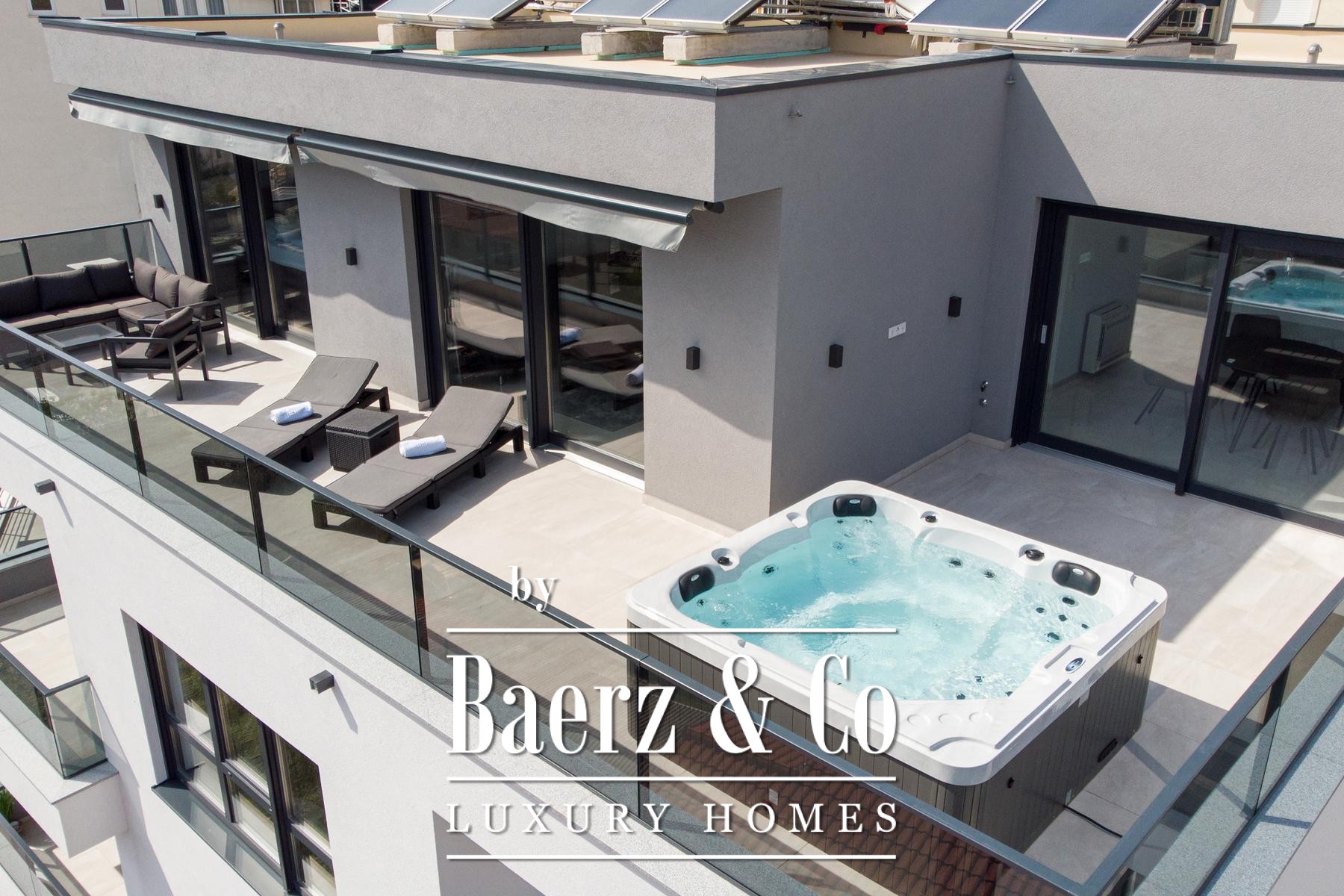 Communal spaces are thoughtfully curated for leisure and privacy, including a basement lounge, gym, large sauna with shower, a sunbathing terrace, and a private pool. High-quality textures extend throughout, from anthracite-toned triple-layer glazing and stone, to underfloor heated bathrooms and Daikin inverter air-conditioning. Solar panels provide hot water with a capacity of 1,200 liters, underlining both sustainability and comfort.
