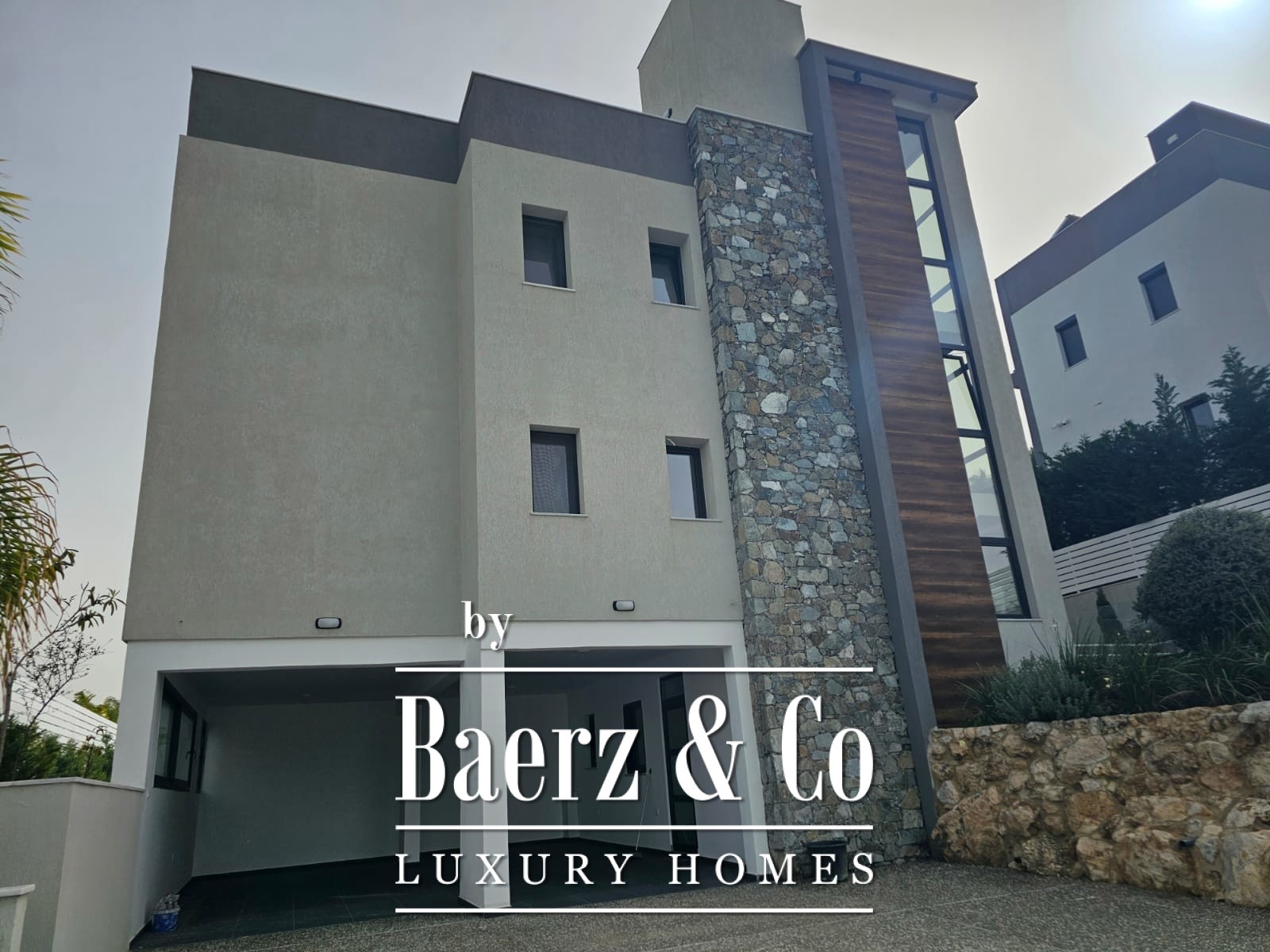 The primary living areas are oriented for natural light, while the villa’s layout accommodates four bedrooms, three bathrooms, and two guest WCs. Premium materials include tiled floors and aluminium double-glazed, energy-efficient windows. Underfloor heating, air conditioning, a ventilation system, and sound and thermal insulation ensure year-round comfort. An internal elevator and staircase connect all floors, emphasizing convenience and accessibility.