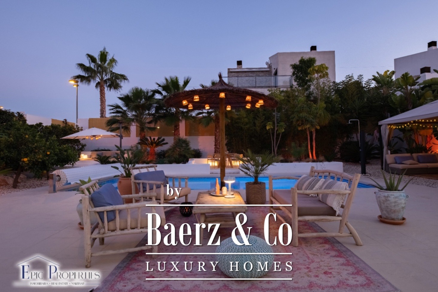 Charming villa located in a quiet residential area. This property offers a bright and spacious environment with high ceilings and marble flooring throughout the house. The home, with 114 m² built on a single floor on a plot of 820 m², features 3 bedrooms and 2 bathrooms. The master bedroom has an en-suite bathroom and a walk-in closet, while the other bedrooms include built-in wardrobes. It has a fully equipped open kitchen that connects to the living room. Large windows