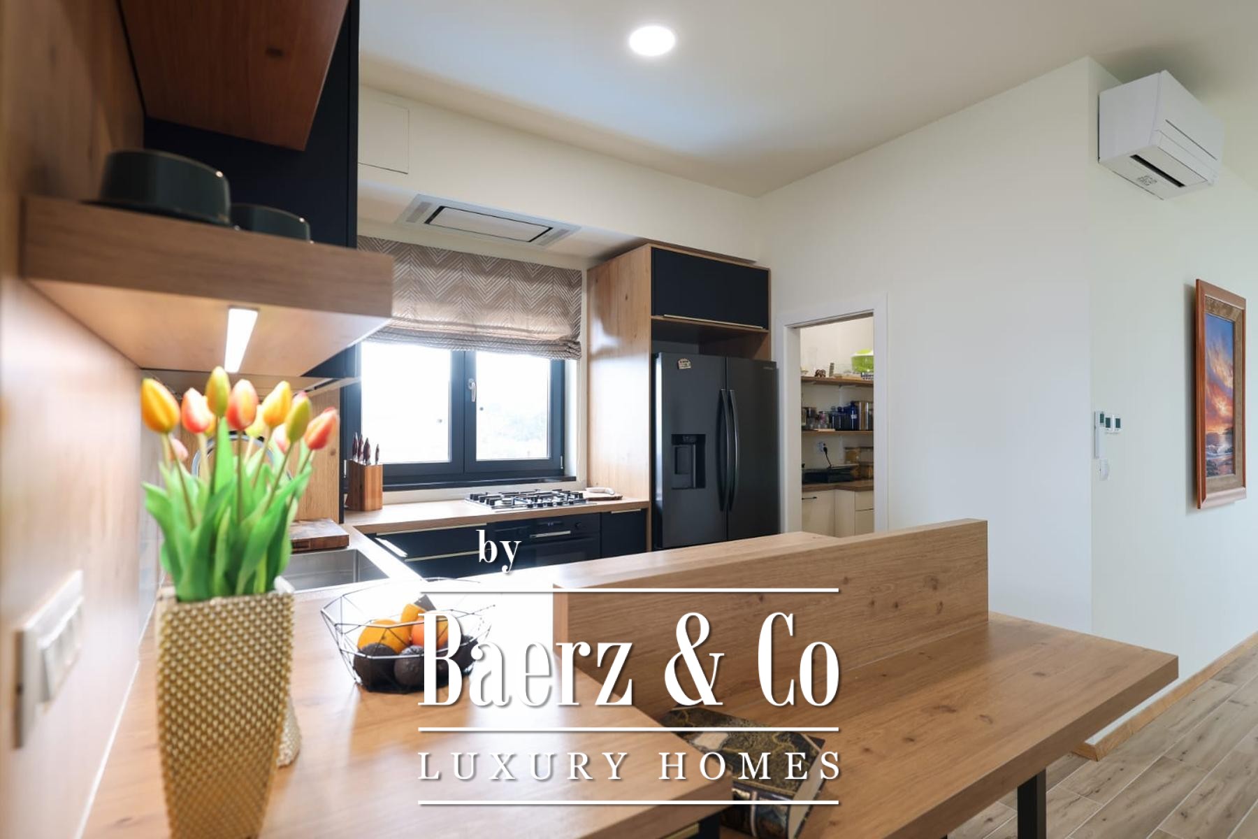 Ascending via elevator, the first floor is anchored by a master suite with its own bathroom, wardrobe, and terrace access, seamlessly linked to a generous living and dining space. The layout further accommodates a study, an additional bedroom and bathroom, a storage area, and a laundry room, each positioned to capture the serene light and tranquil sea views. The terrace and living room share panoramic views over the sea and Zadar, while the pool and landscaped yard heighten the villa’s connection to its surroundings.