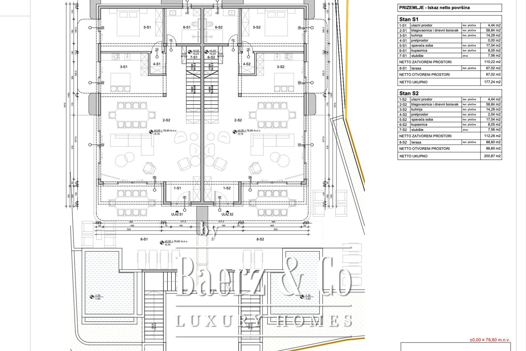 Semi-detached villa Primošten stands within a thoughtfully conceived resort, offering 473.04 m² of living space set over three floors. This residence integrates functionality with architectural clarity, with four bedrooms and four bathrooms designed for fluid daily life and privacy. The lower level presents a capacious garage accommodating three vehicles, complemented by storage, a laundry room and pool facilities, underscoring a quiet focus on utility.
