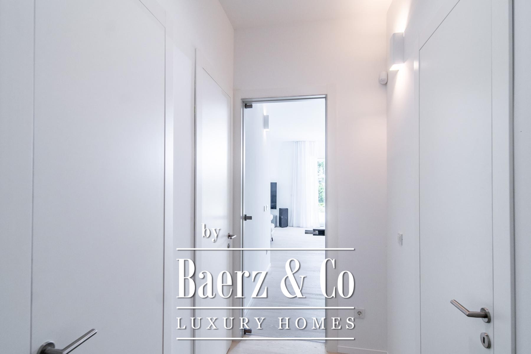 The villa, a modern ground-floor residence with a flat roof and 400 m² of interior space, is engineered to mitigate wind and rainfall. Exterior walls combine 38 cm of clay block masonry, 12 cm thermal insulation, and Baumit finishing, ensuring optimal energy performance. With two bedrooms, two bathrooms, and a ceiling height of 303 cm, the living experience is quietly expansive and filled with natural light. Large glass walls are shaded in summer by broad roof overhangs, while in winter, the sun’s lower arc gently warms the core spaces.
