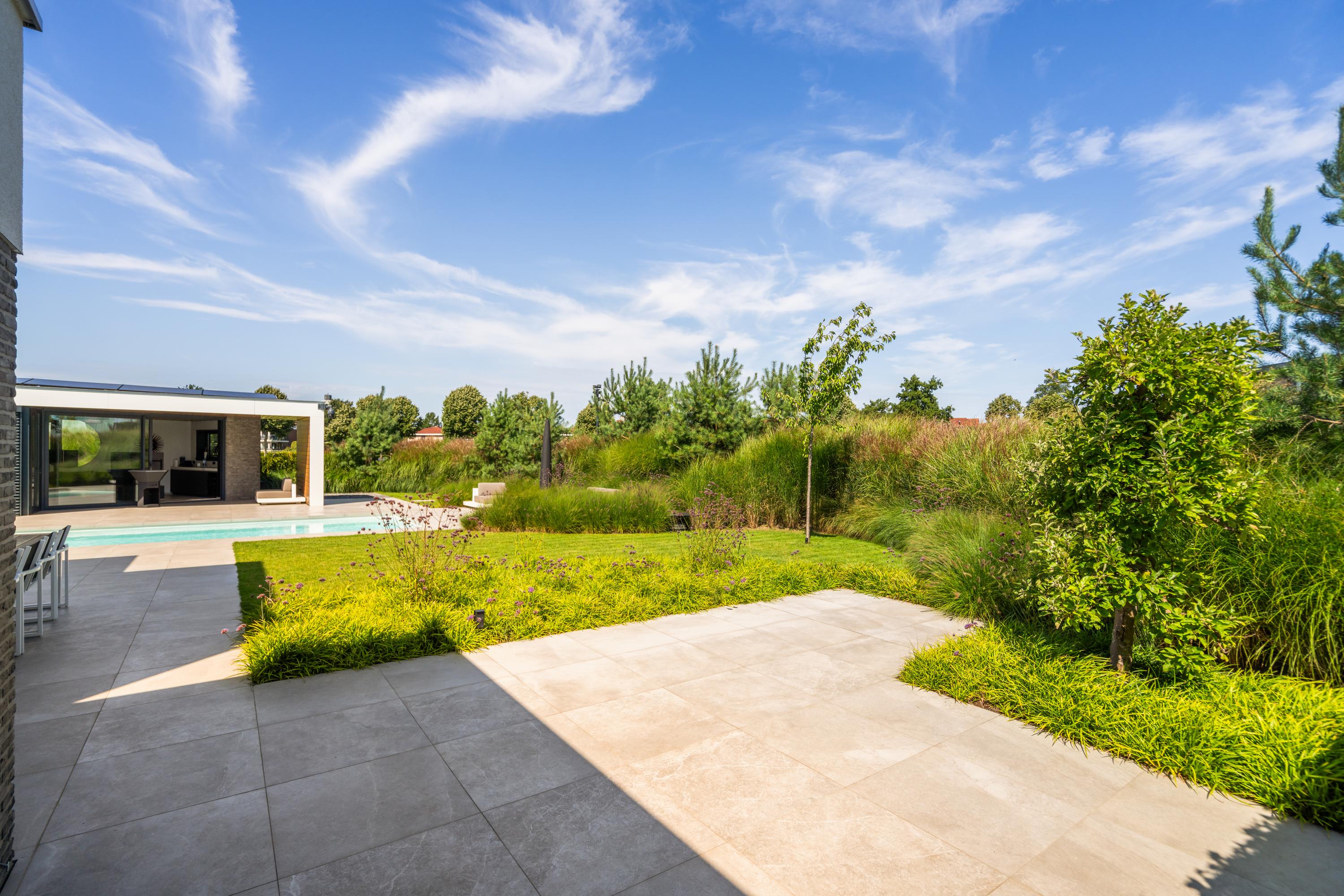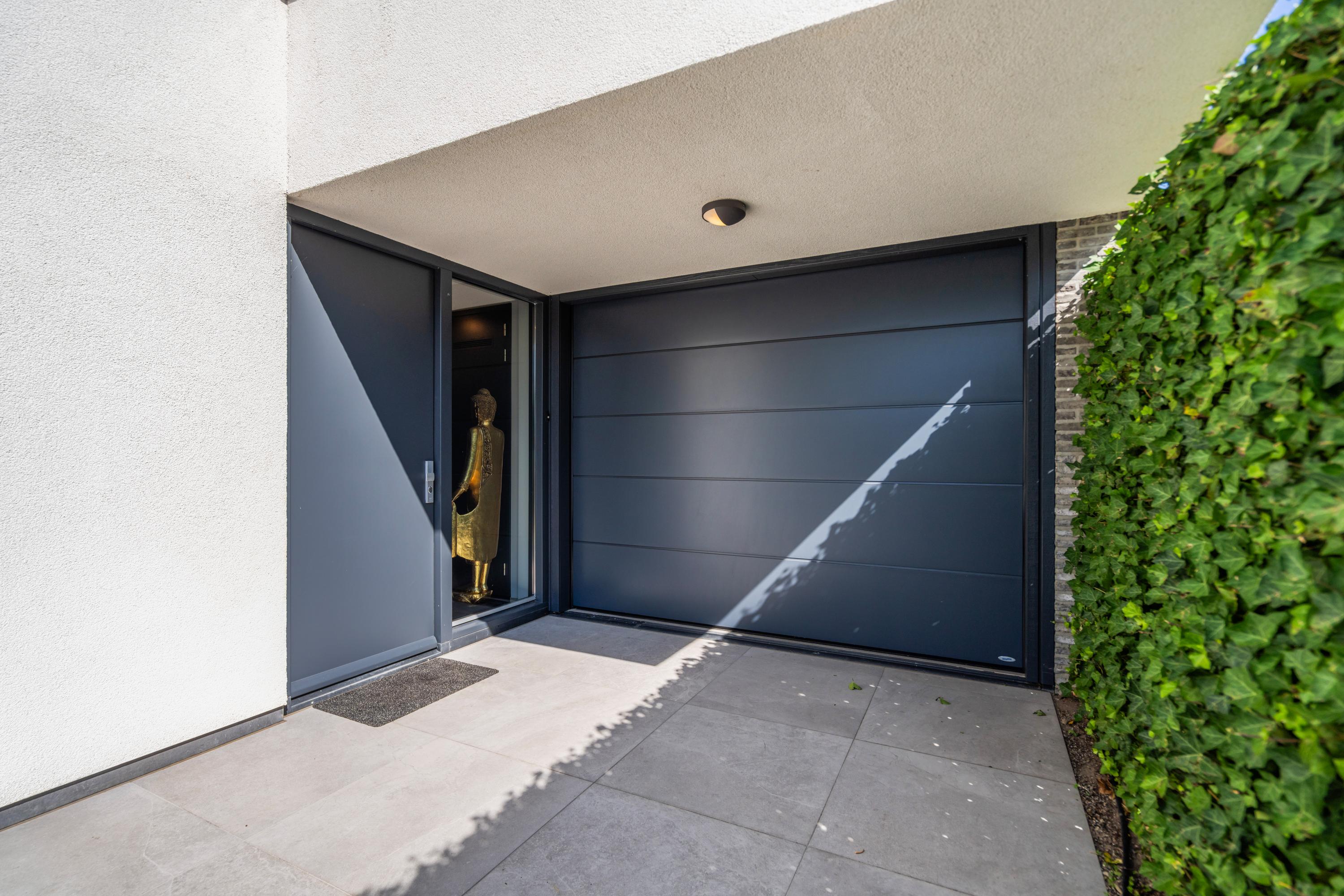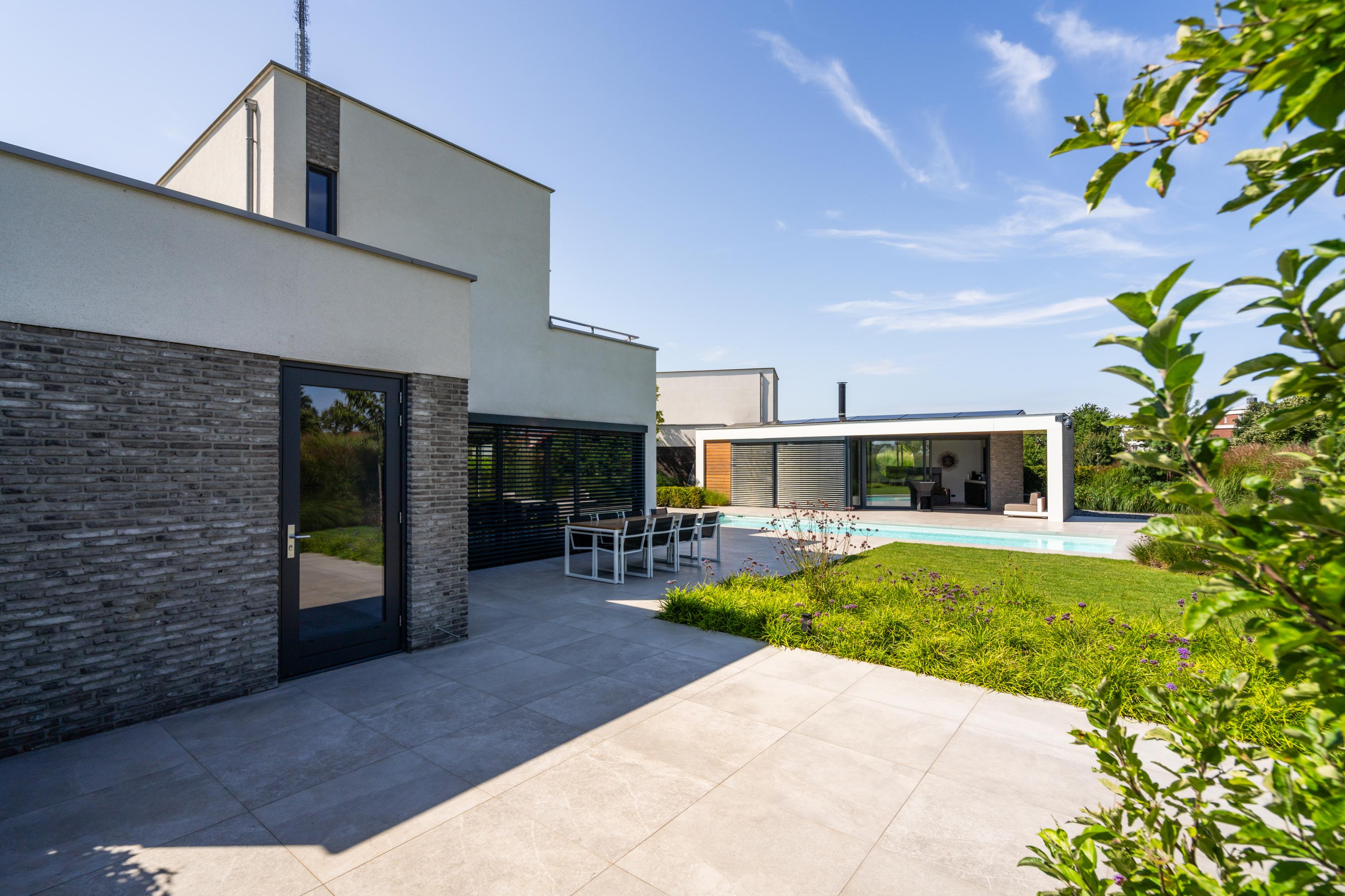 At the front, the villa is embraced by a generous garden that immediately sets the tone for the exclusive character of the property. The carefully designed combination of modern paving and green borders creates a harmonious and refined whole. The private driveway, finished with high?quality tiles and subtle greenery, leads you stylishly to the entrance.