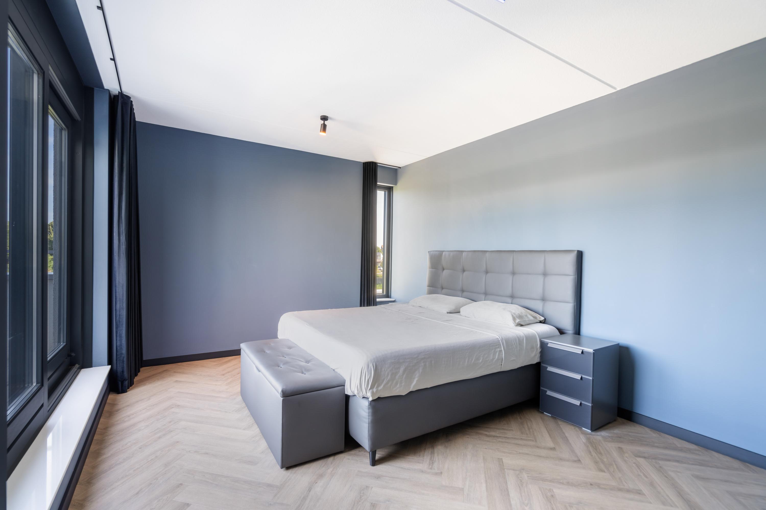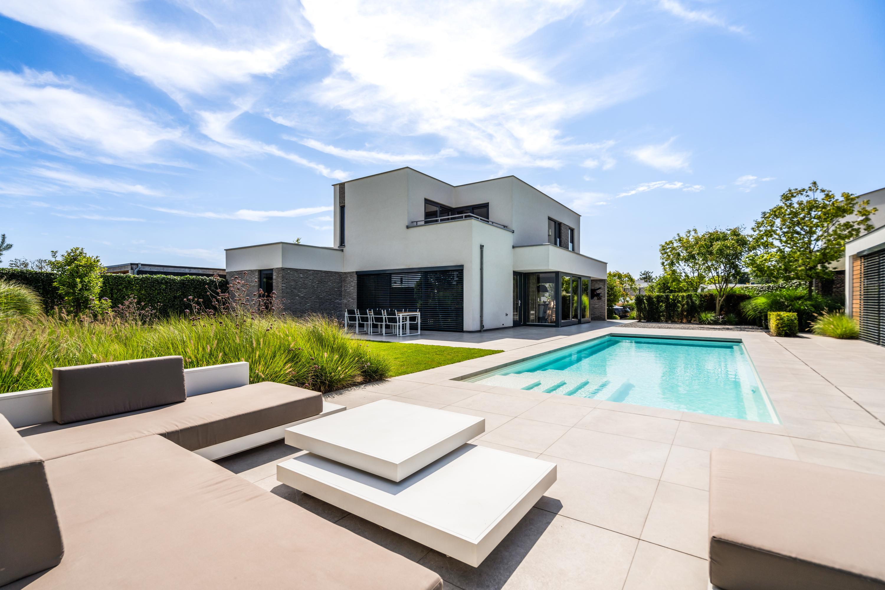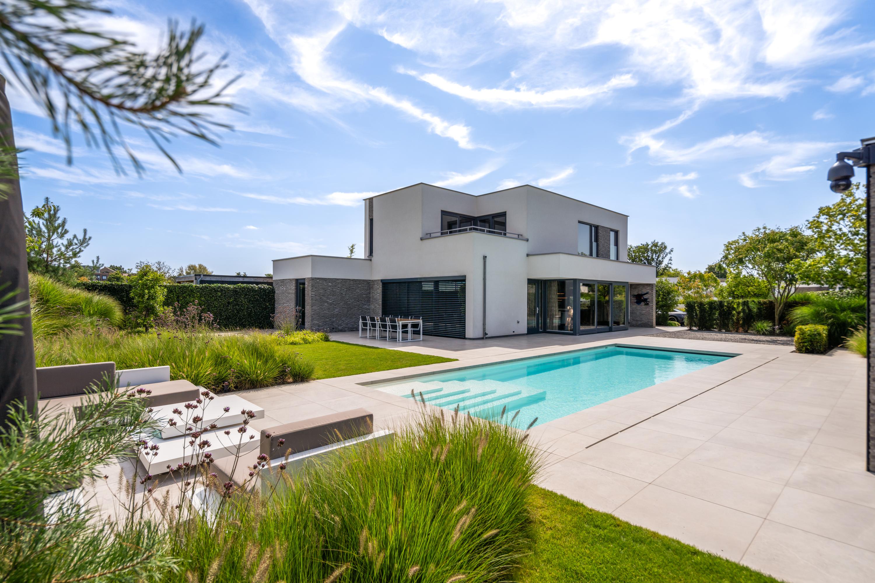 At the front, the villa is embraced by a generous garden that immediately sets the tone for the exclusive character of the property. The carefully designed combination of modern paving and green borders creates a harmonious and refined whole. The private driveway, finished with high?quality tiles and subtle greenery, leads you stylishly to the entrance.