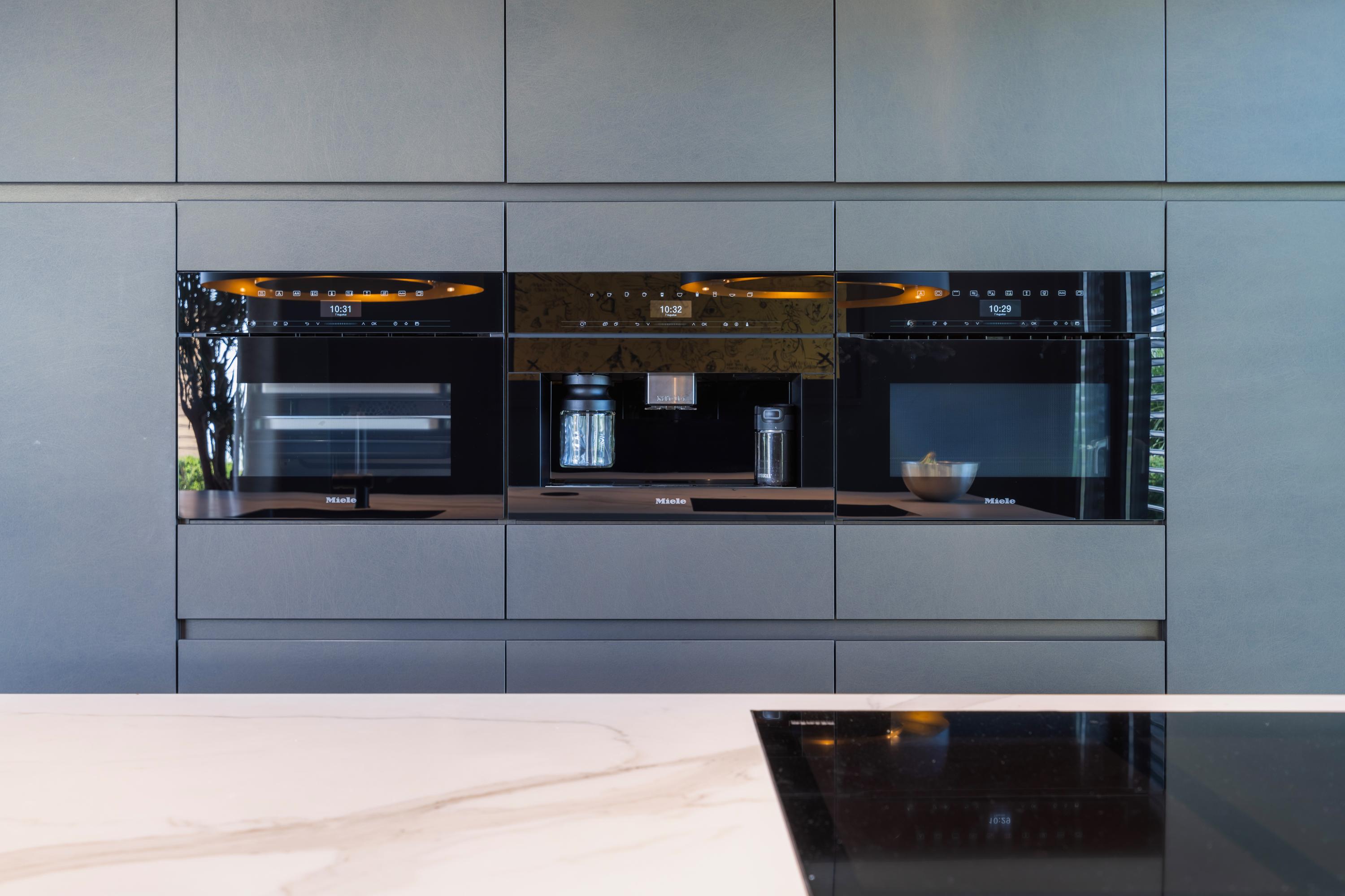 The luxurious kitchen at the front of the house is equipped with Miele built?in appliances, including a coffee machine, convection oven, steam oven, Bora induction hob with integrated extraction, dishwasher, wine climate cabinet, and various storage cabinets and drawers. From the kitchen, you have a lovely view of the beautifully landscaped front garden.