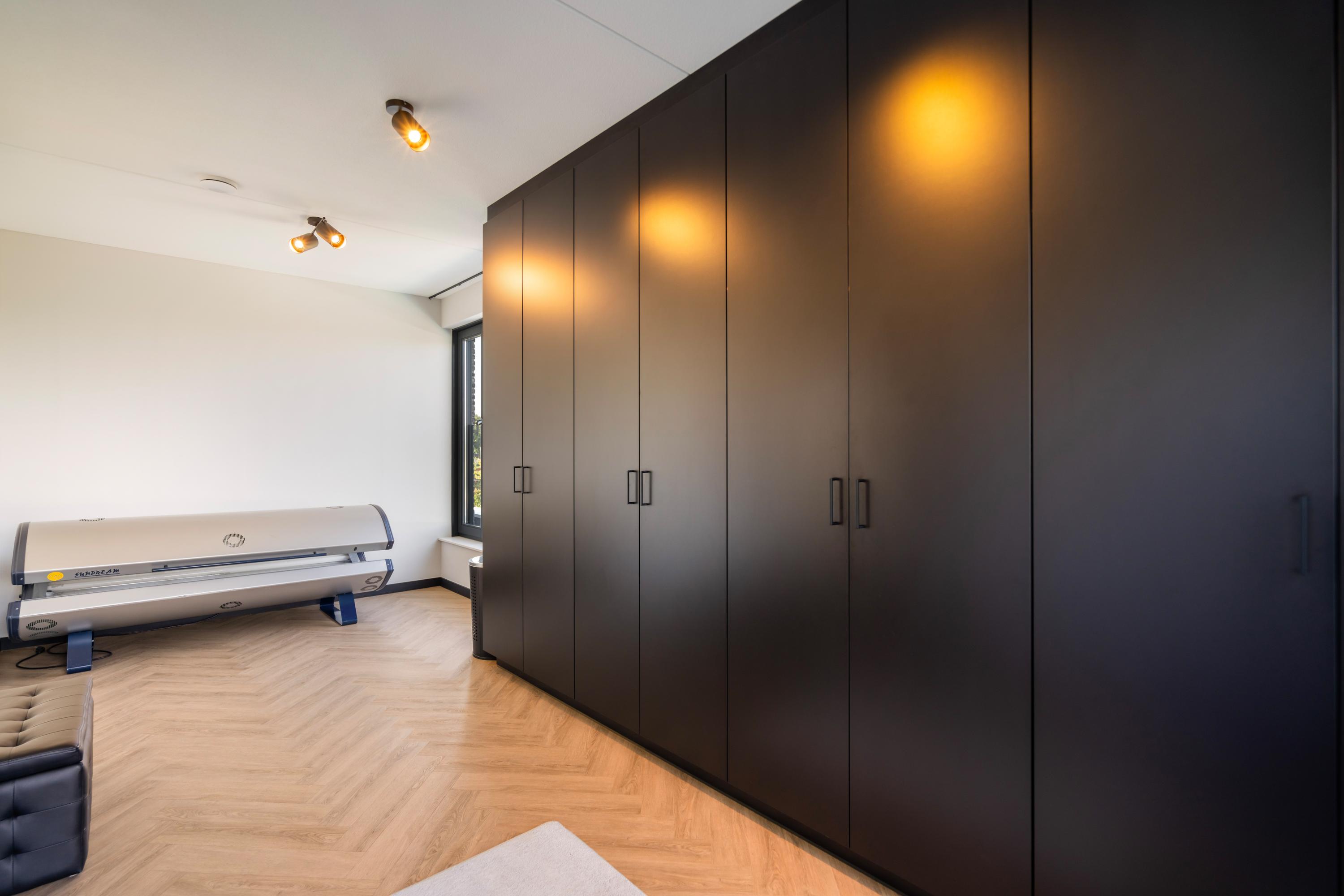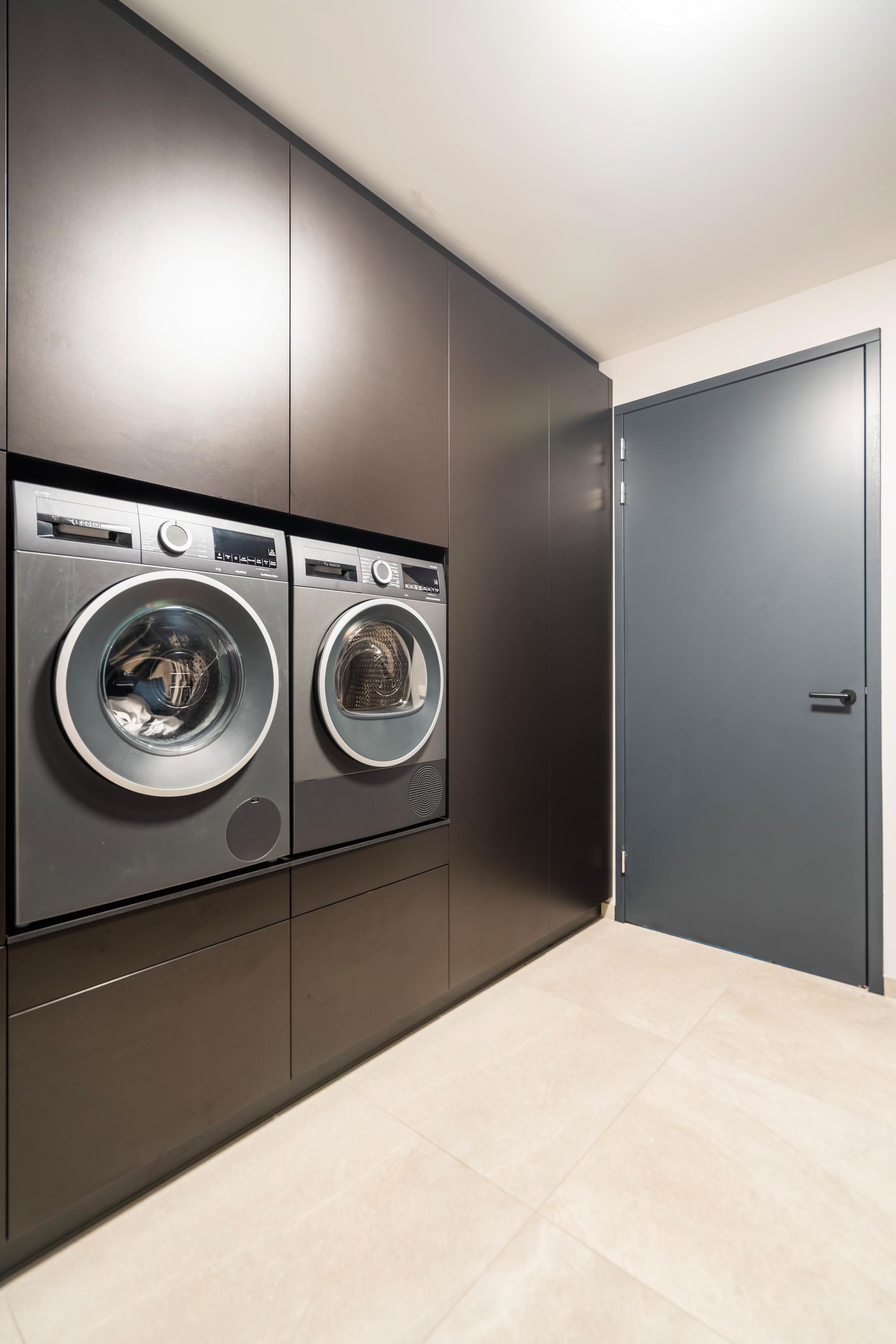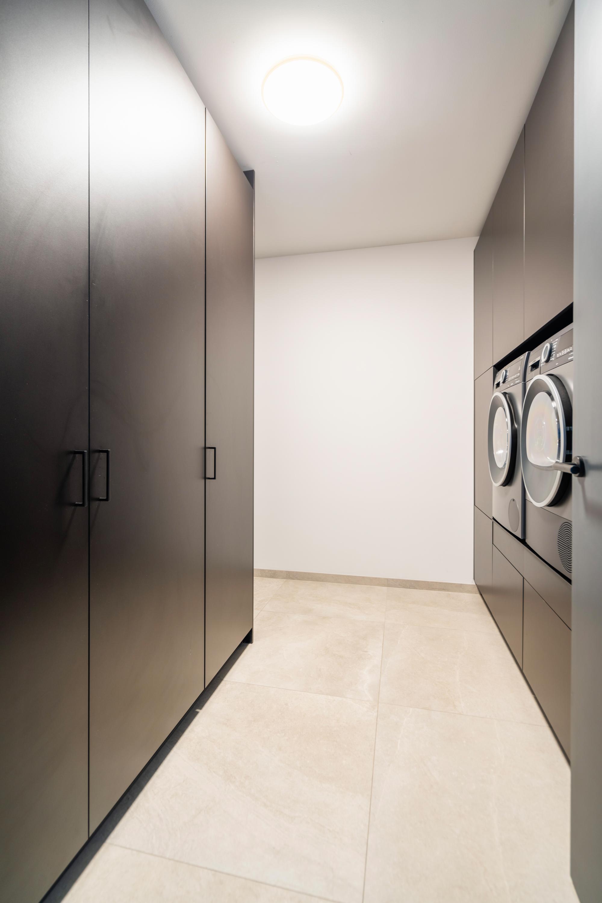 The utility room features a custom?made wall of cabinets, including a refrigerator, storage units, and a raised washing machine setup. From here, you have access to the spacious integrated garage of approx. 38 m². This garage is fully finished with plastered and painted walls and ceilings, the same large tiled floor with underfloor heating and cooling. Due to its size and finish, it can be arranged entirely to your own wishes: