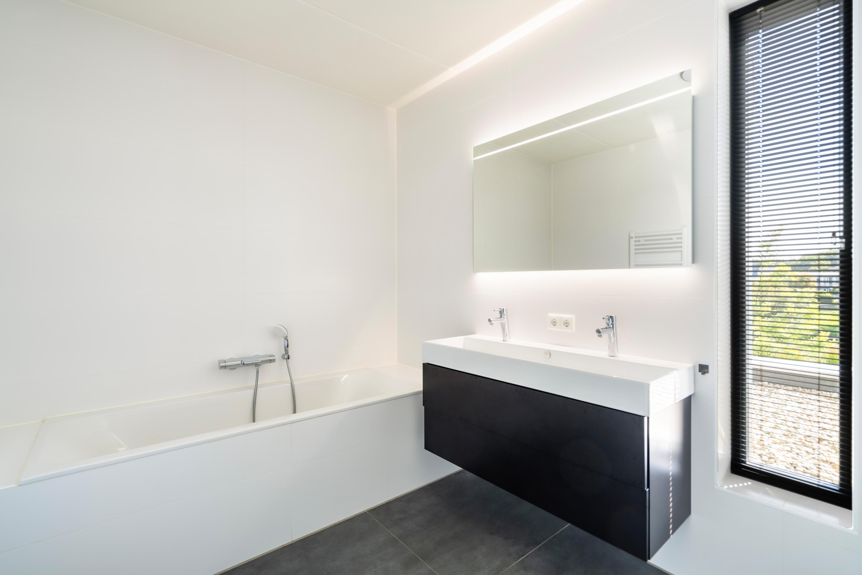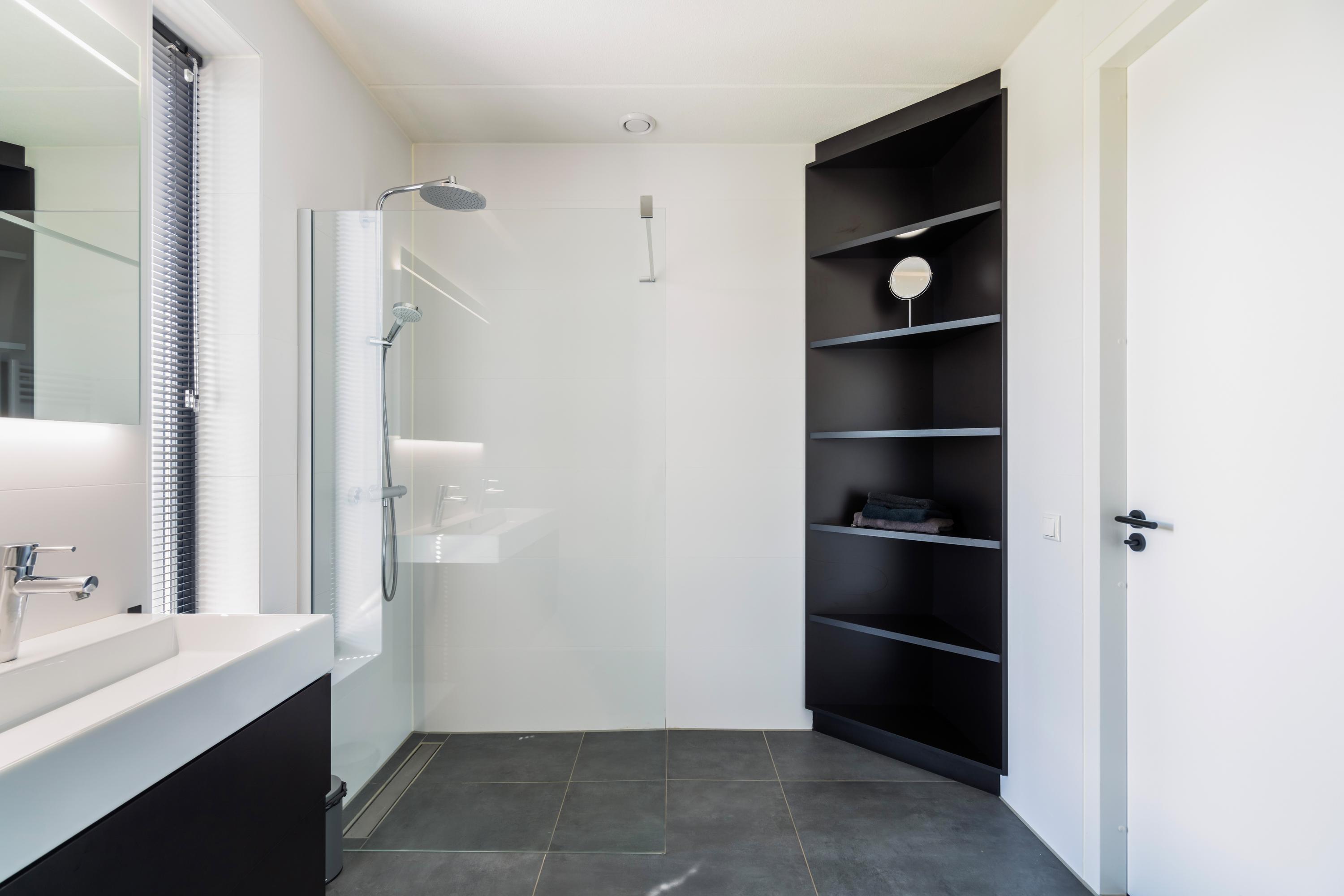The bathroom is equipped with a spacious walk?in shower, bathtub, double washbasin with cabinet, and a practical storage wall. A separate storage room houses the technical installations.