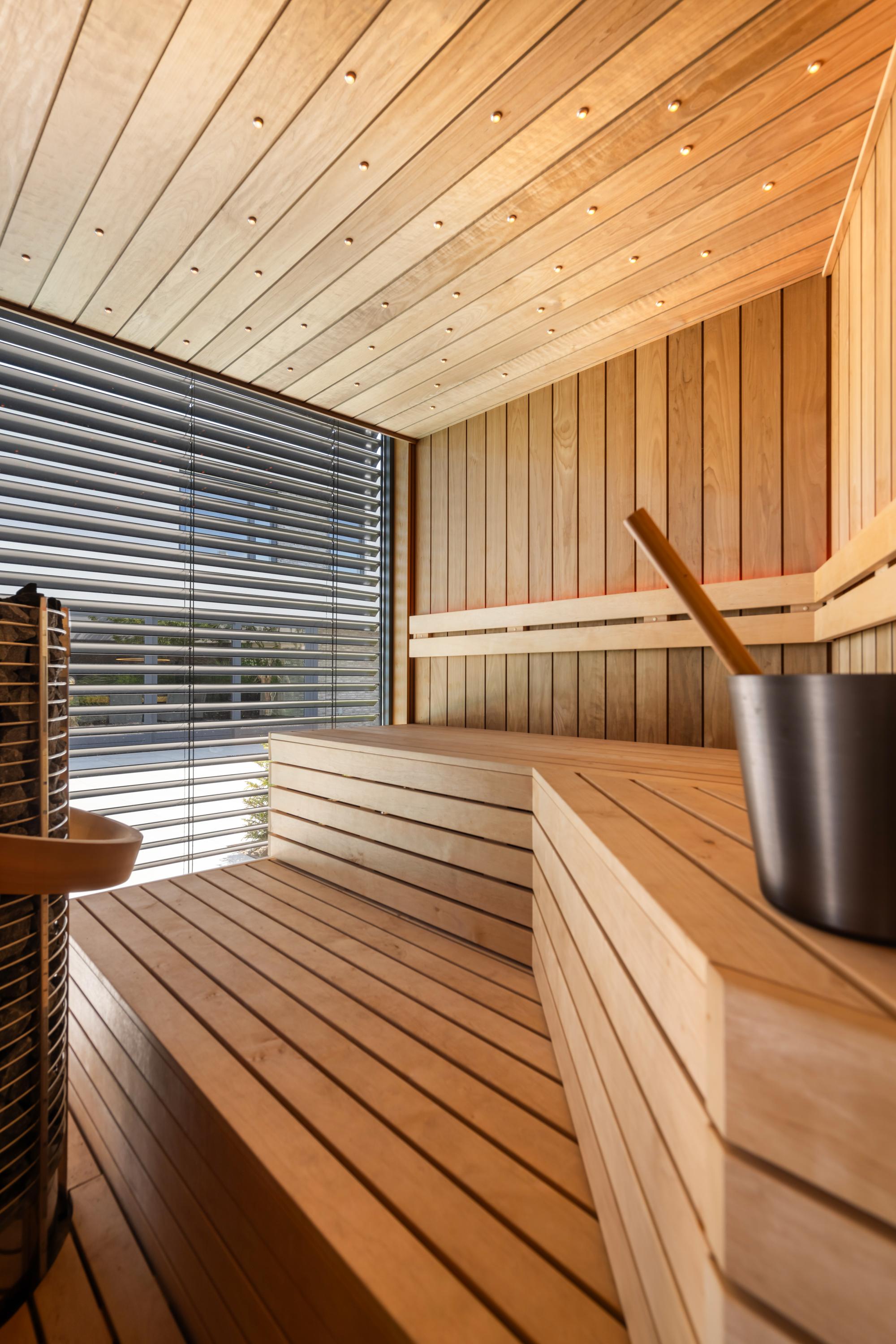 The spacious side and rear gardens are finished to the same high standard. A true highlight is the luxurious pool house, complete with sauna and swimming pool. The carefully selected Finnish wooden interior creates an ultimate wellness atmosphere. Upon entering, the rotating wood?burning stove immediately catches the eye — a real statement piece.