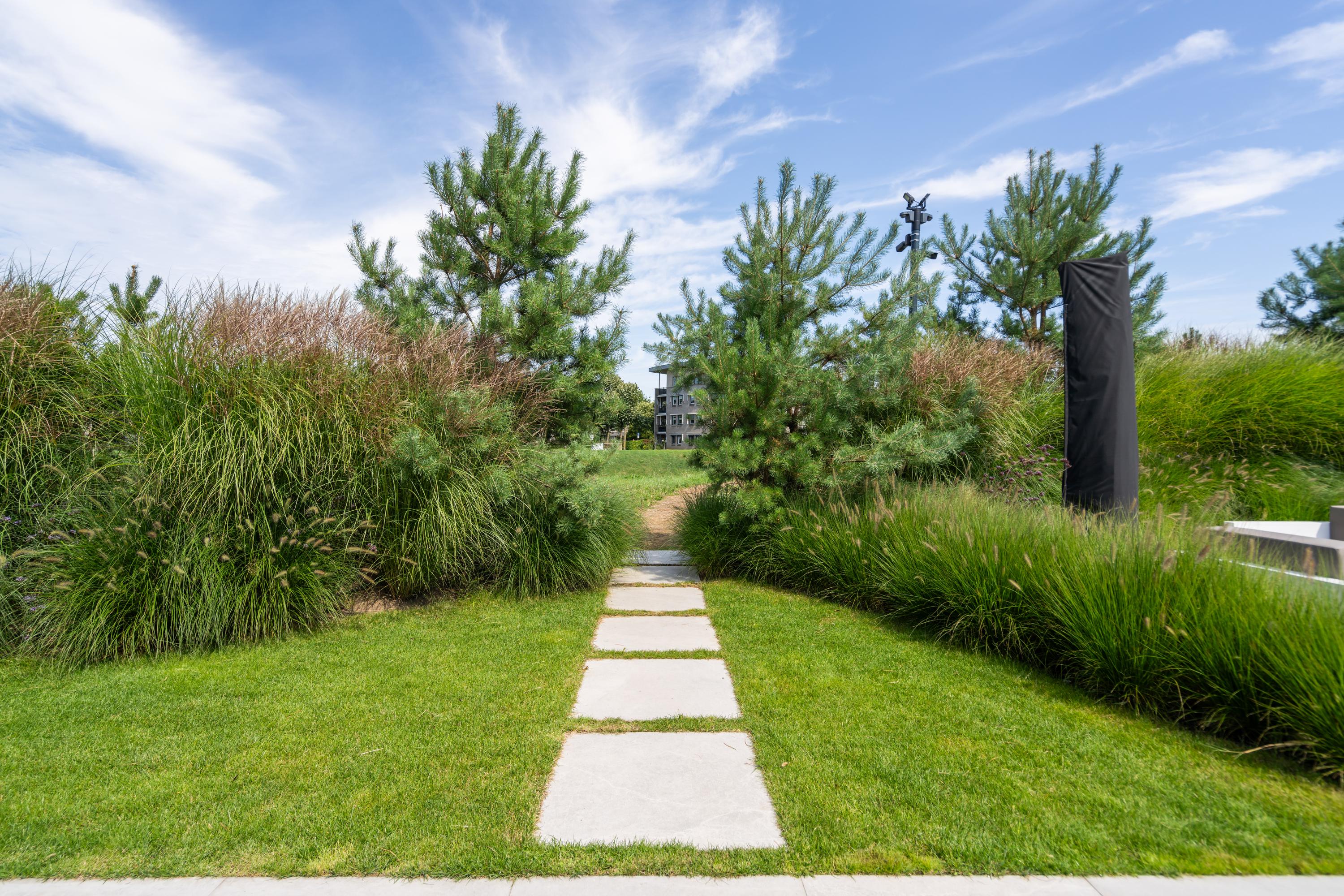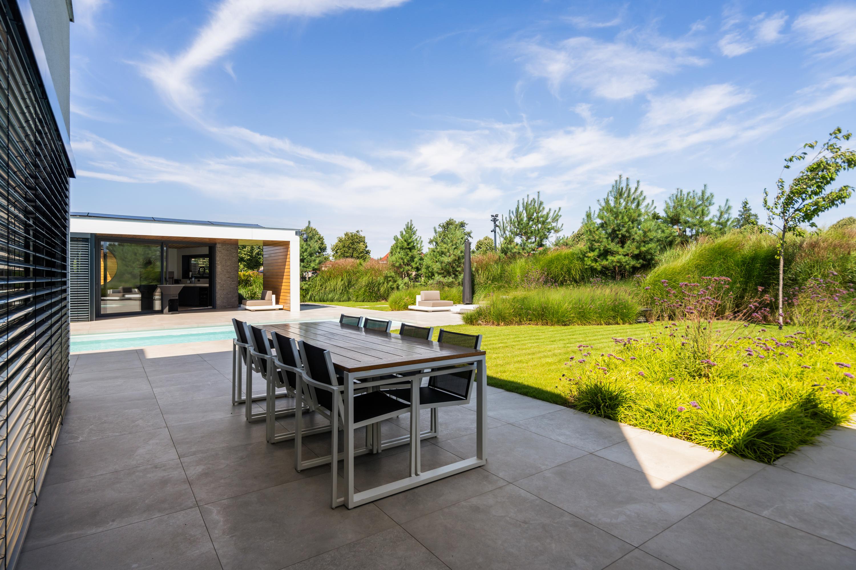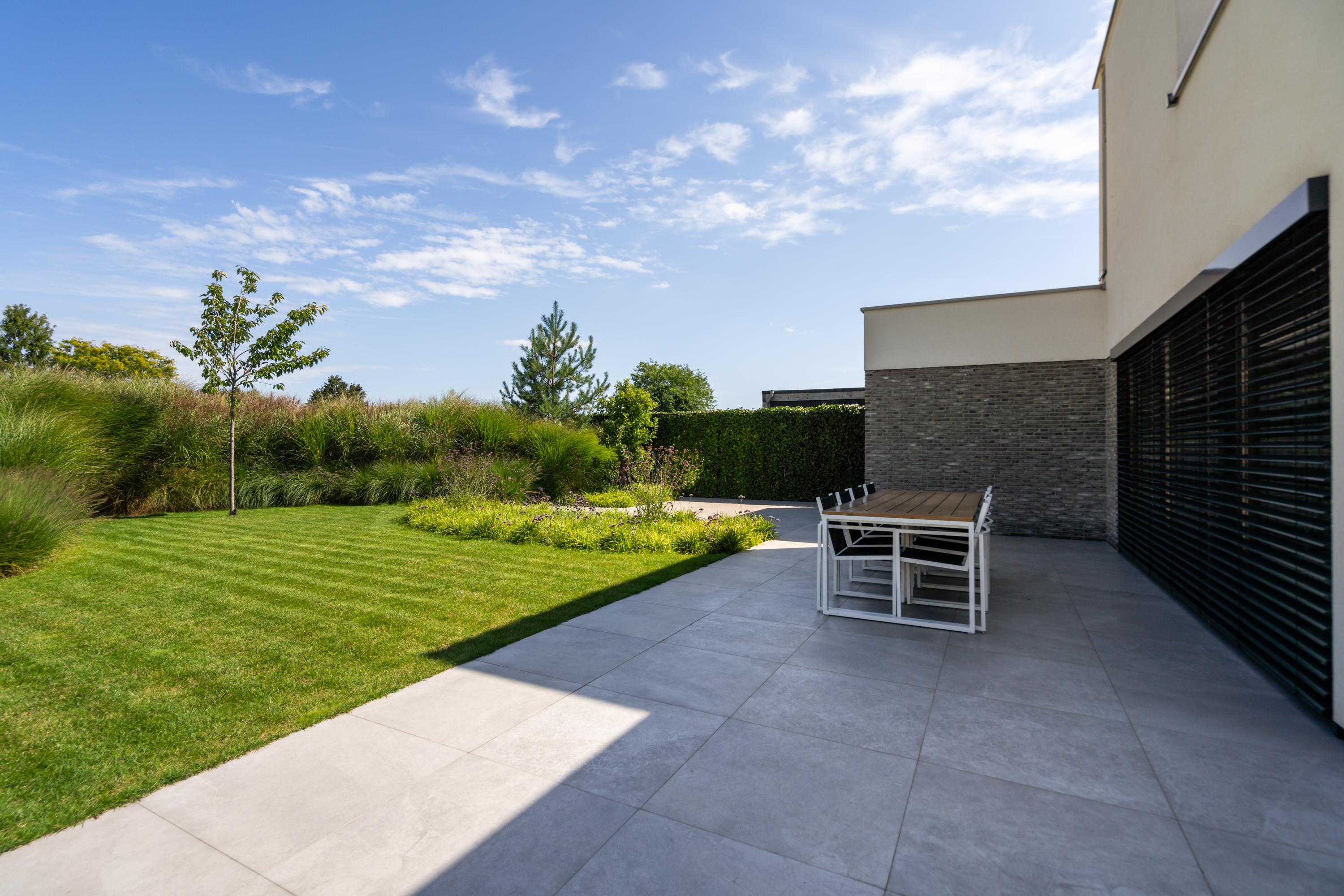 Multiple terraces invite you to enjoy long dinners, drinks, or peaceful moments in the sun. The garden features lawn, gravel, and various plantings — a perfect balance between greenery and the modern character of the home.