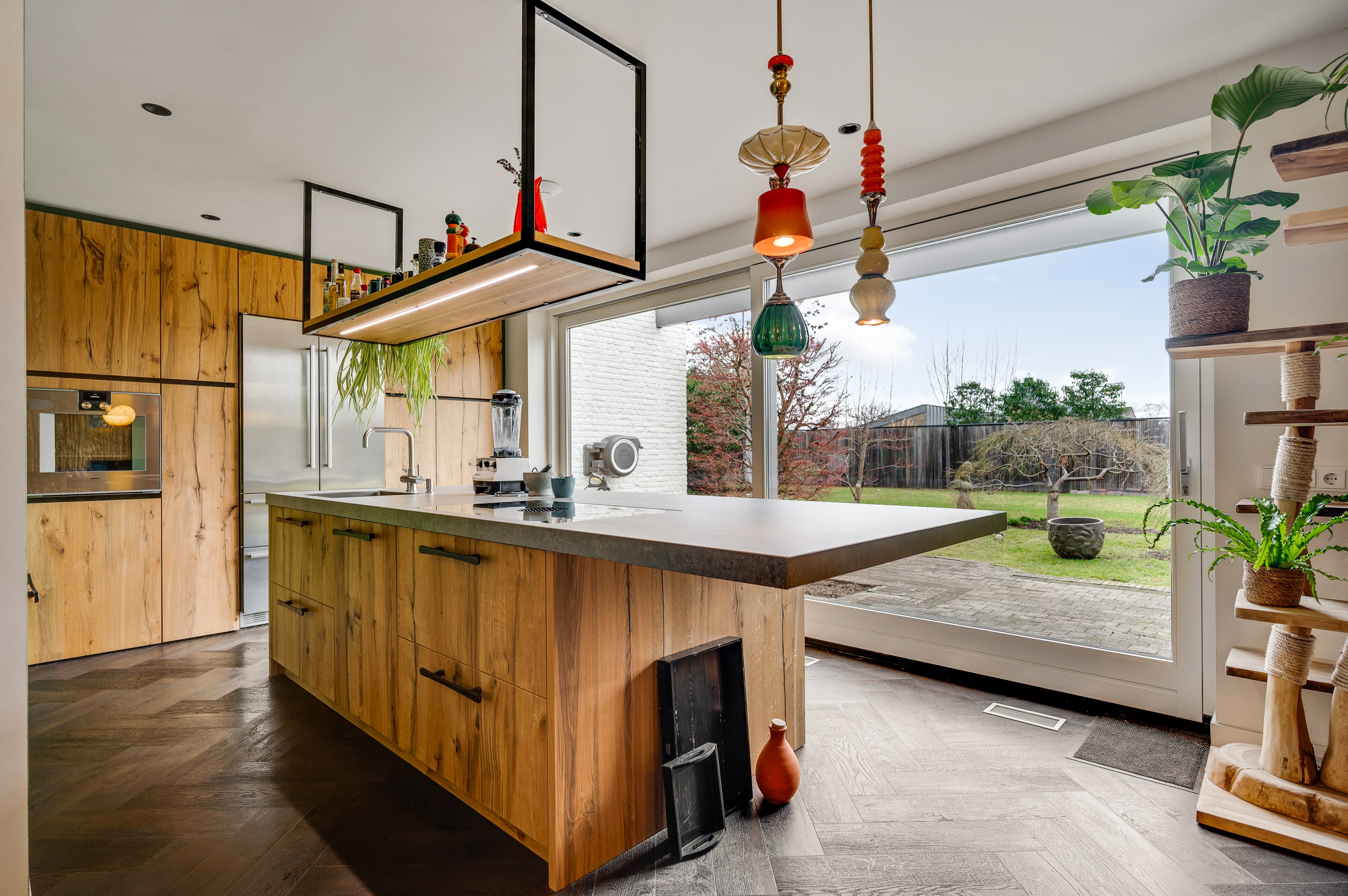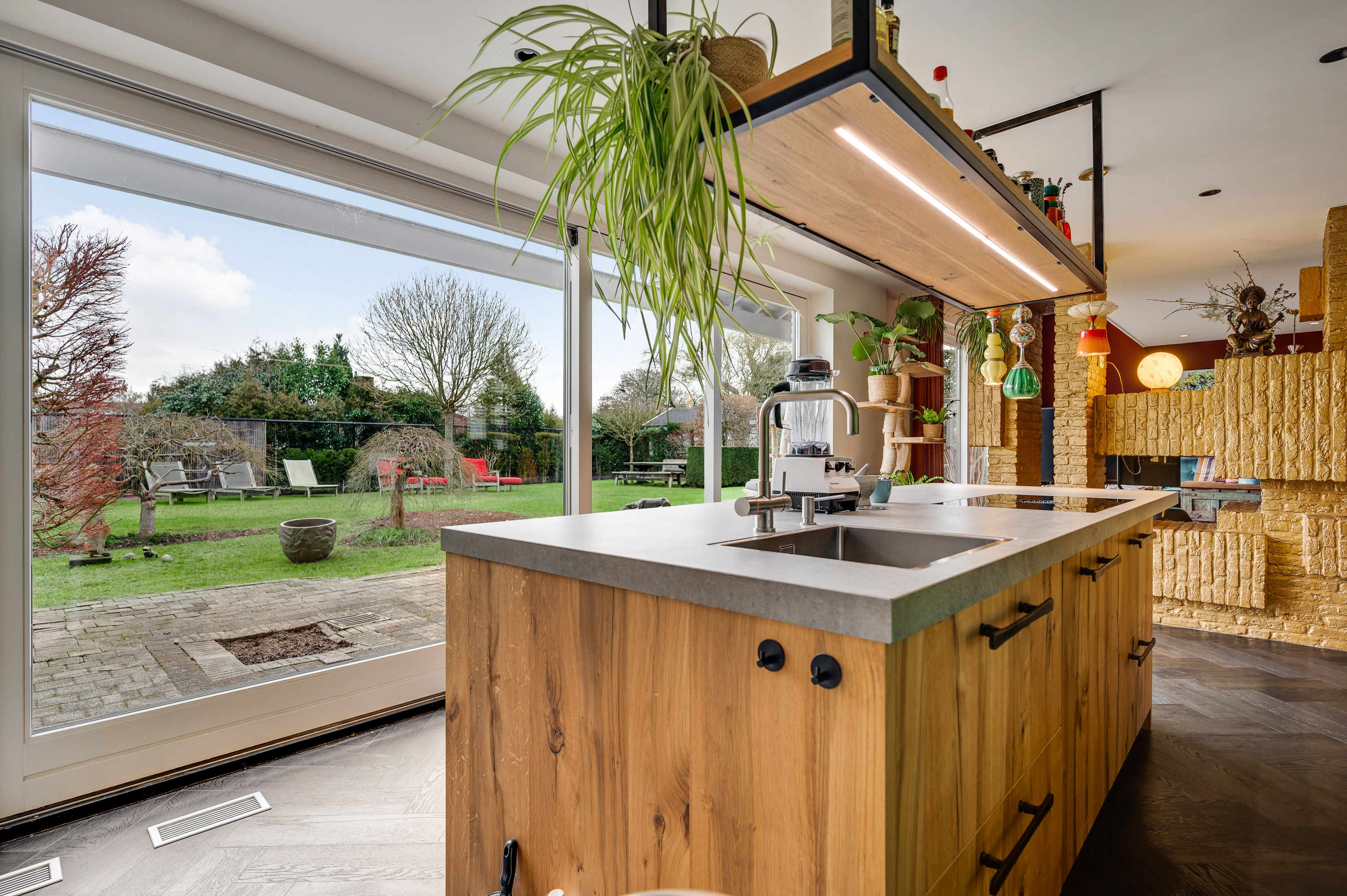 The spacious kitchen-diner is a true eye-catcher and fully equipped with all modern conveniences. The cooking island and sleek wall of built-in appliances not only provide comfort but also create a contemporary look. Thanks to the large sliding doors, the garden is easily accessible, allowing indoor and outdoor living to blend seamlessly.