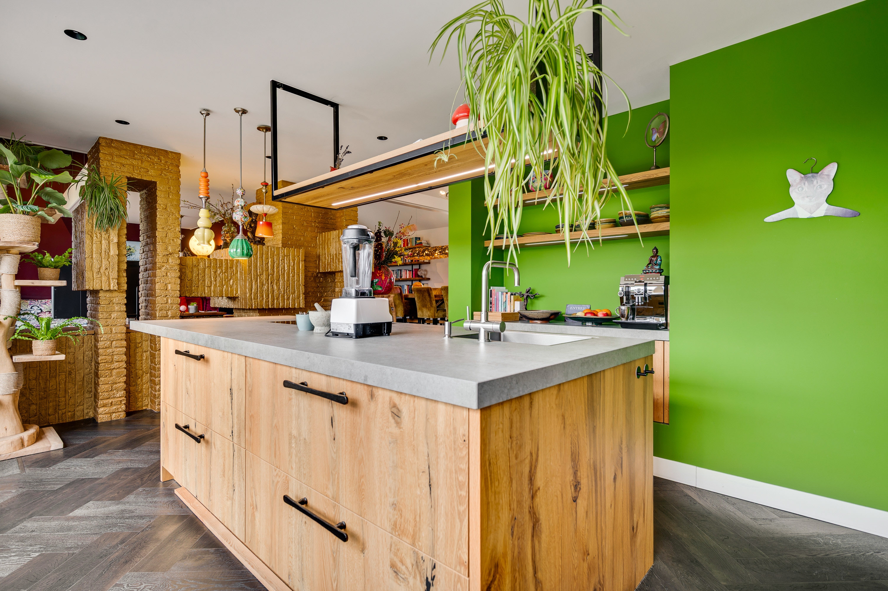 Upon entering, you are welcomed into a bright and stylish entrance hall featuring a wardrobe area and a modern guest toilet. The living room forms the heart of the home and is characterized by its playful layout with a mezzanine, a beautiful walkway, and an inviting fireplace feature. Large windows and a sliding door provide an abundance of natural light and a direct connection to the garden. The architectural room divider adds both character and functionality to the space.