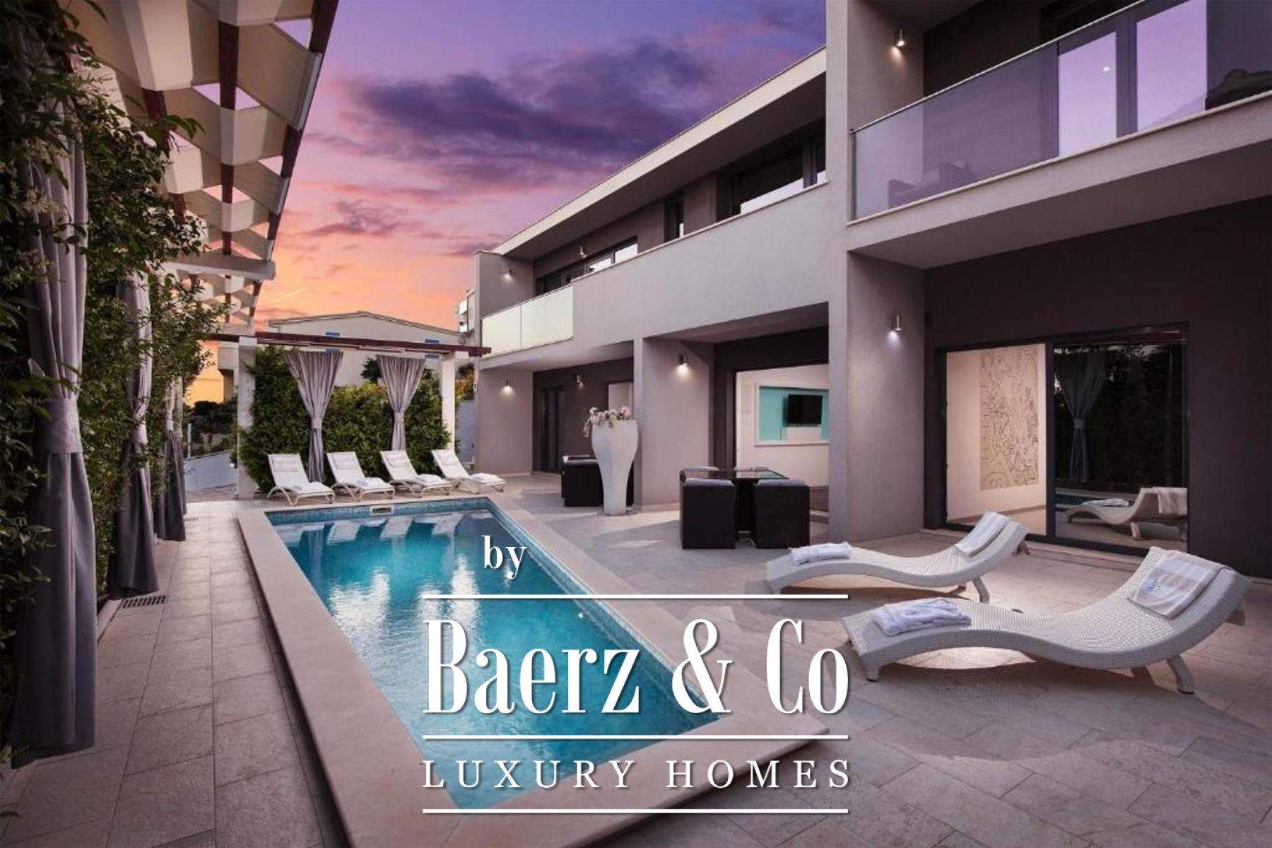 The upper level presents a luminous living space with a kitchen and dining area, two bedrooms, and two bathrooms, with each main room connecting to balconies oriented towards sea and pool views. Flexibility is integral, as the first floor can be separated into independent apartments to suit a range of lifestyles or hospitality needs. Refined finishes and premium furnishings underscore every detail, while thoughtful amenities include a tavern with barbecue, an inviting space for dining and gathering, and a sunlit yard. Three parking spaces complete the picture of relaxation and opportunity in Croatia’s coastal landscape.