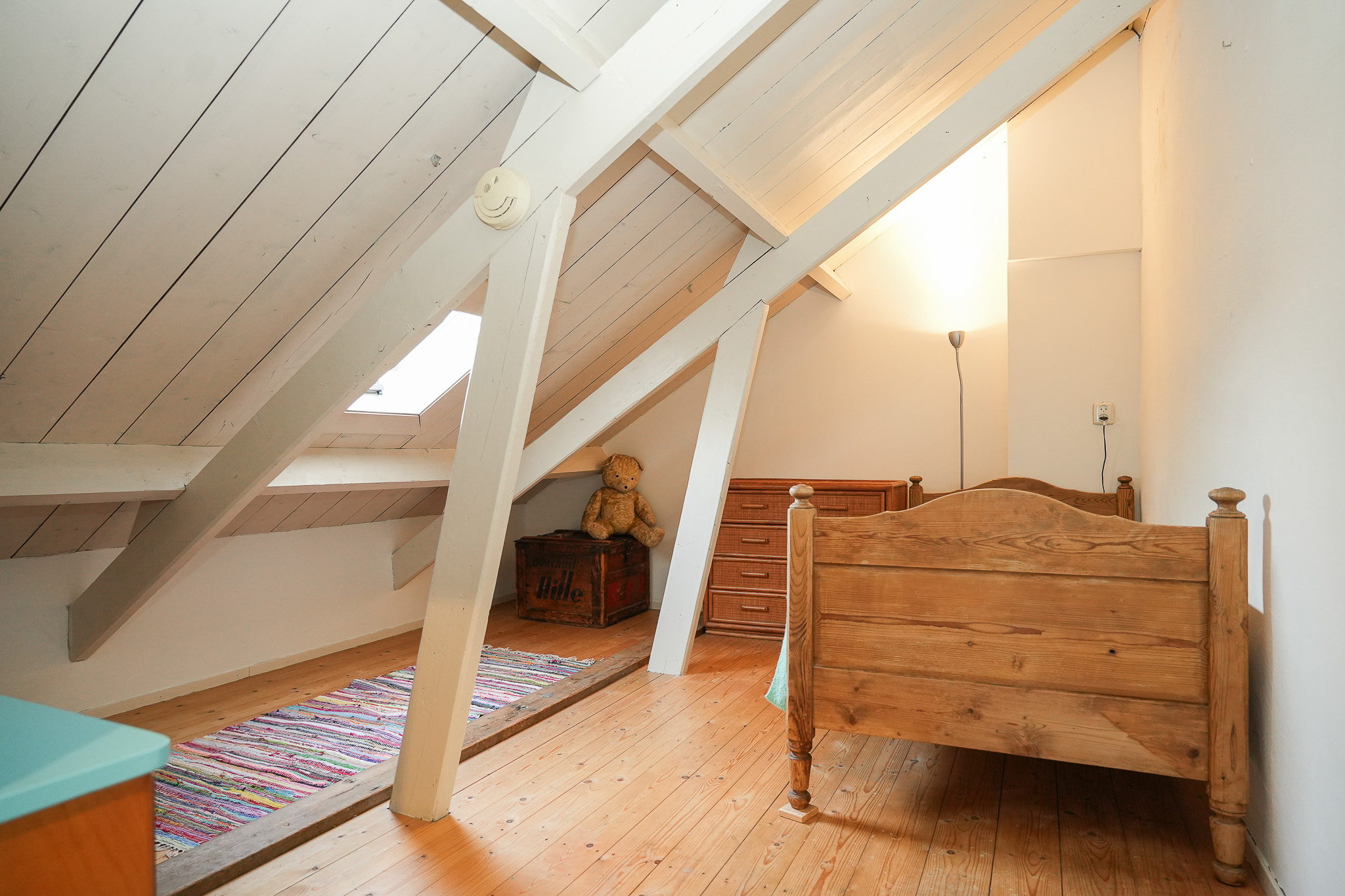 Via een steile trap is de ruime bergzolder bereikbaar, gelegen onder een geïsoleerde kap.