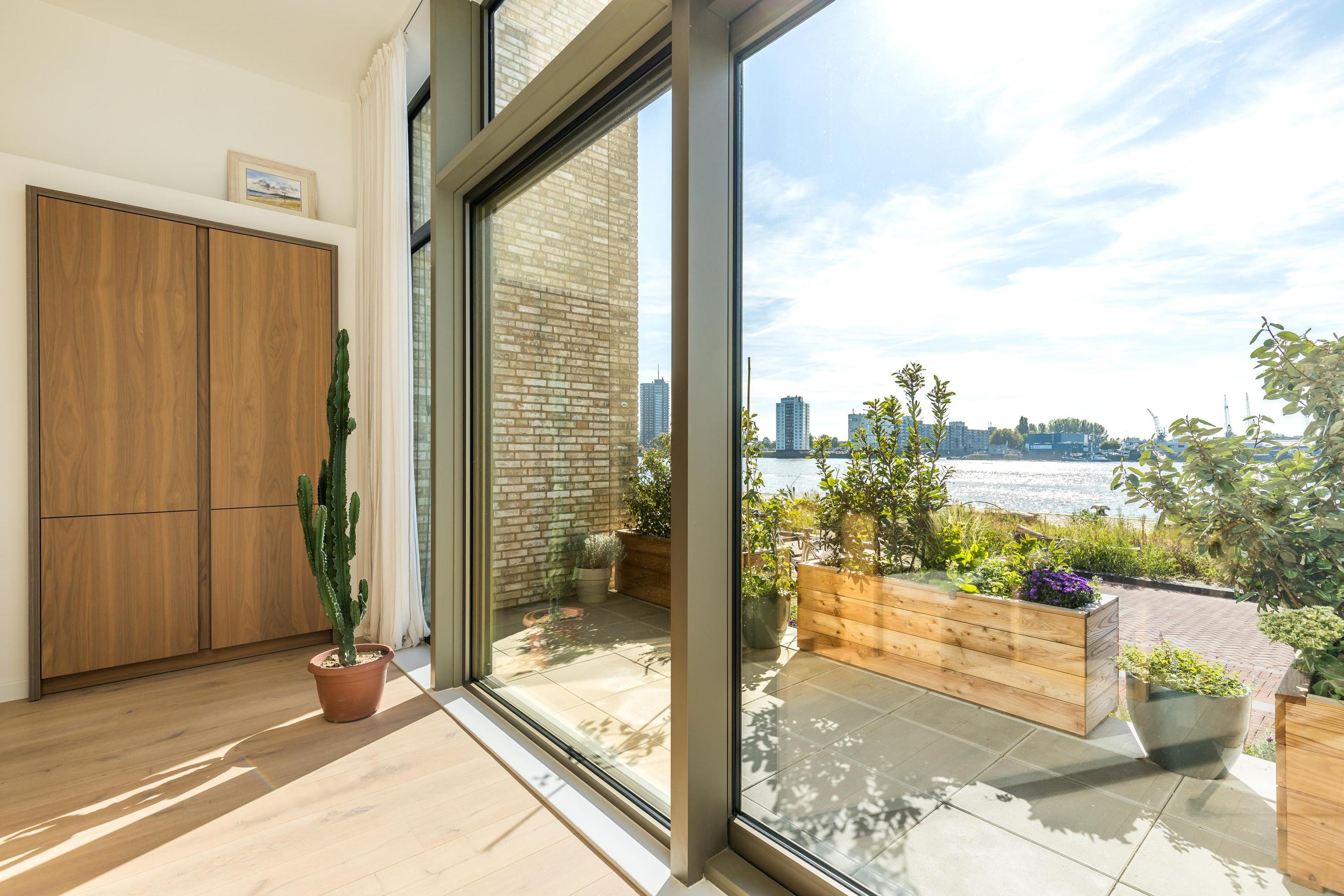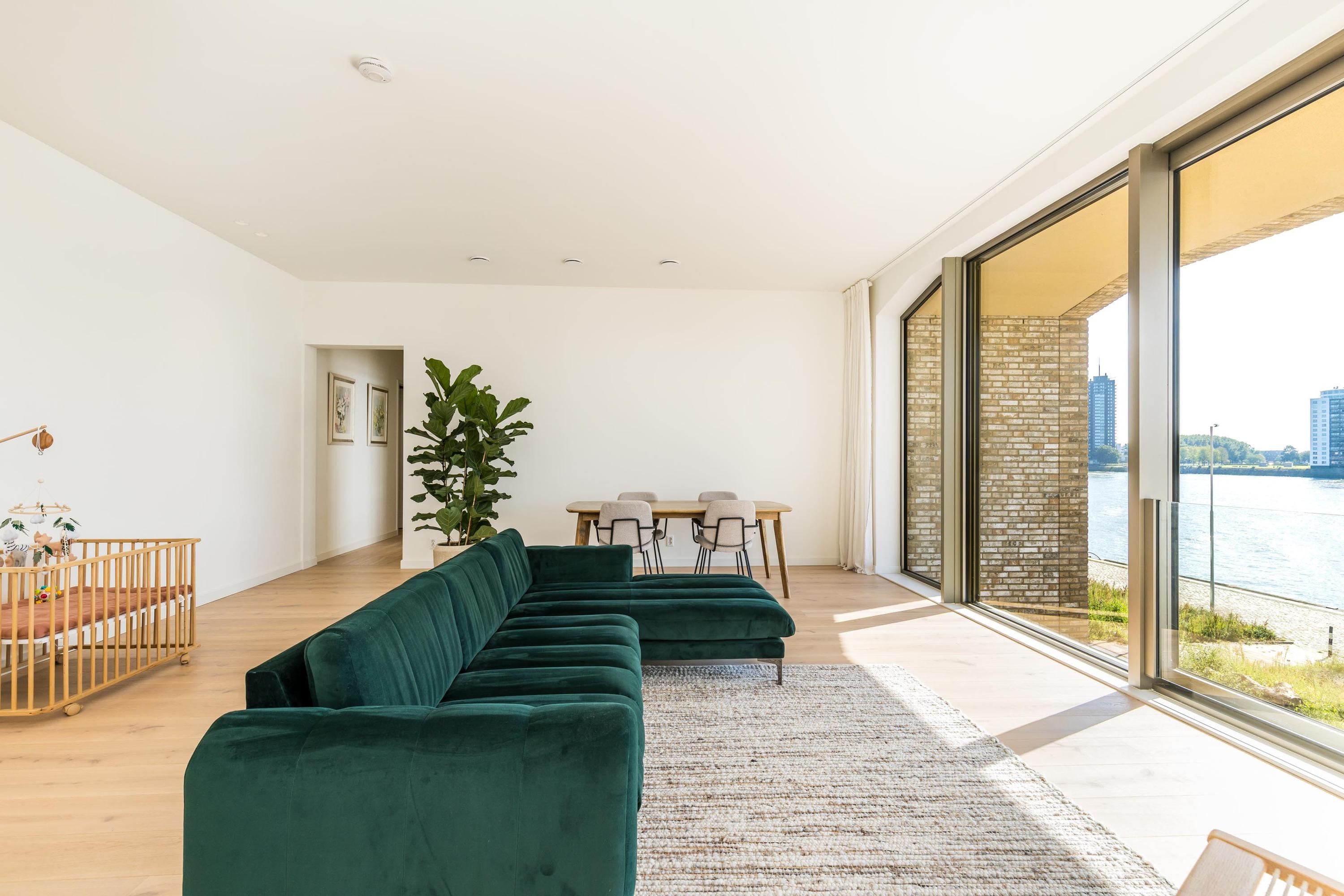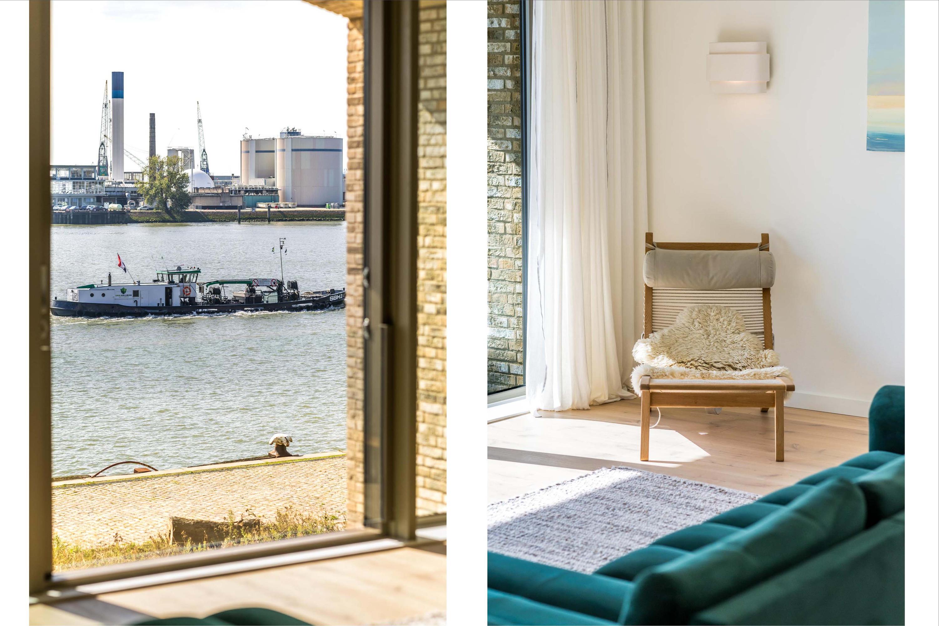 A living painting in your window every day: this spacious and stylishly finished apartment on the Lloydkade offers luxury, space, and panoramic views of the Maas River from sunrise to sunset.