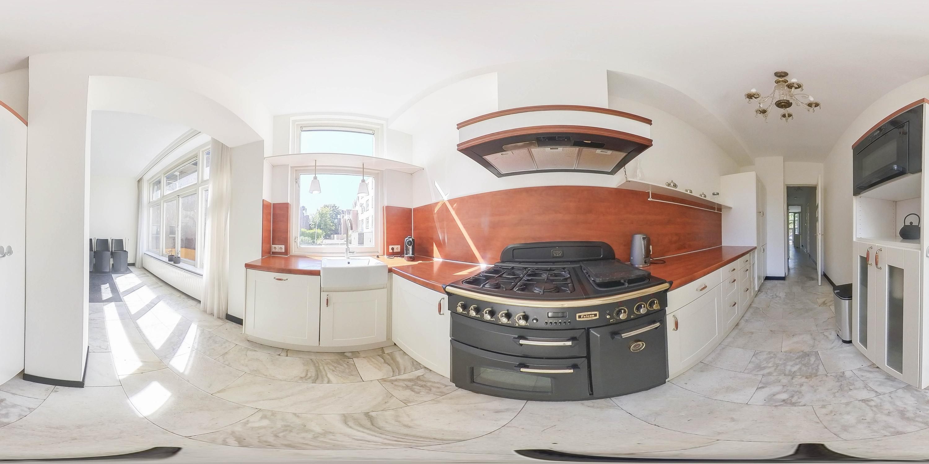 Bij binnenkomst kom je in de imposante entree met marmeren tegels. Vanuit hier is de lange hal met toilet en trapkast toegankelijk, die het leefgedeelte verbindt. Direct valt de hoogte van de plafonds op. De woonkamer van 14 meter lang is momenteel ingedeeld in een zitgedeelte aan de voorzijde en een eetgedeelte aan de achterzijde, met toegang tot de halfopen keuken. Door de ruime indeling heb je voldoende mogelijkheden om de ruimte helemaal naar eigen smaak in te richten. Voorheen was het souterrain bereikbaar via een trap in de eetkamer, maar het is ook mogelijk om deze verbinding opnieuw te realiseren. De keuken is uitgerust met een 5-pits gasfornuis met oven, afzuigkap, vaatwasser, spoelbak en koel-vriescombinatie. Dit is een heerlijke plek waar je tijdens het koken interactie kunt hebben met je gezelschap.