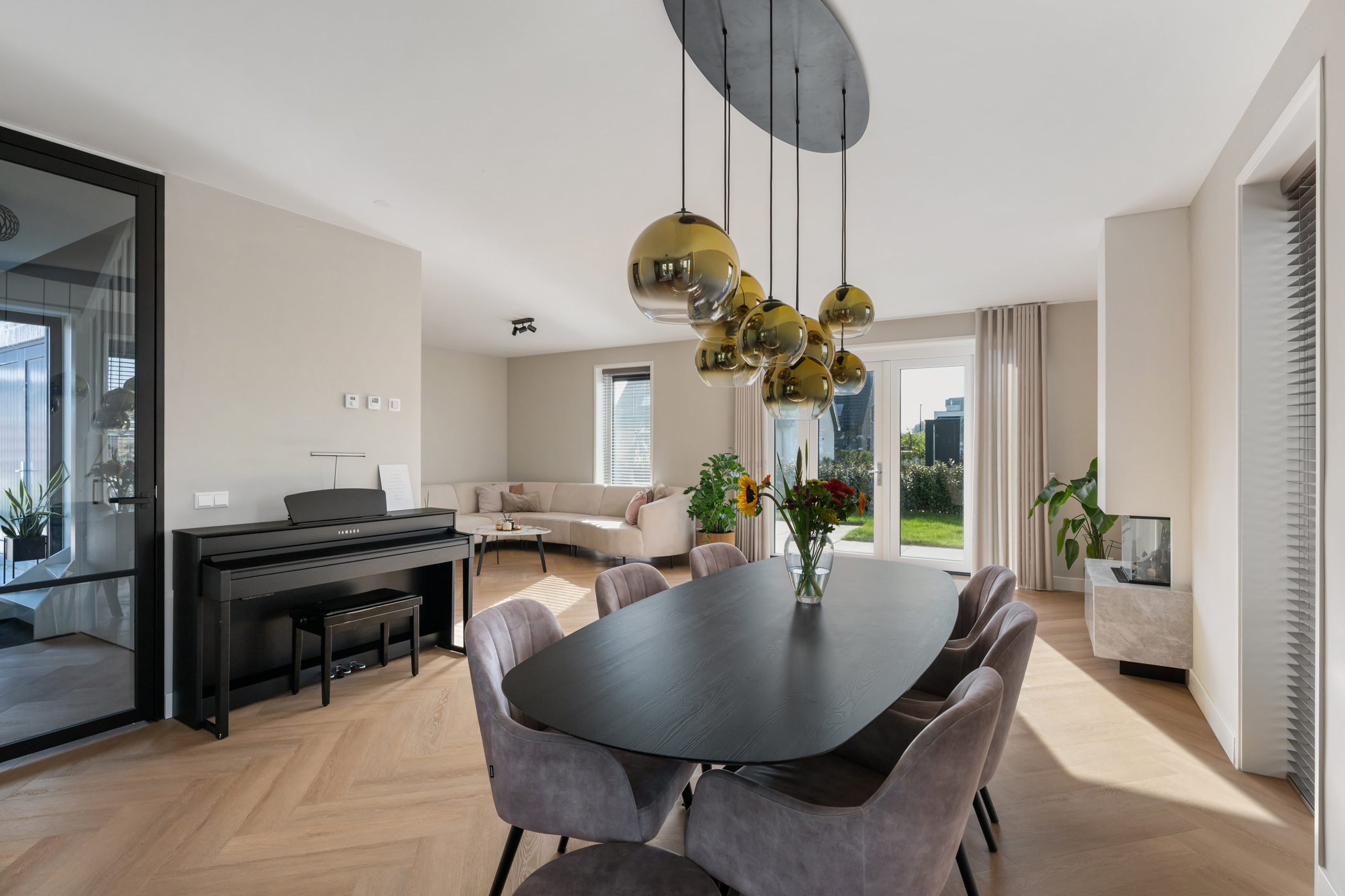 The bright and spacious living room is located at the rear of the house and includes a modern electric fireplace. At the front is the generous open-plan kitchen with a stylish cooking island.