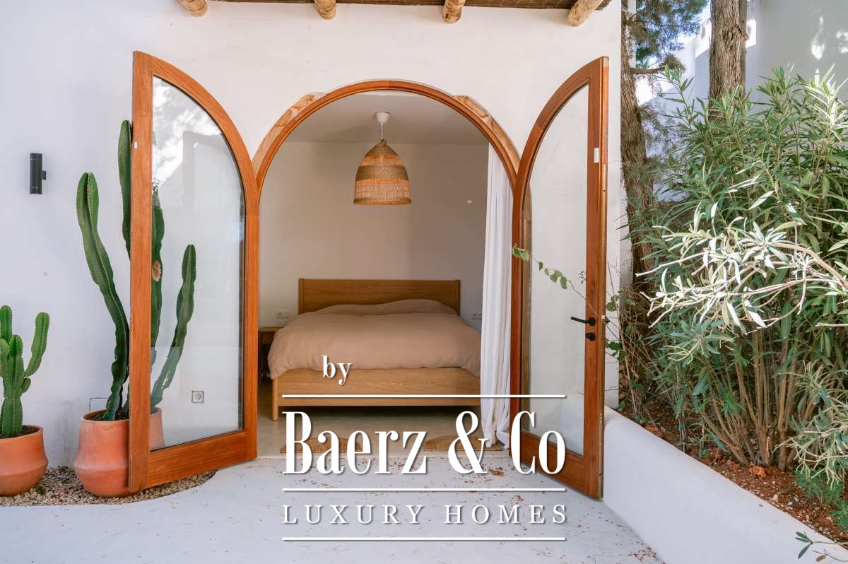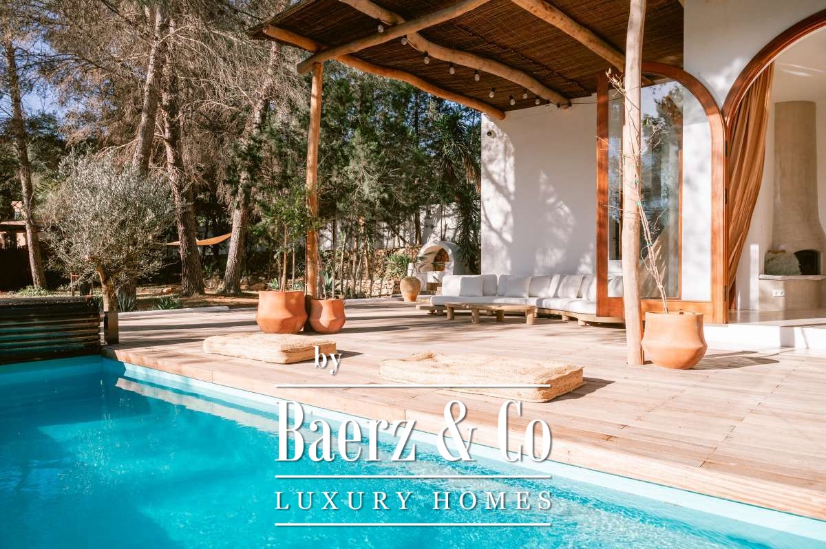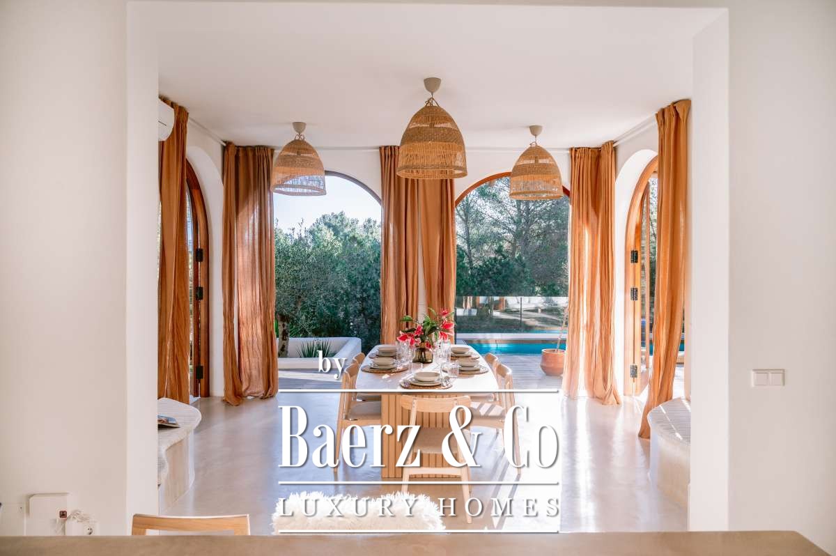 Villa San Agustín Spain connects privacy with effortless outdoor living amid a tranquil forested landscape. This fully renovated villa, with a built area of 175 m² on a private plot of 1,783 m², embraces the enduring spirit of Ibiza while remaining close to local restaurants and some of the west coast’s revered beaches. The setting blends seclusion and centrality, surrounded by the verdant beauty of San Agustín.