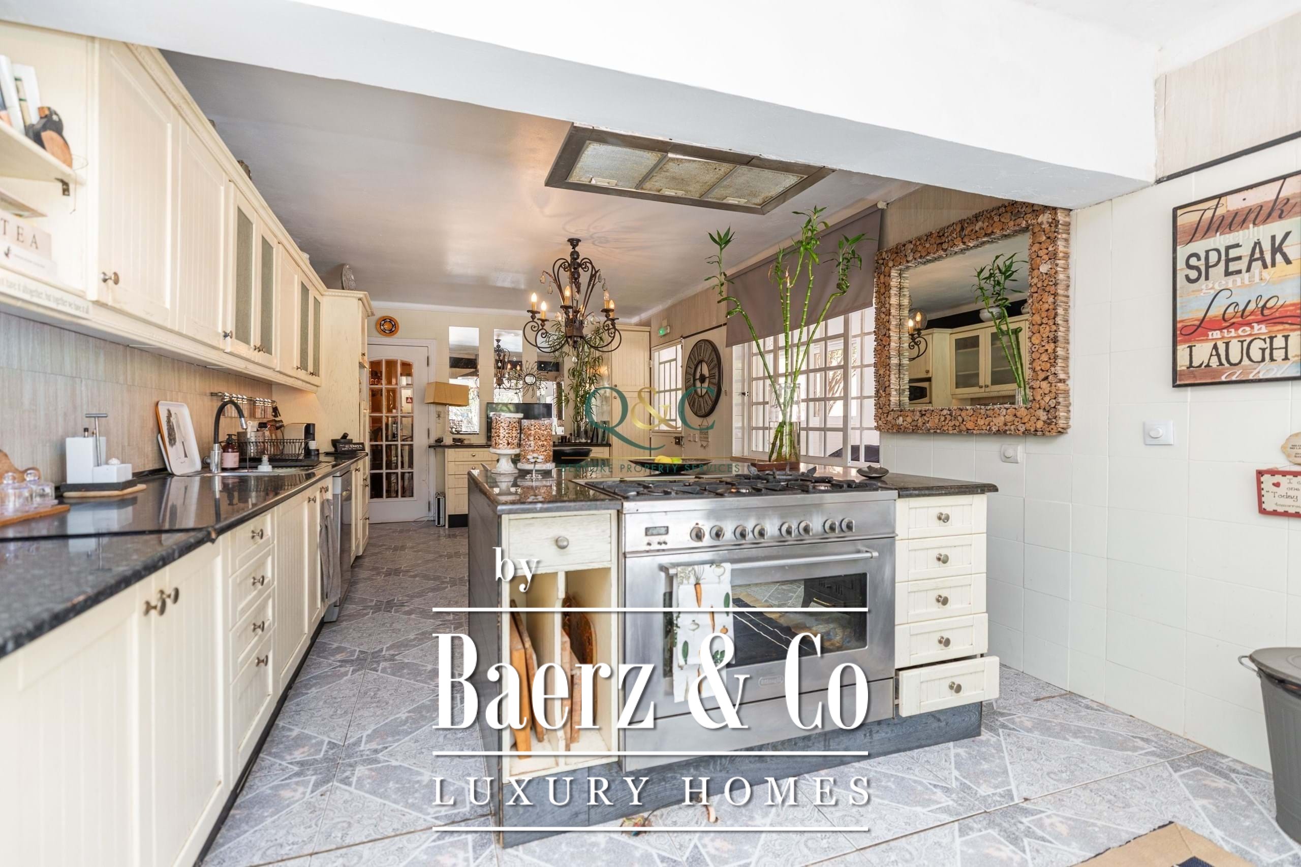 Set behind electric gates, the fully enclosed gardens provide a variety of inviting spaces for both relaxation and entertaining. From the driveway with ample parking, steps lead up to a covered main terrace and double doors opening into a grand entrance hall. This flows into a bright sitting room with fireplace and sliding doors back onto the terrace, as well as a semi-open dining room. A sweeping staircase adds a touch of grandeur, leading to the upper floor.