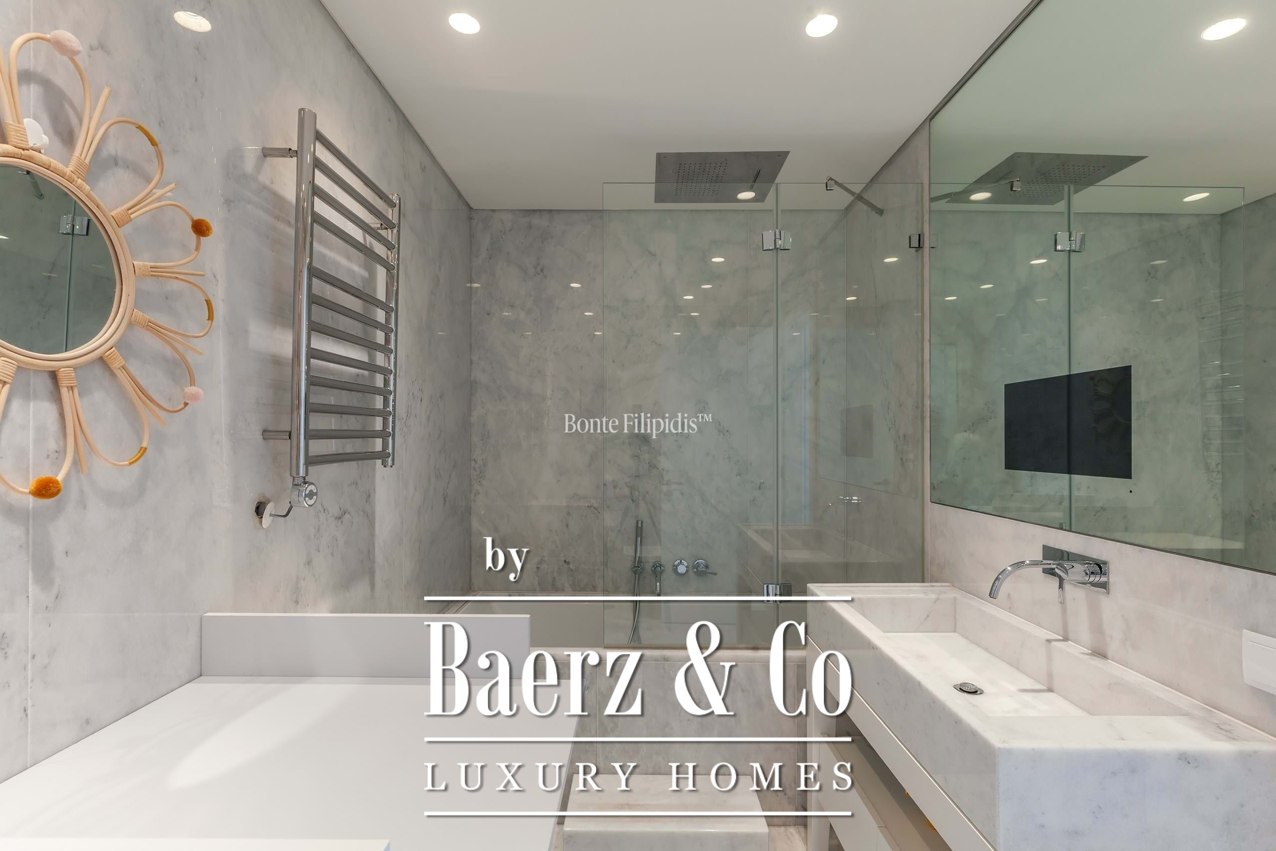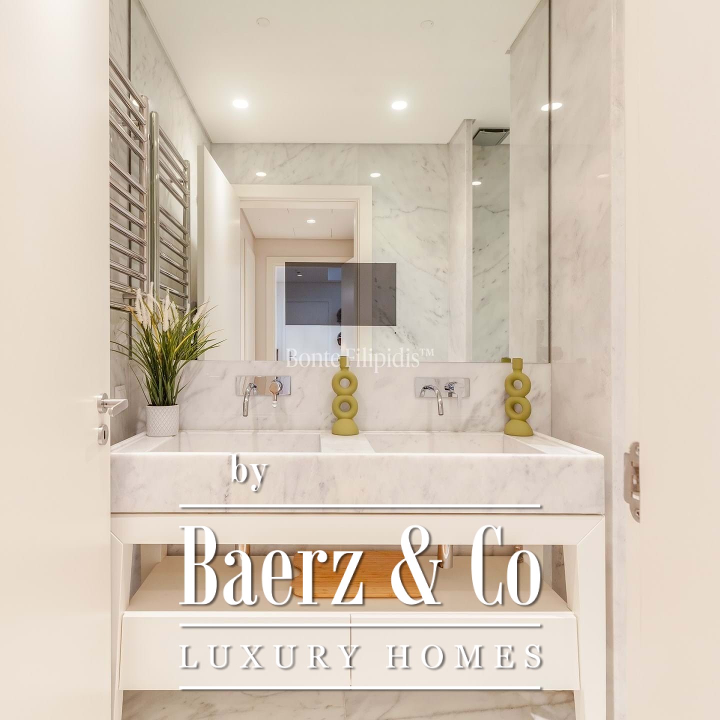 Originally a four-bedroom penthouse, one of the bedrooms has been transformed into a spacious walk-in closet adjoining the master suite. Spanning 197 sqm of interior space, the lower level houses the bedrooms, four bathrooms, and a balcony, all bathed in natural light from large windows that frame breathtaking views of Lisbons castle.