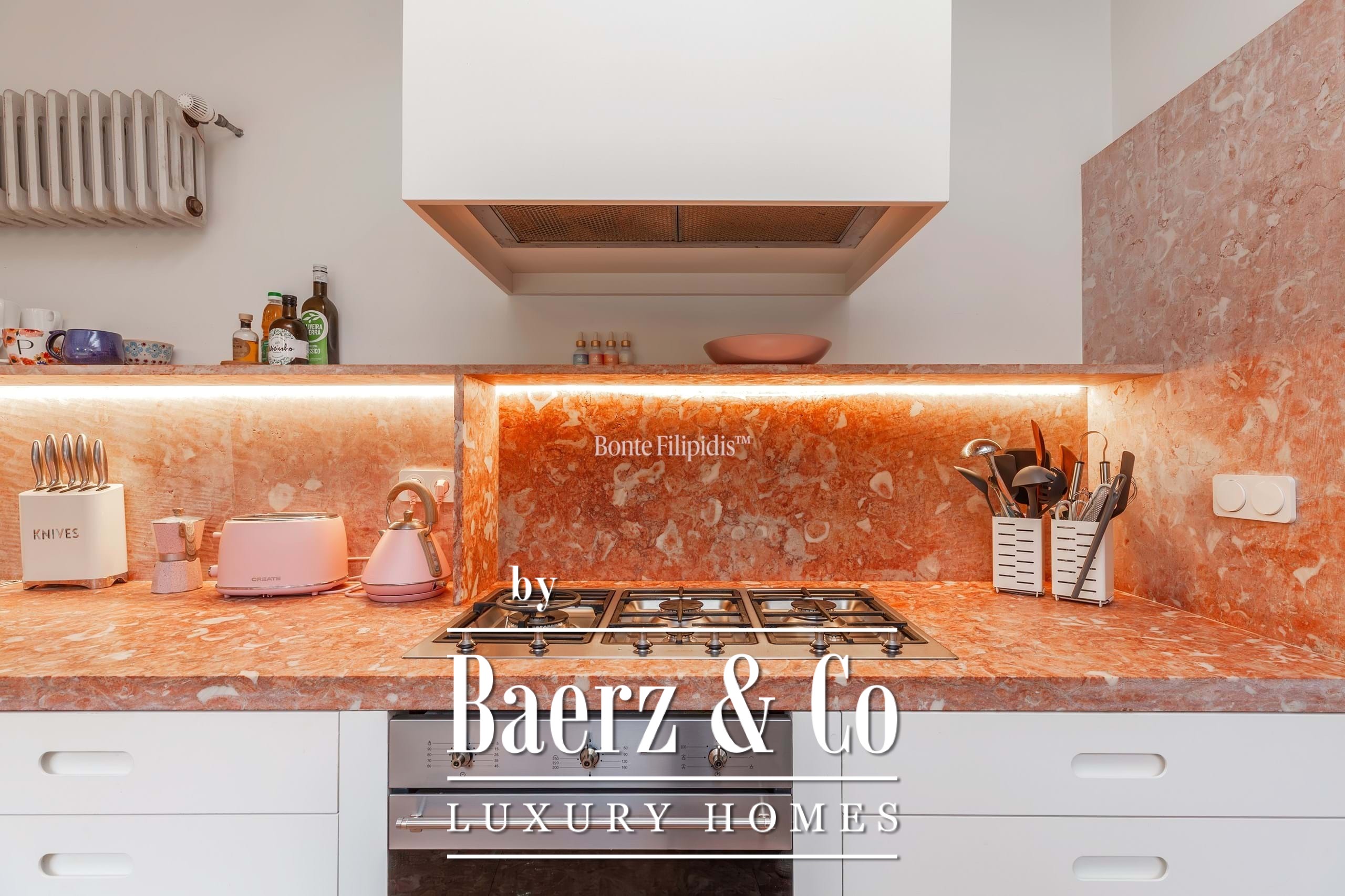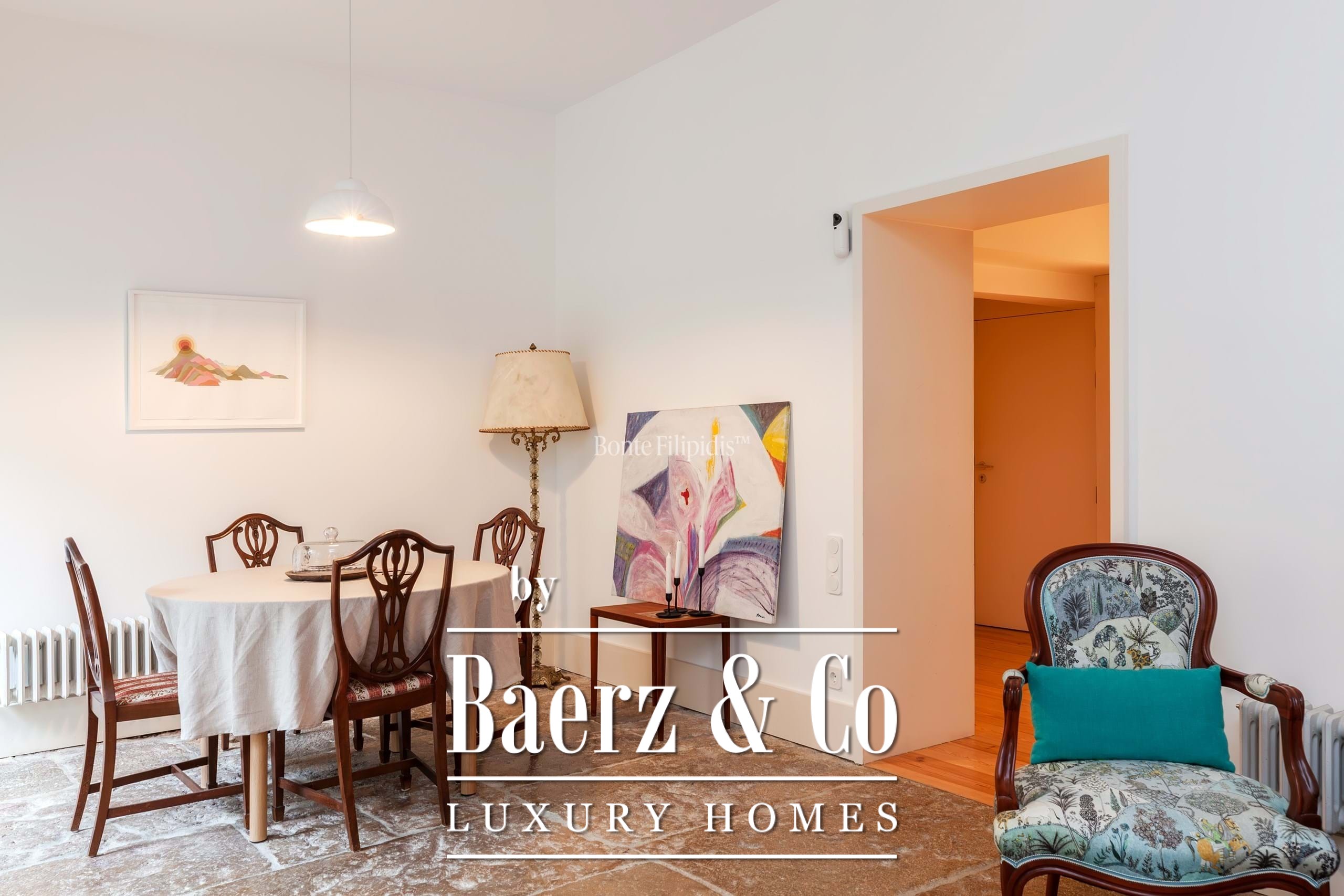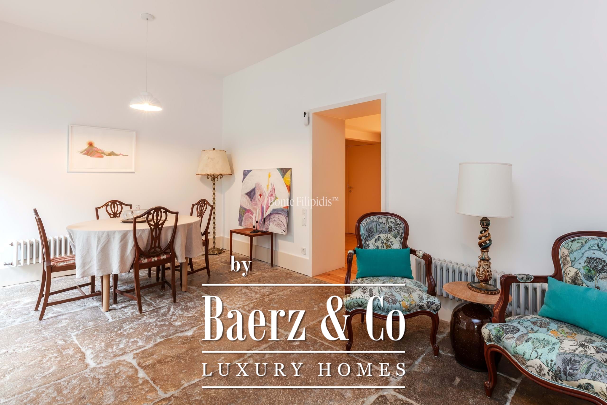 The primary living spaces are marked by original stone flooring and softly vintage accents, with large panoramic windows drawing natural light into the open-plan social area. Here, living and dining zones flow seamlessly out to an 80 m² private garden, a tranquil retreat bordered by mature greenery for quiet moments or reserved gatherings. Subtle material choices and precise detailing lend an understated sophistication to every space.