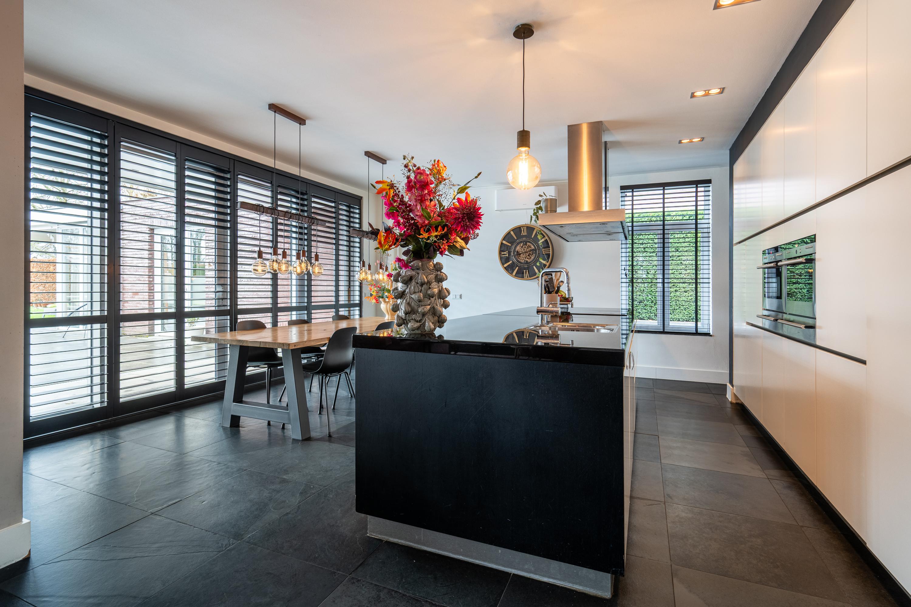 The impressive entrance/hallway offers plenty of space and access to the meter cupboard, toilet, cloakroom, utility room, and office space (approx. 21m²), which could potentially be added to the living room. A modern pivot door leads to the living area. The spacious living room with adjoining open kitchen (approx. 73m² in total) exudes atmosphere and luxury thanks to its cozy interior and optimal garden view. There is also a practical air conditioning system and an attractive decorative gas fireplace. The kitchen with spacious cupboards and island is equipped with various built-in appliances and provides access to the utility room (approx. 11m²) behind it, which has a complete second kitchen. Adjacent to the living area is a multifunctional room, currently used as a TV room/game room (approx. 15m²). From here, you can also access an extra room with a shower, toilet, and access to the garden and the room currently used as a practice room. For extra comfort, the ground floor has underfloor heating.