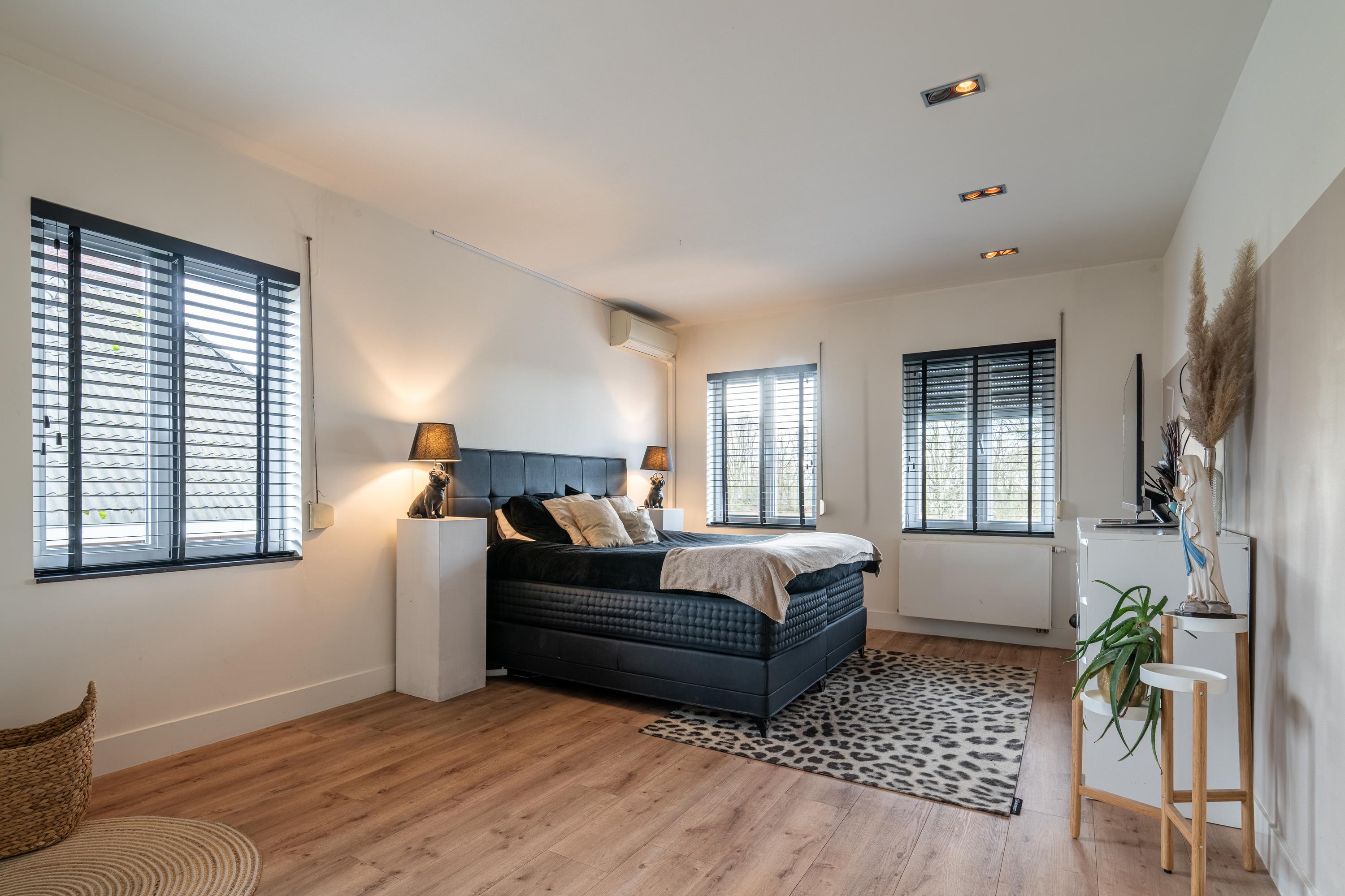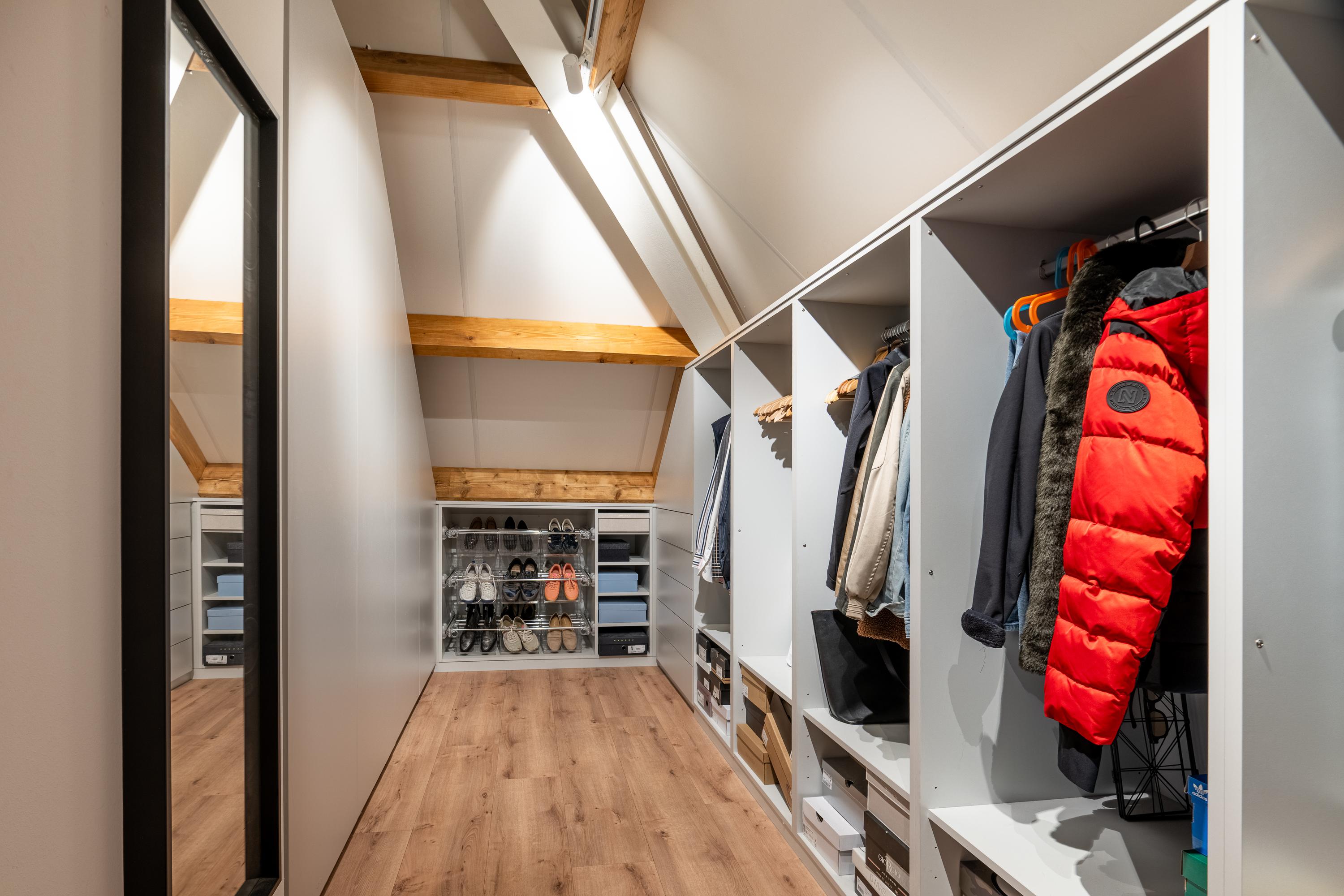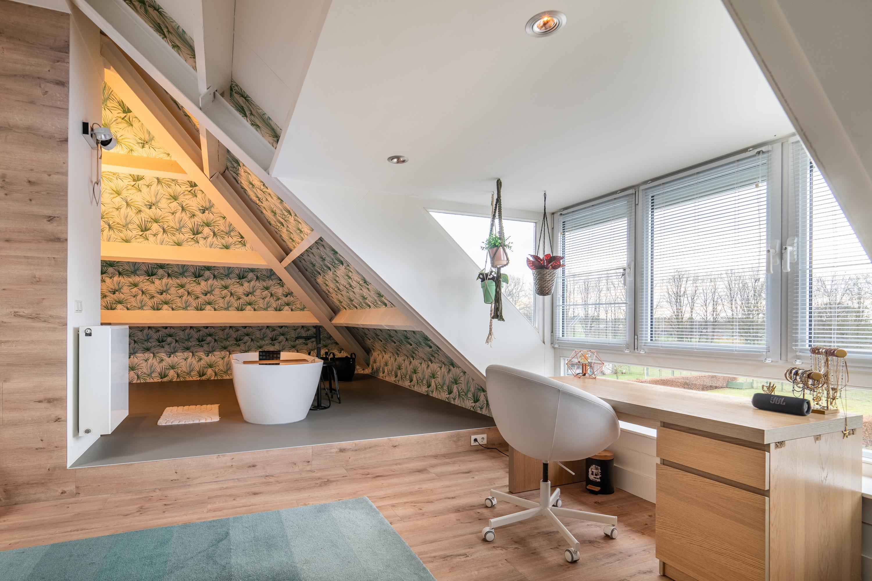A fixed staircase leads to a landing with access to the walk-in closet, the boiler room, and the fourth bedroom with en-suite bathroom. The bedroom (approx. 29m²) has a practical dormer window and therefore offers a beautiful view of the garden. From the bedroom, there is open access to the third bathroom (13.5m²), which is equipped with a freestanding bathtub, double sink, walk-in shower, and toilet. The walk-in closet has custom-made cupboards on both sides.