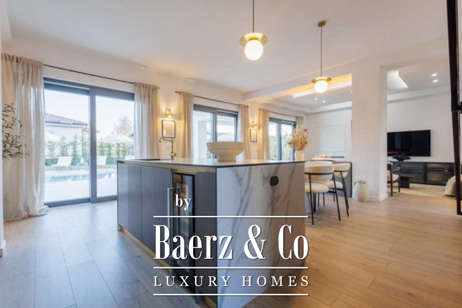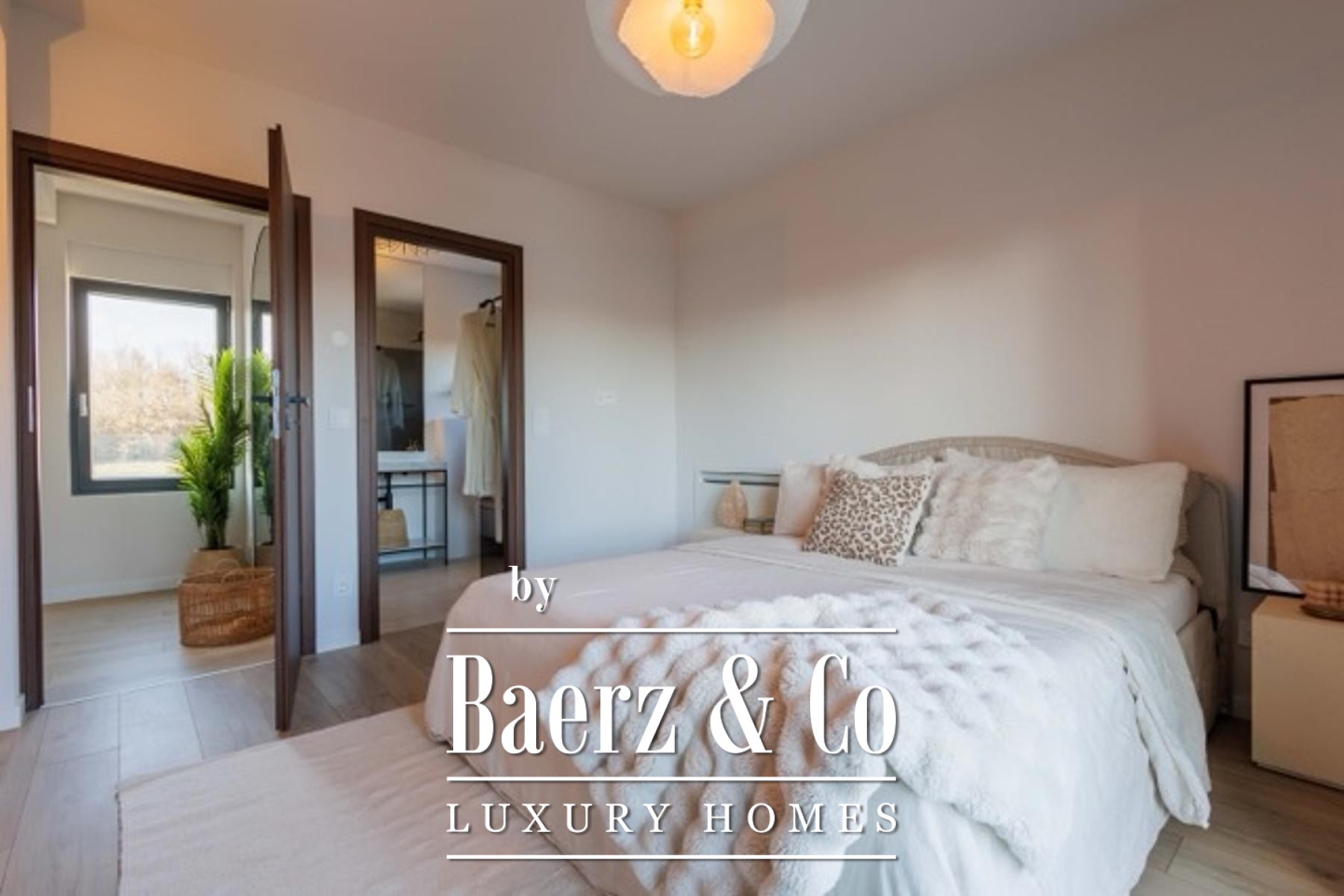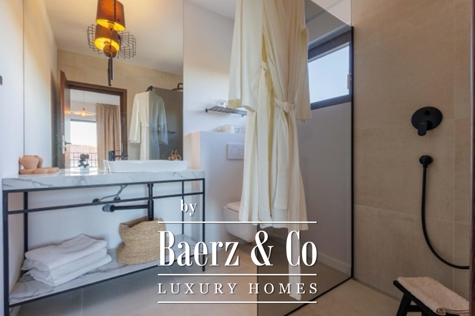 A carefully detailed staircase leads to three spacious bedrooms upstairs, all with en-suite bathrooms and access to a sun-drenched terrace overlooking the landscaped garden and a striking saltwater pool measuring 9 by 11 meters. Large windows showcase the surrounding natural beauty, offering a constant dialogue between interiors and the outside world. The courtyard provides ample parking, reinforcing practicality alongside luxury.