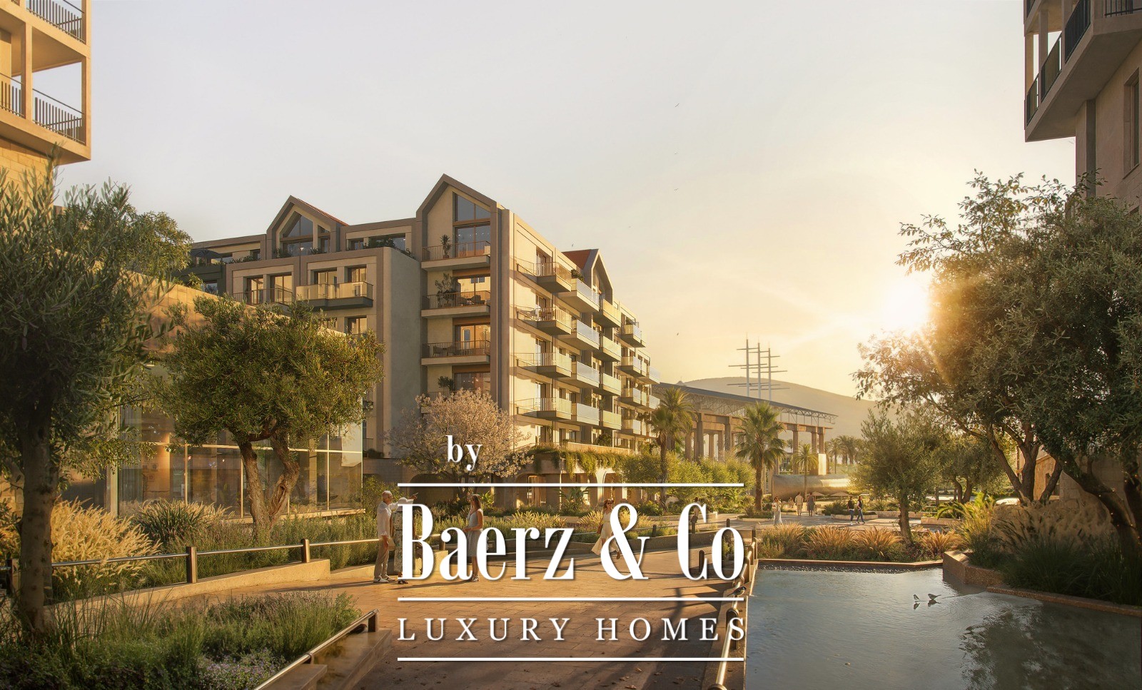 The layout flows from a welcoming entrance hall into a bright living space, where natural light accents clean Mediterranean lines. An integrated kitchen features built-in appliances and wardrobes, framed by panoramic windows that open toward the bay. Amenities include a fully equipped gym, swimming pool, and reception area, elevating daily life with simplicity and comfort. Optional garage parking adds further ease, while a structured payment plan supports both residents and investors.