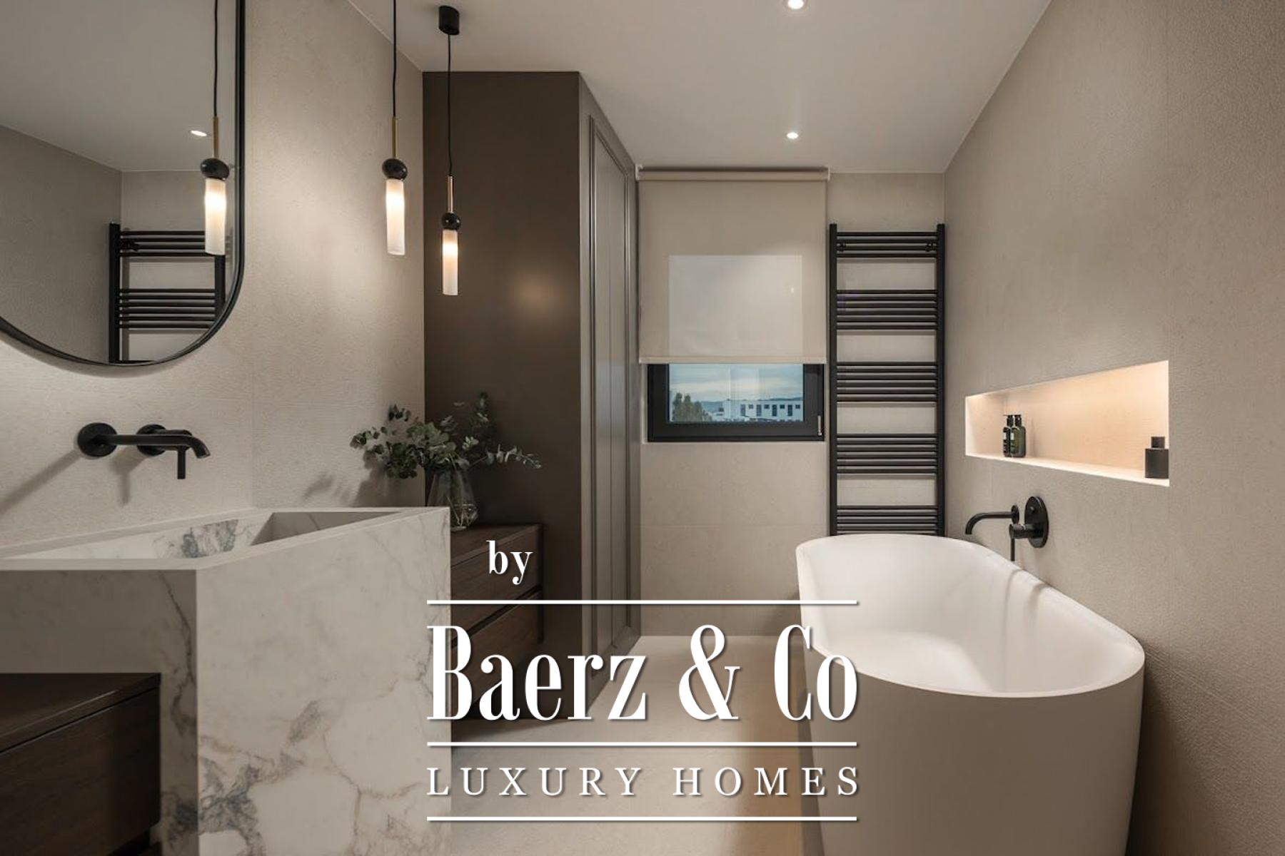From the direct elevator entry connecting the underground garage to the private entrance, the penthouse signals rare intimacy and discretion. The residence features five bedrooms and five bathrooms, each with custom sanitary installations and underfloor heating. The living spaces are enveloped in light, with elegant Chevron Boen parquet, aluminum joinery, triple-glazed windows, and integrated LED illumination imparting a refined, welcoming ambiance.