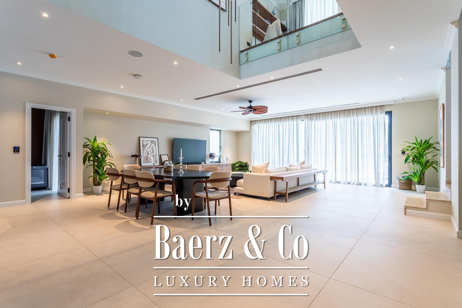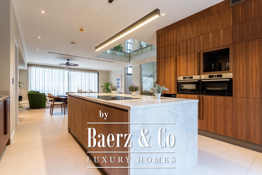 Throughout, designer furnishings and the highest construction standards curate a sense of understated privilege. The villa offers five bedrooms and five bathrooms, with living spaces that invite light and horizon through expansive glazing. At the core, an open plan kitchen and dining area encourage communal gatherings while the living room transitions effortlessly to terraces and a landscaped garden.