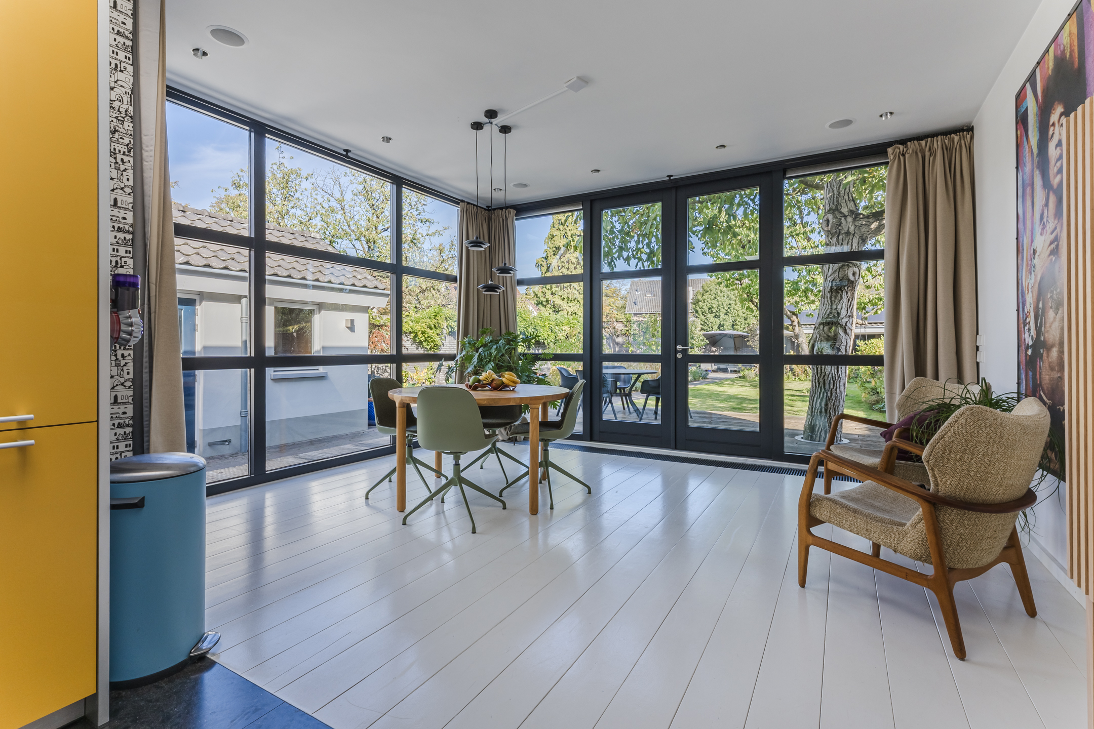 The modern, luxurious kitchen is both stylish and functional, offering generous space and beautiful views of the garden—perfect for relaxed dining. The kitchen is equipped with built-in appliances including a ceramic oven, combination oven-microwave, steam oven, American-style fridge (with water connection) and a Quooker tap. Provisions are also in place for a built-in coffee machine.