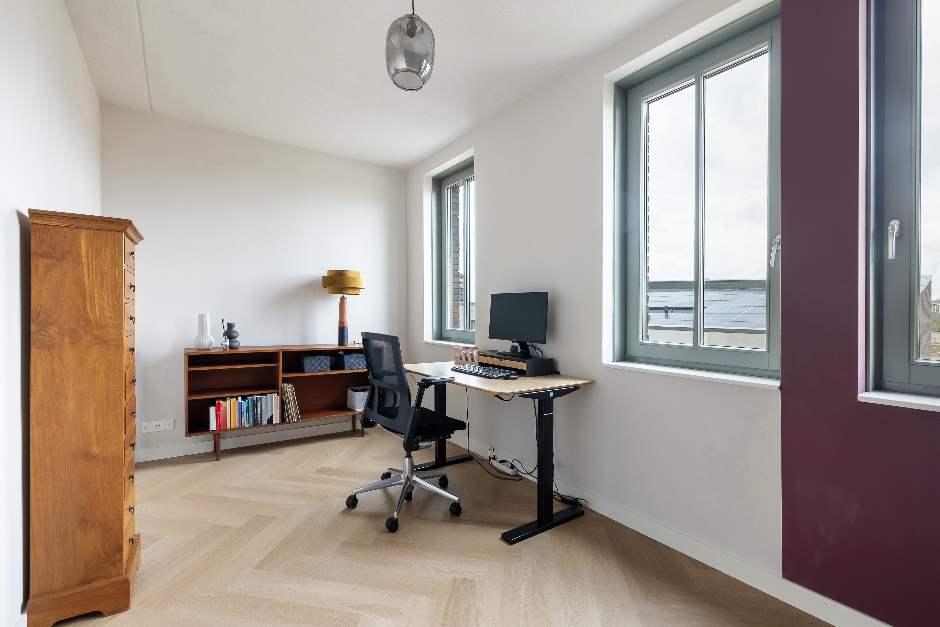 Landing and technical room. At the front is the master bedroom with a beautiful built-in wardrobe. At the rear is currently a large man cave, but this space can also serve as an additional large bedroom. The home is so well insulated that even playing the guitar won’t disturb the neighbours — how perfect is that?