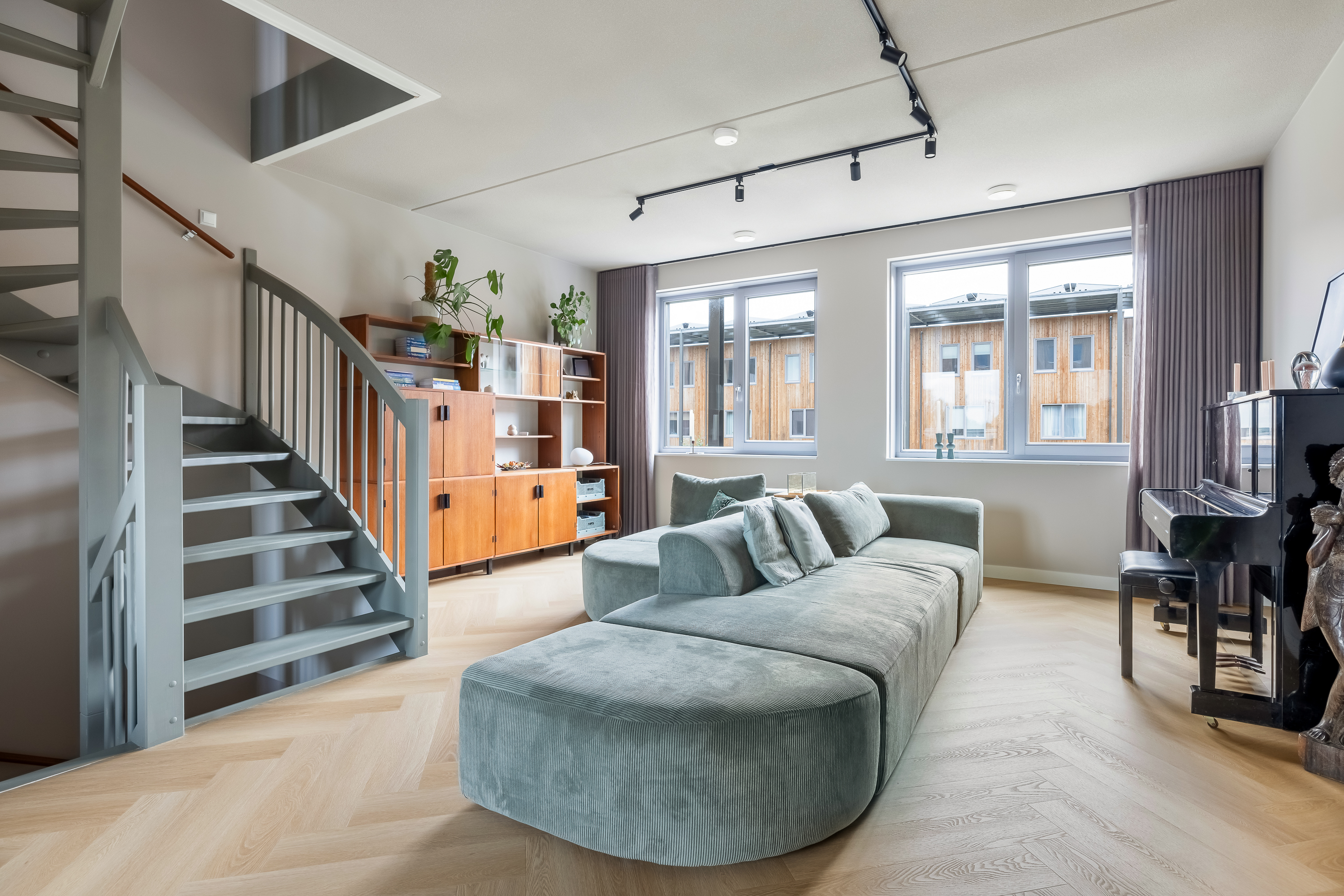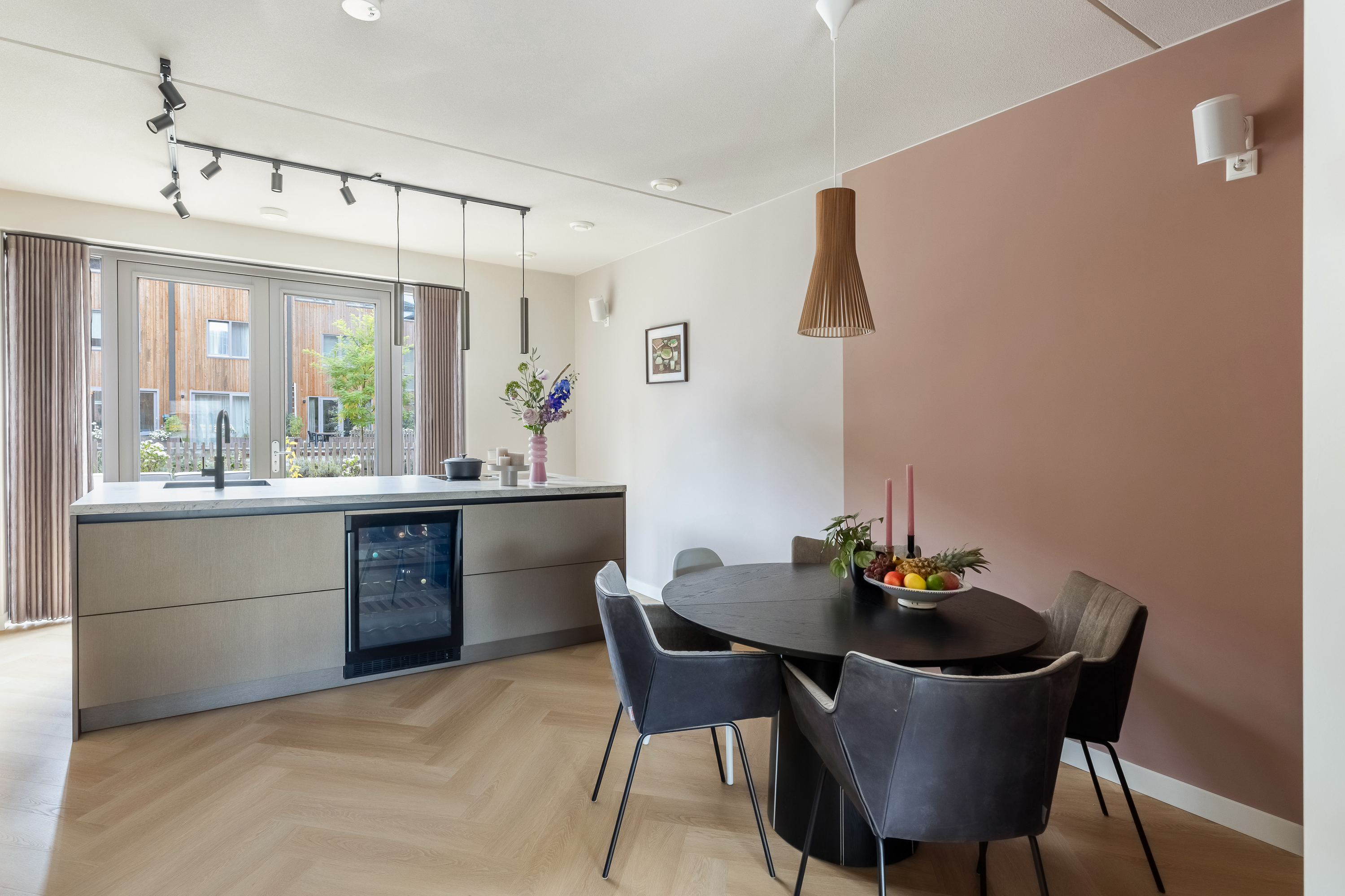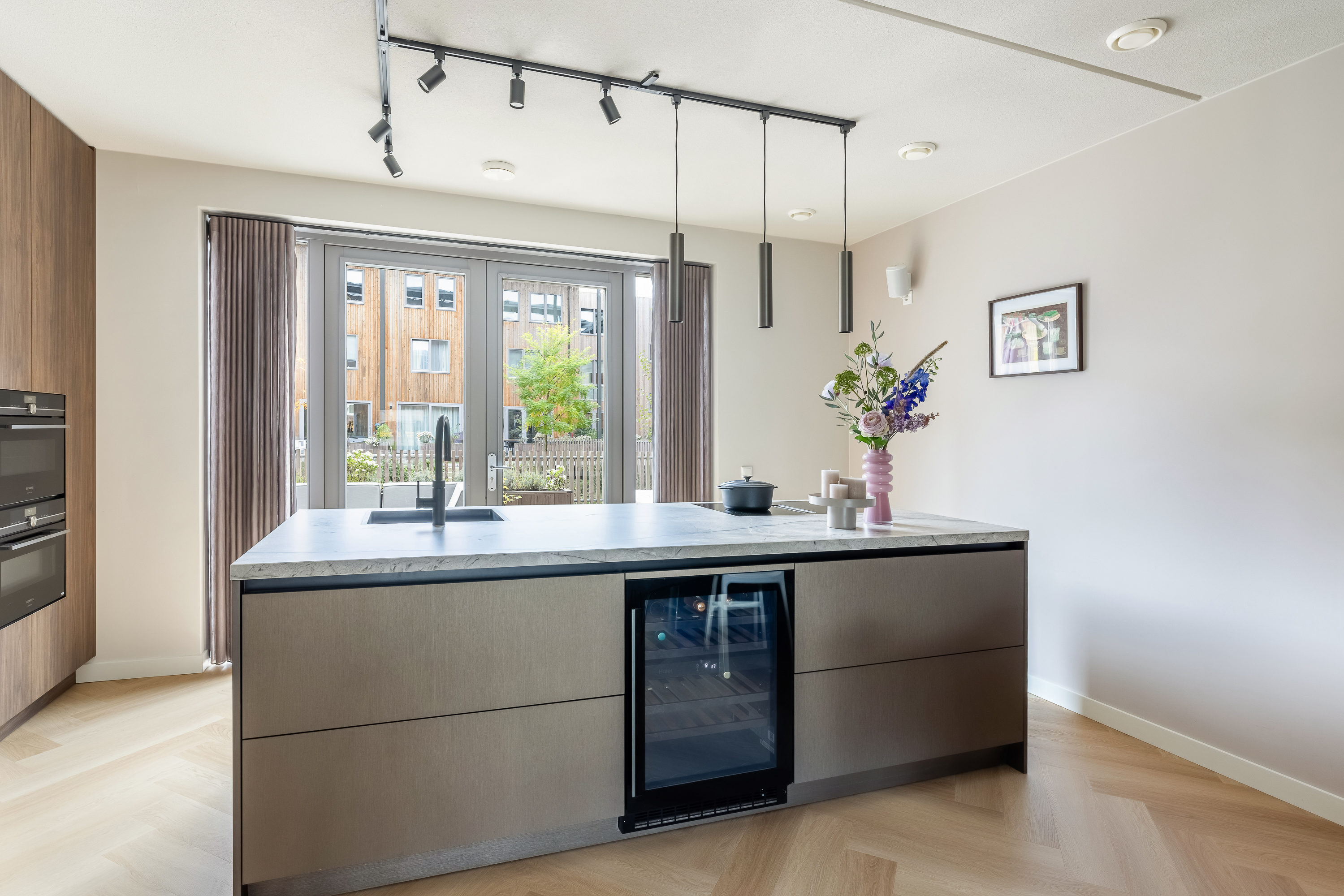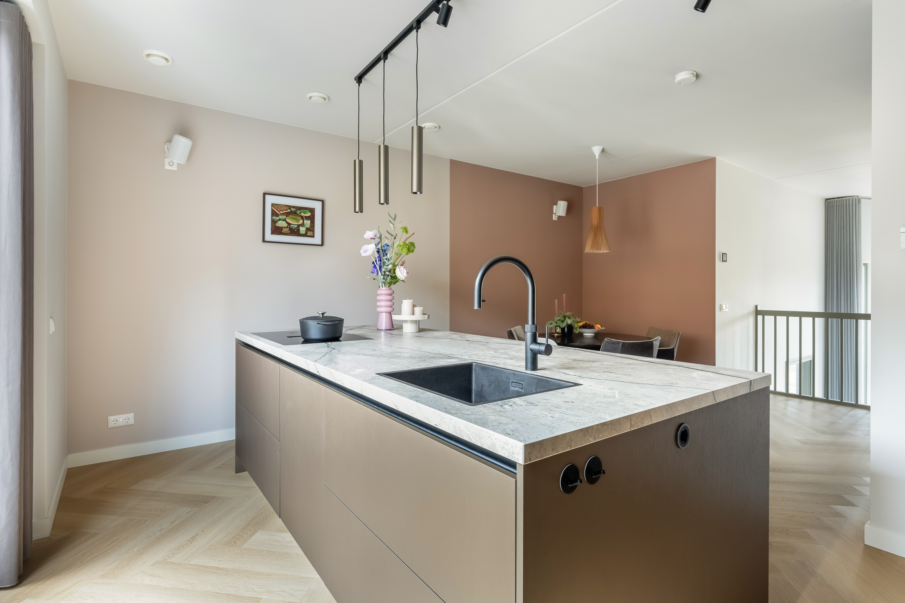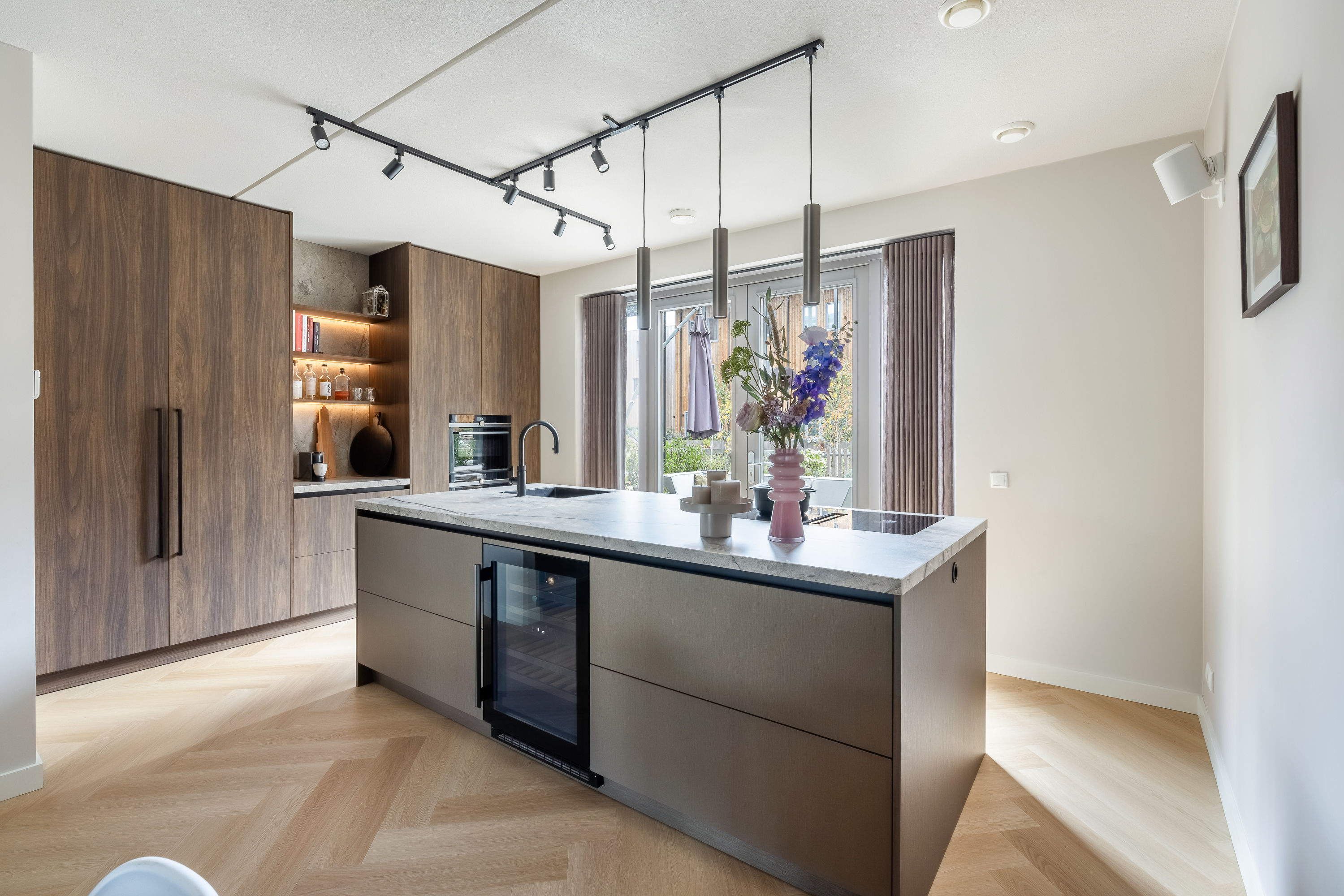 De woning is tot in detail ontworpen. Warm, luxe en eigentijds, zonder koel of afstandelijk te worden. De maatwerkkeuken is een echte leefkeuken. Kasten tot aan het plafond, mooie materialen en goede inbouwapparatuur die met wifi te bedienen is. Je zet de oven alvast aan onderweg naar huis, laat de broodjes bakken voordat je beneden komt en schuift daarna meteen aan om samen te eten. Alles is strak uitgelijnd, nergens standaard, alles klopt. Dit is een huis voor mensen die oog hebben voor detail.