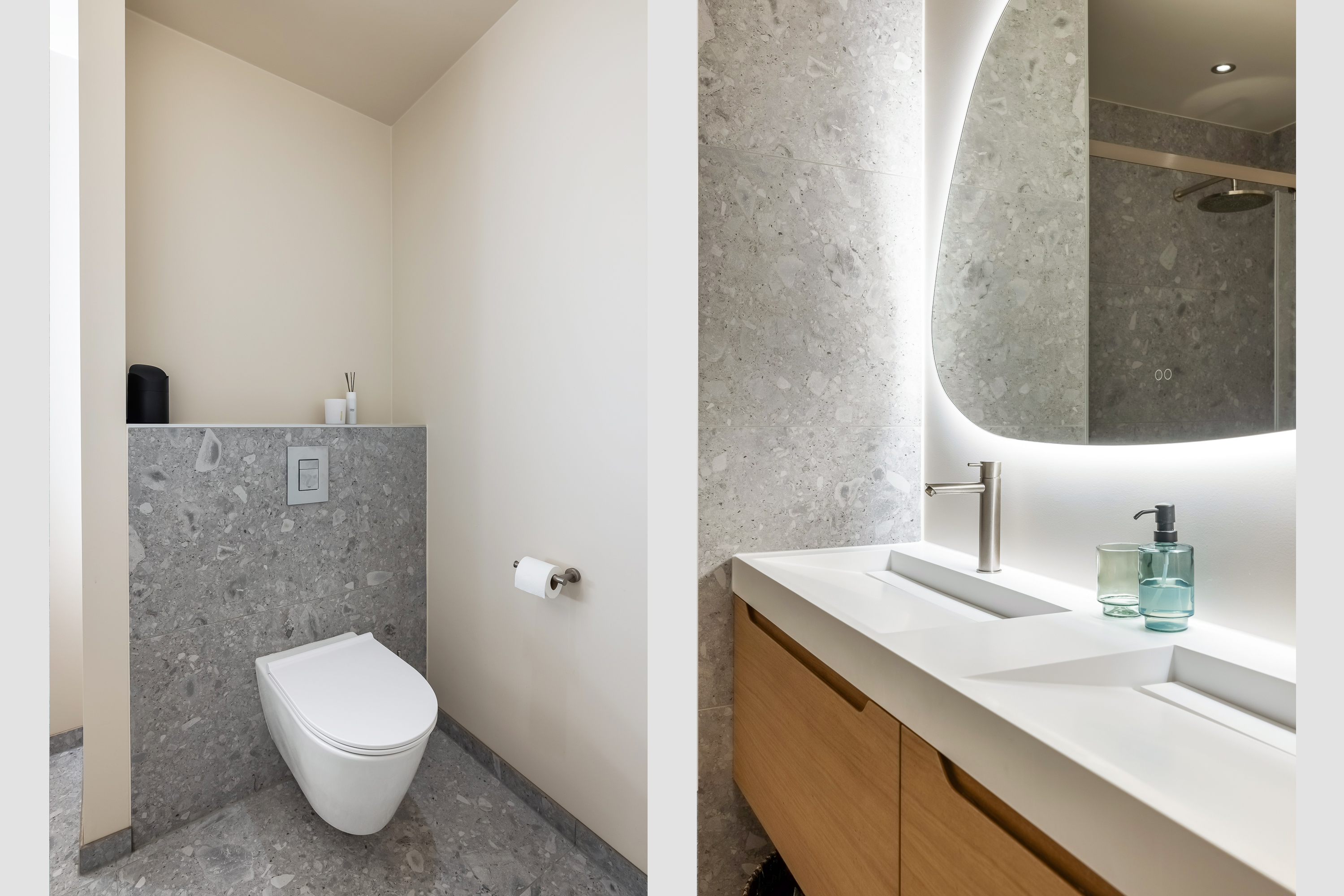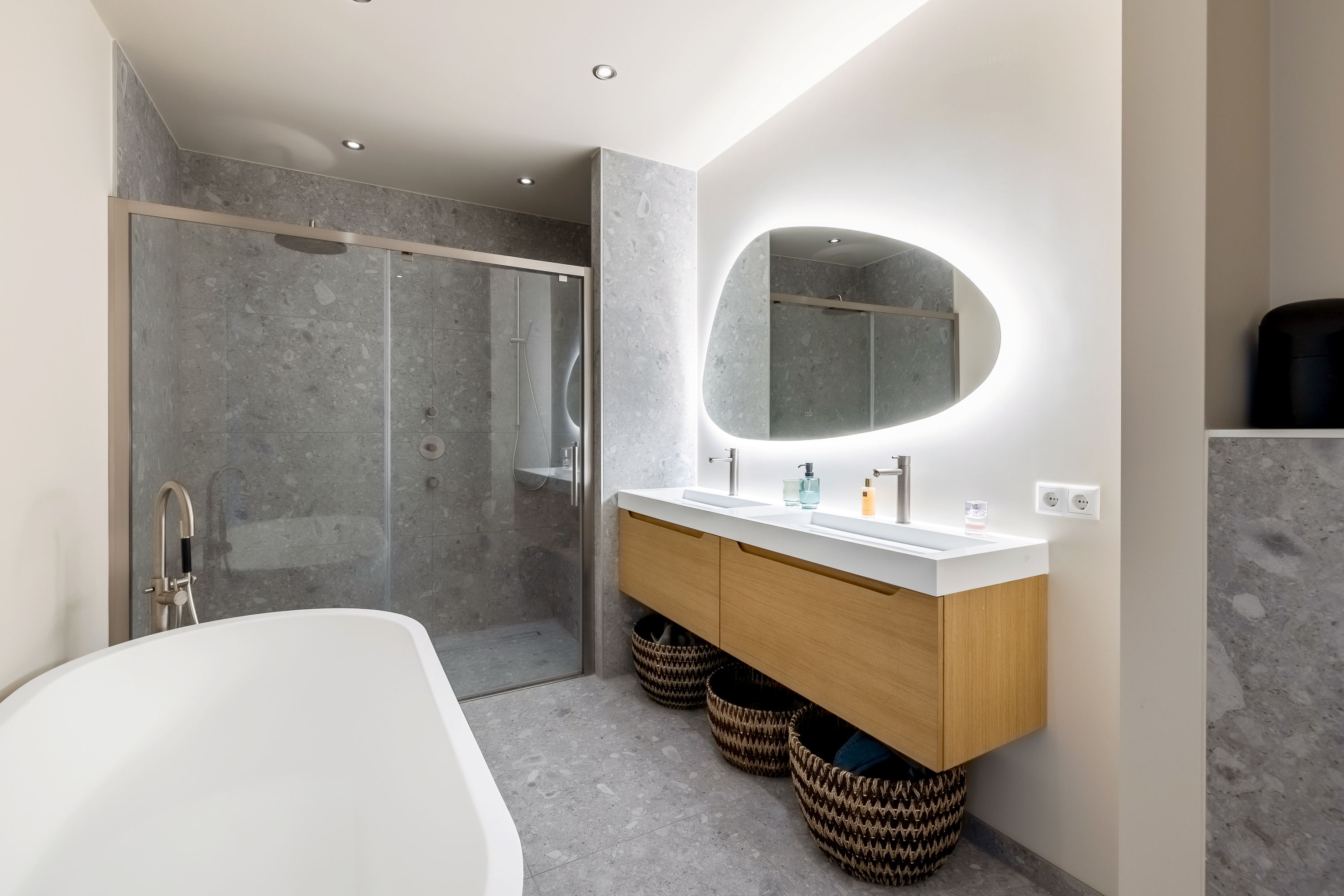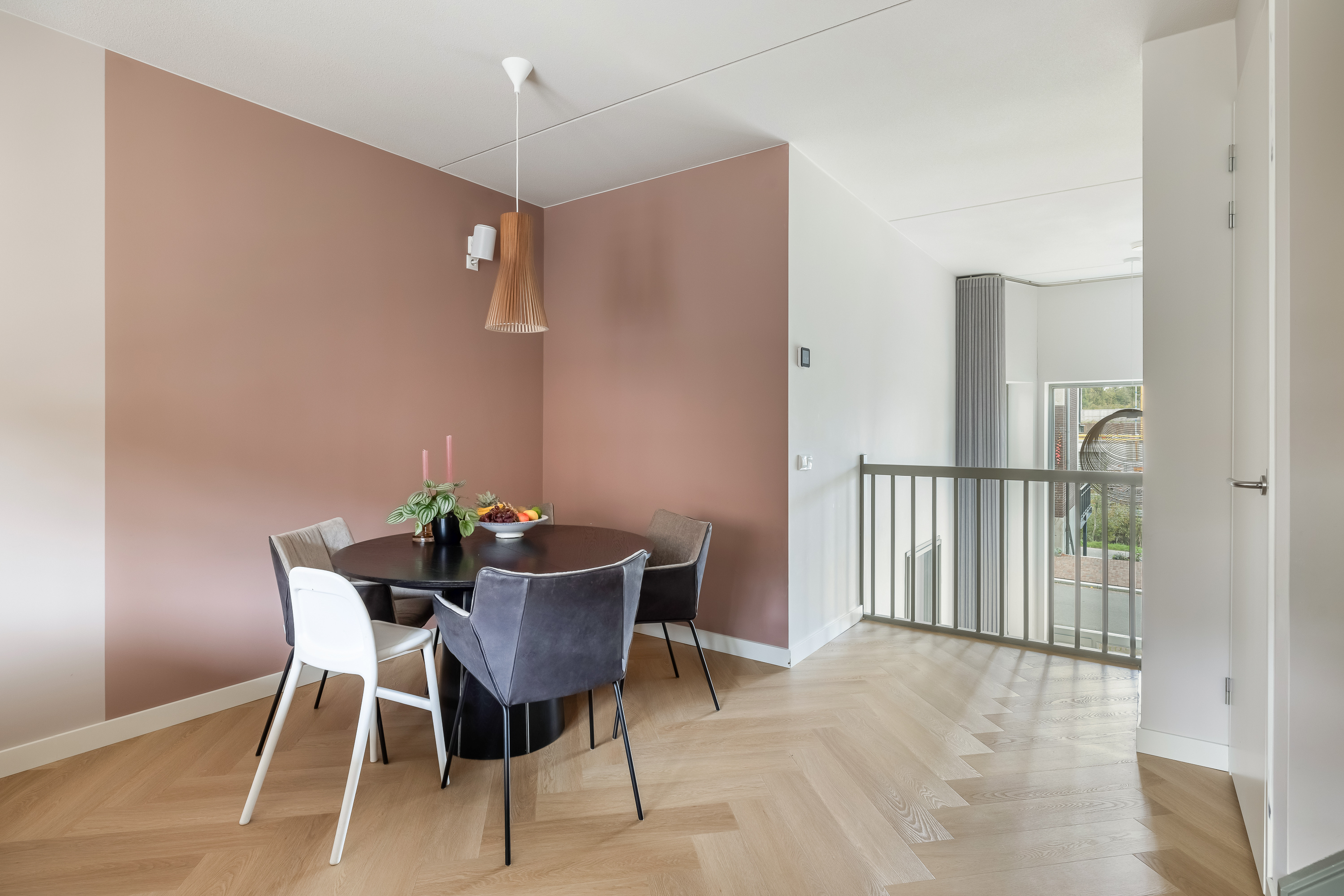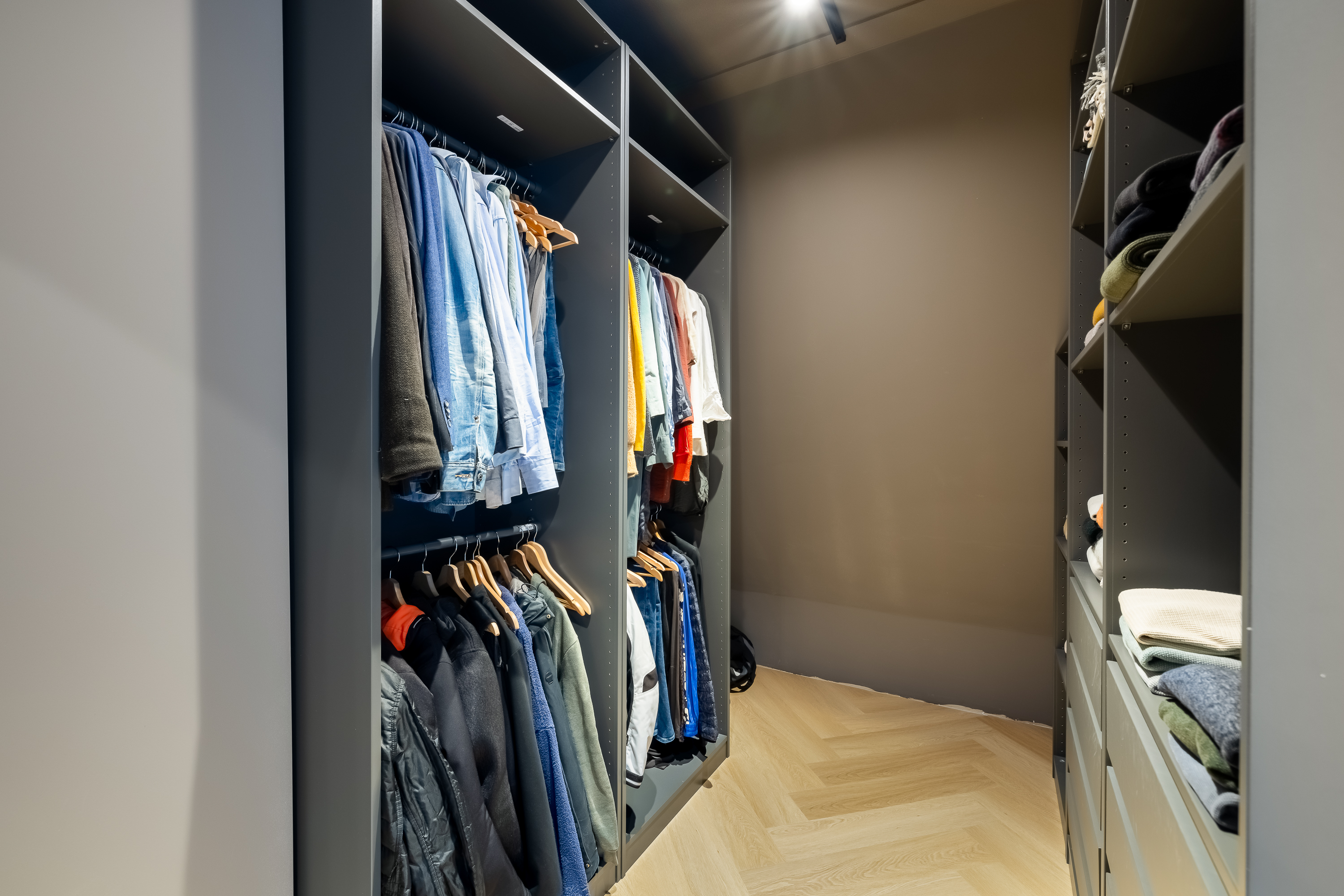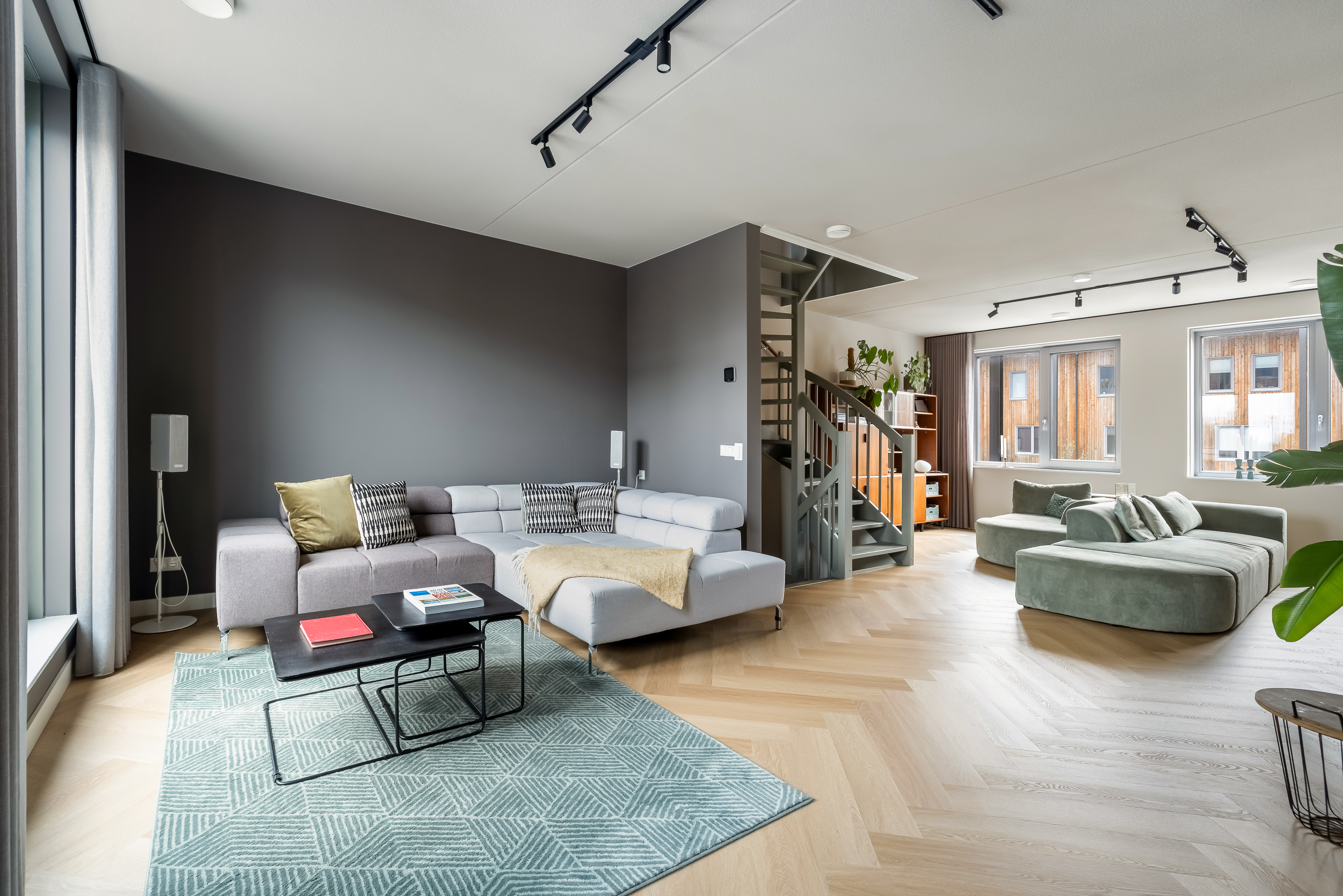 De woning is tot in detail ontworpen. Warm, luxe en eigentijds, zonder koel of afstandelijk te worden. De maatwerkkeuken is een echte leefkeuken. Kasten tot aan het plafond, mooie materialen en goede inbouwapparatuur die met wifi te bedienen is. Je zet de oven alvast aan onderweg naar huis, laat de broodjes bakken voordat je beneden komt en schuift daarna meteen aan om samen te eten. Alles is strak uitgelijnd, nergens standaard, alles klopt. Dit is een huis voor mensen die oog hebben voor detail.