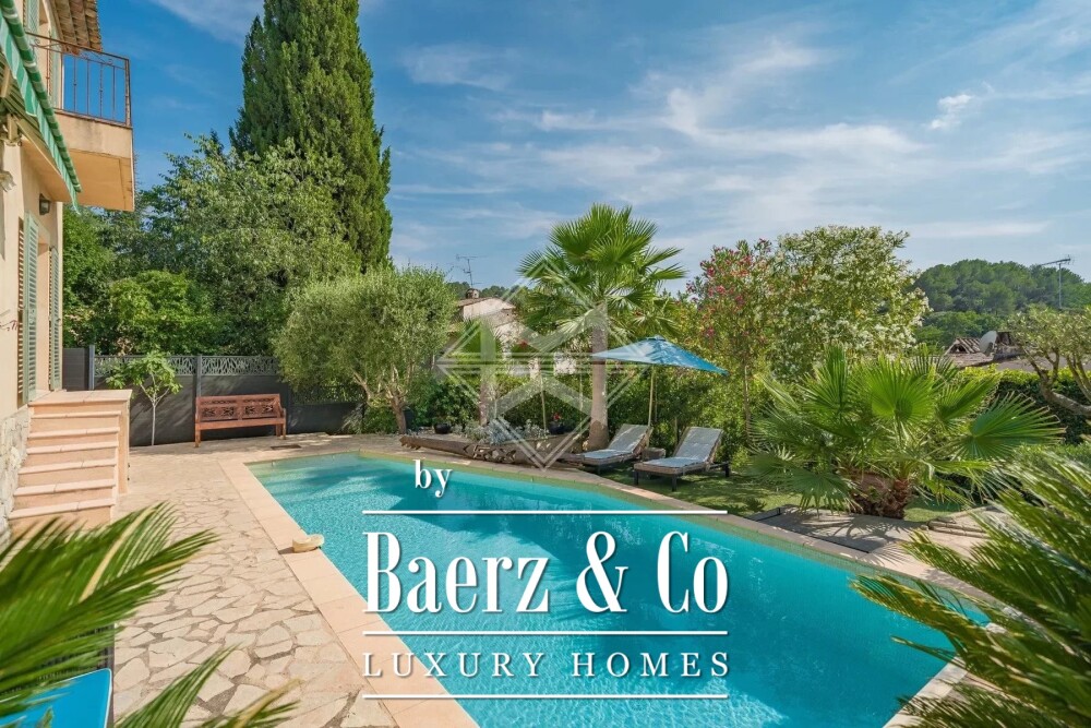 There are four bedrooms in total, including a master suite with dressing room and full bathroom, a second suite and two further bedrooms that share a shower room. A thoughtful cellar, elegant convector heating, and amenities such as air-conditioning, intercom, and electric gate nurture privacy and ease. The swimming pool is set within the 666m2 plot, offering both seclusion and open views. This villa Valbonne represents a rare opportunity to experience village living with comfort, light, and discretion.